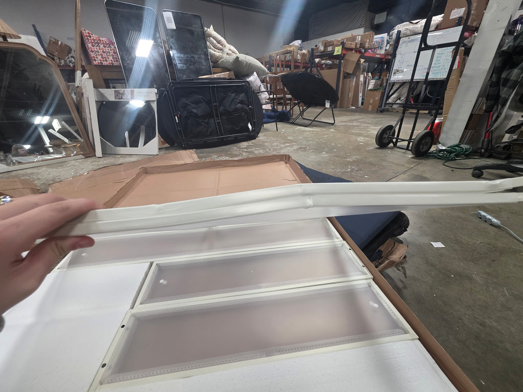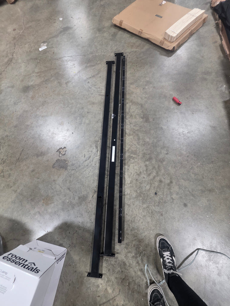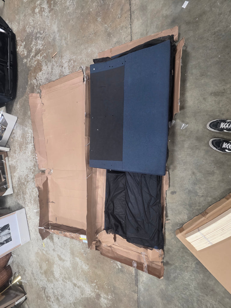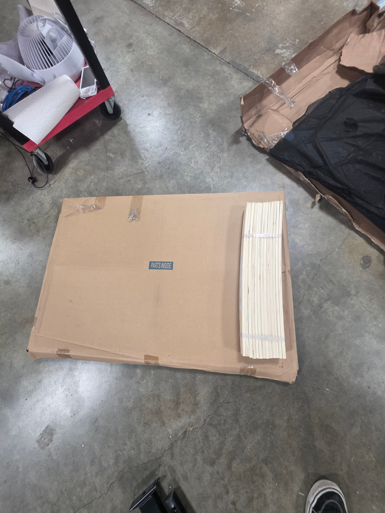 Note: Missing directions and hardware. Does seem to have all of the pieces necessary for assembly. One of the edges on the backrest and the side is dirty from the box being open. Drawer bottoms are slightly bent. See pictures for more details.