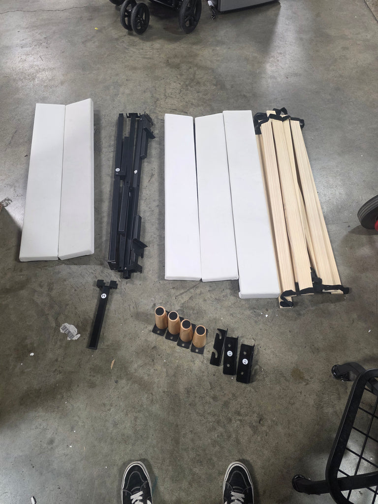 Note: The headboard has a mark on the top right corner. Some of the side boards have some light dust marks. No directions included. One of the slat boards is broken. See pictures for more details.