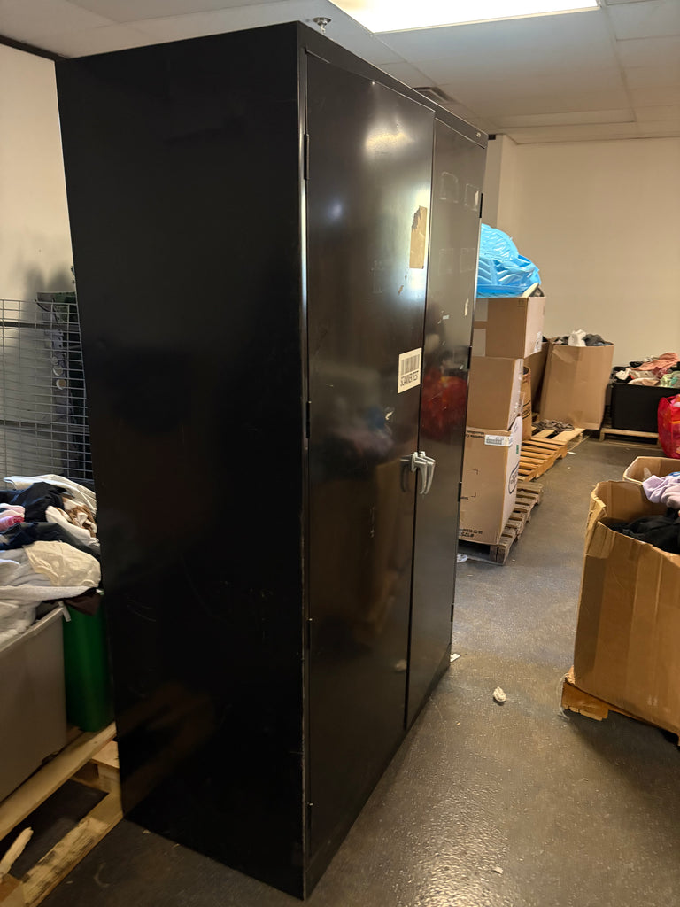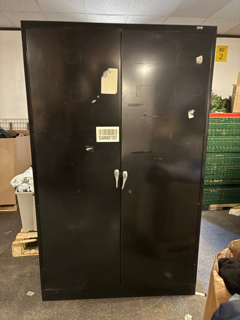 This cabinet is heavily used. Doors close but do not come with keys. Has warehouse dust and stickers attached. See in house photos for details.