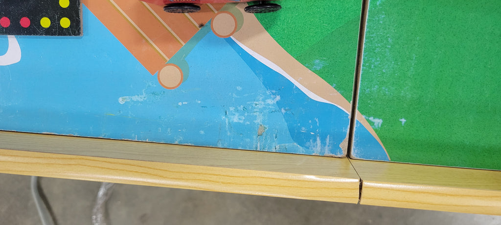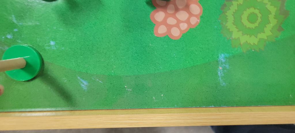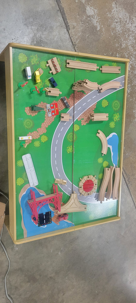 Note: Missing pieces, does not include the instructions or list of parts. There's scratches and damage on the toys and the table itself. One of the boards doesn't lay flat. Missing the drawer assembly. See pictures for details.