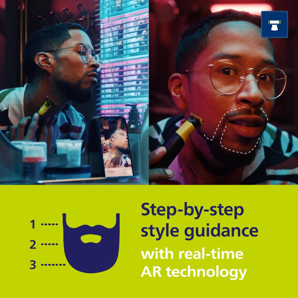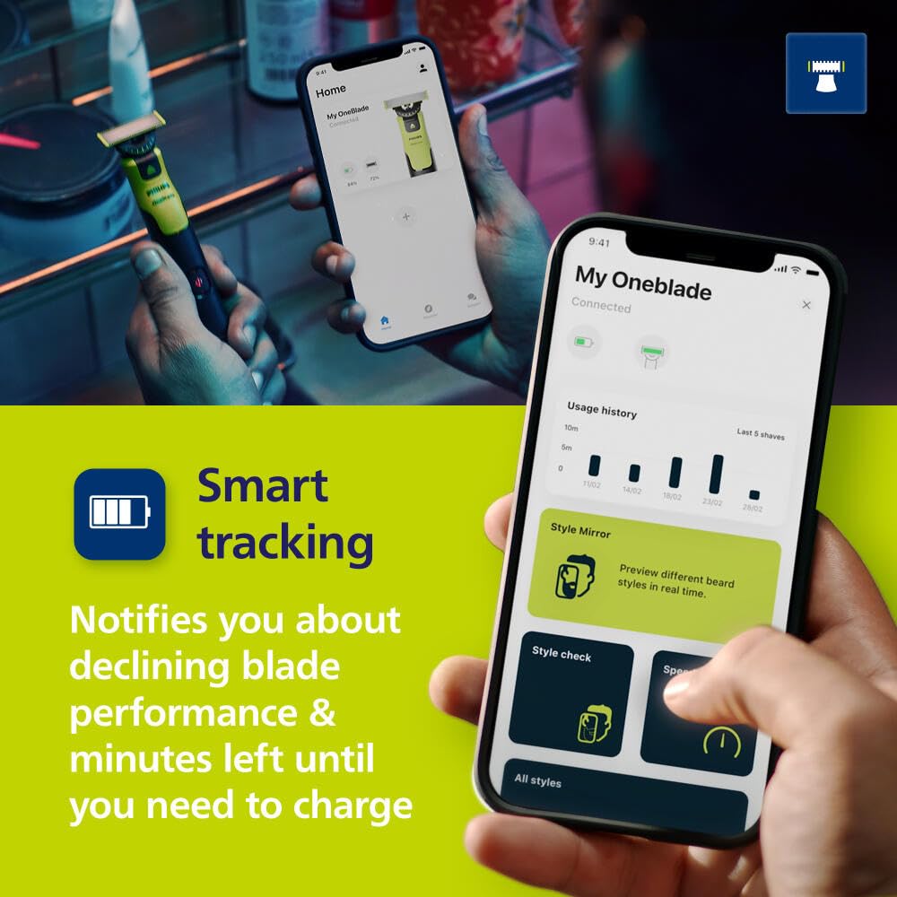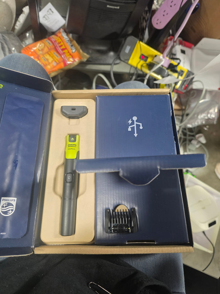 Missing green shave guards and smaller blade. Also missing charger. Charger and replacement blades can be purchased here: https://www.amazon.com/Philips-OneBlade-Replacement-Blade-QP220/dp/B00T5AVD0C/
