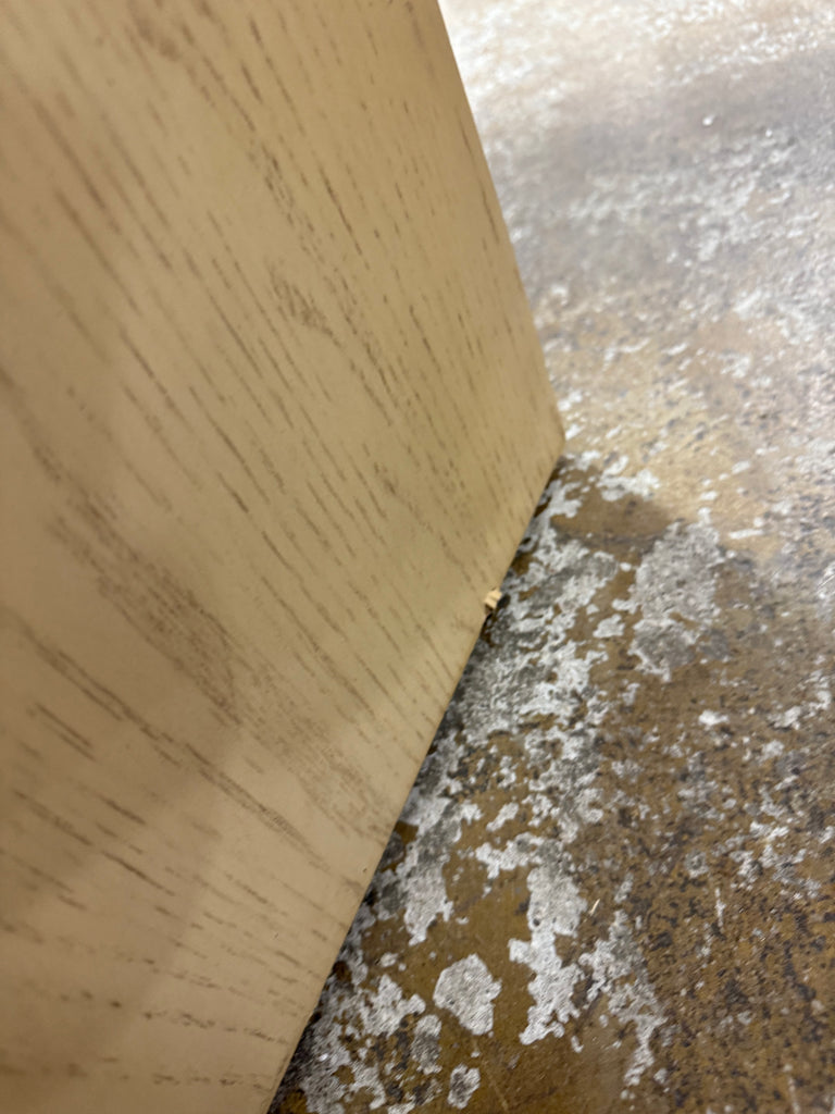 Note: This is missing the drawer piece, has stickers on surface, has some imperfections to bottom, also wobles, see photos