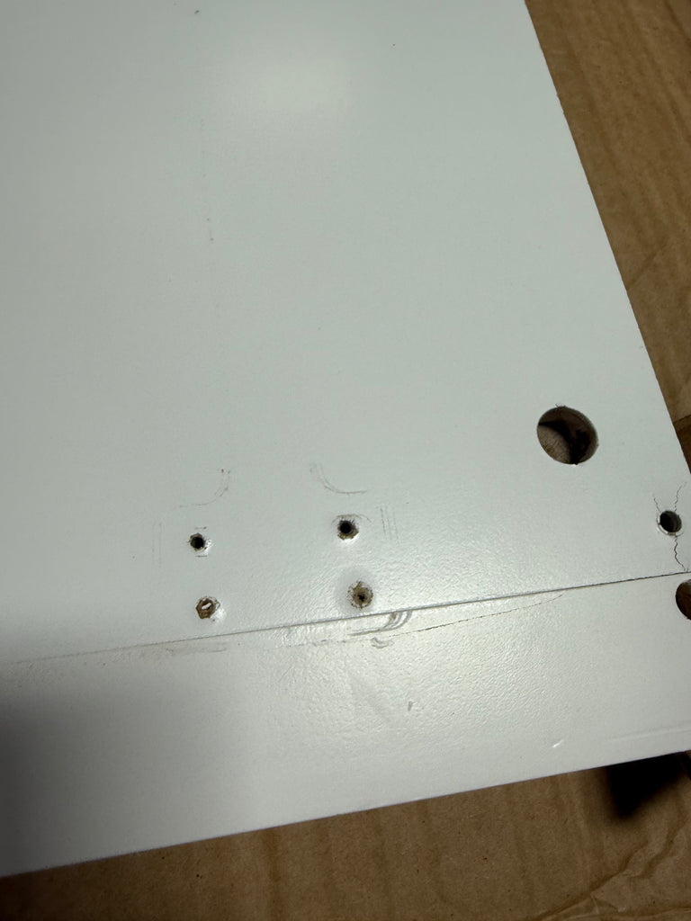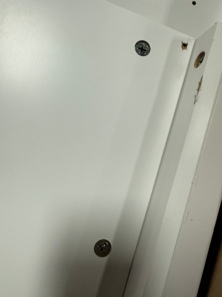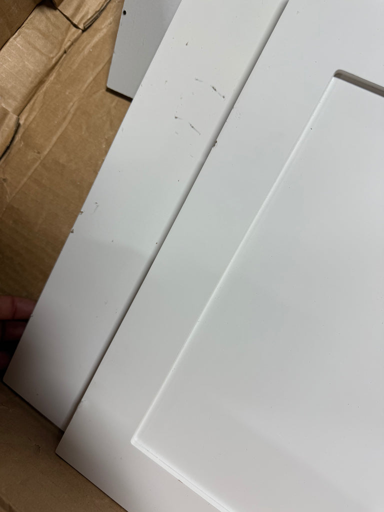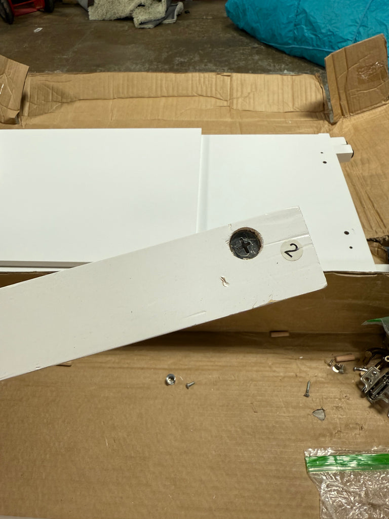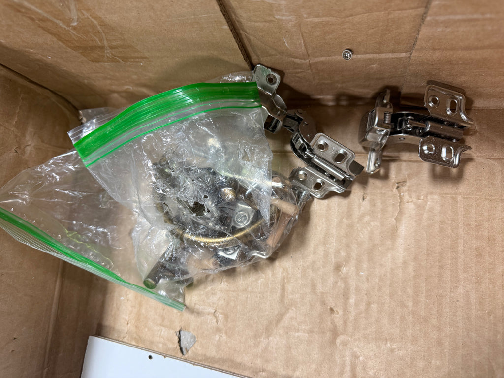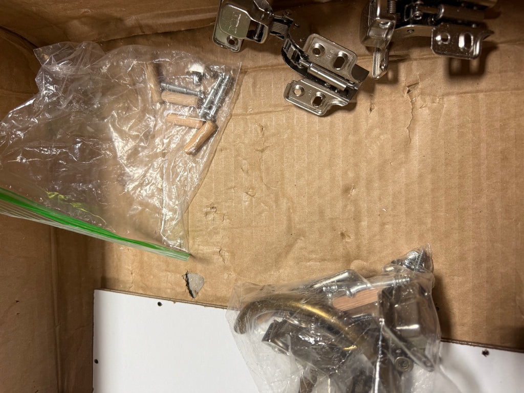 Note: Cabinet pieces has scuffs all over but can be painted over, has some hardware already installed, has chips, hardware not in packaging, customer may have to purchase extra, see photos