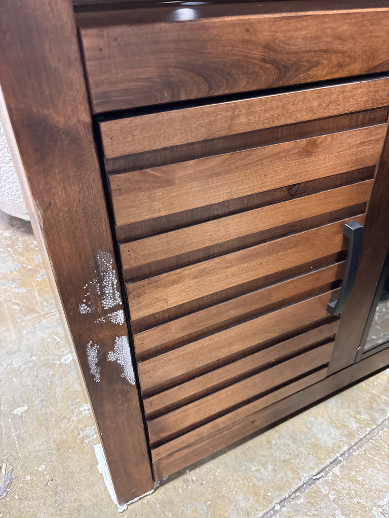 Note: For TVs up to 90 inches. Finish seems a bit lighter in person. Comes with control remote. Item has some paint stains and damages. See pictures for details.