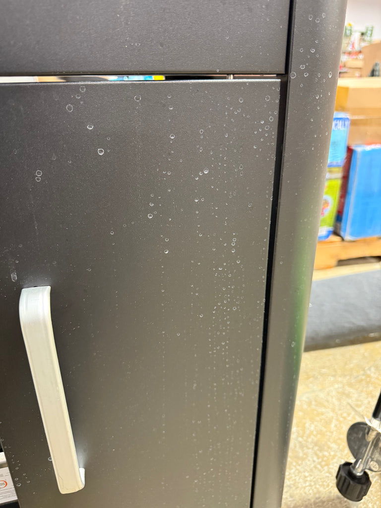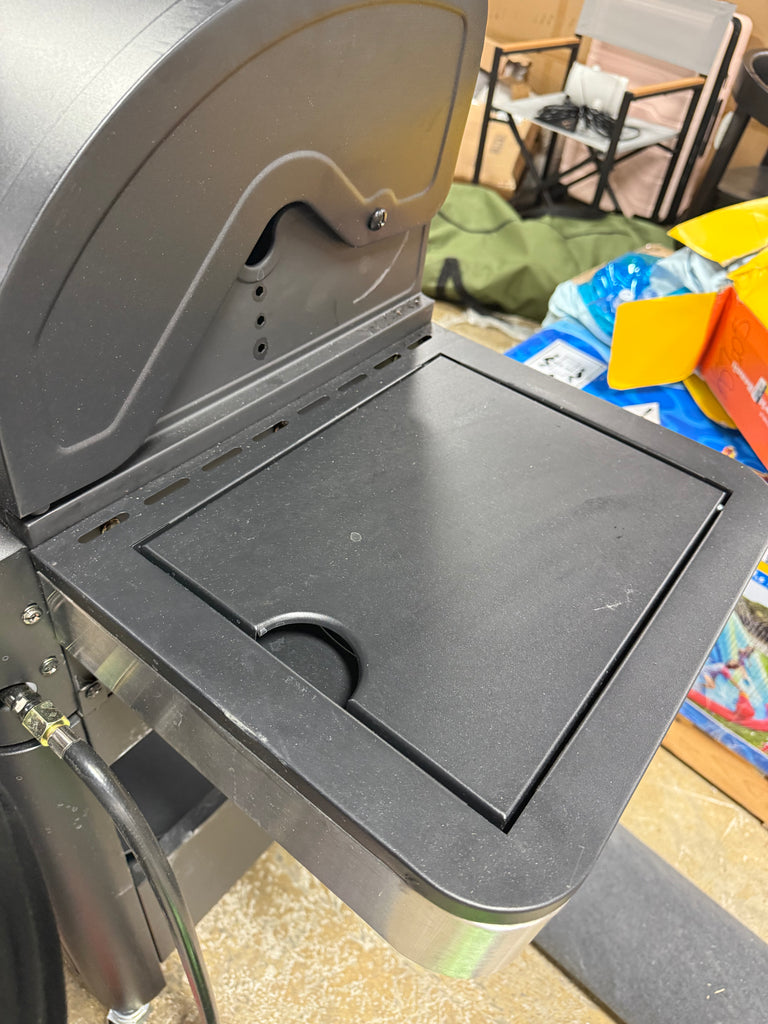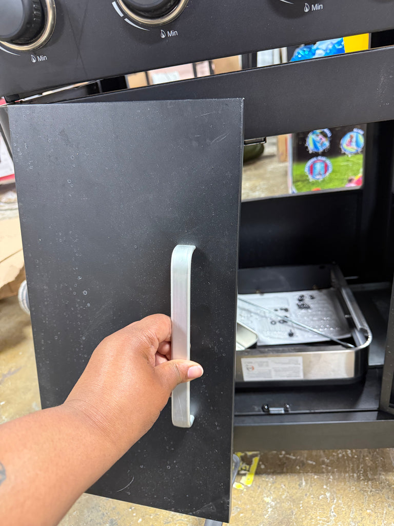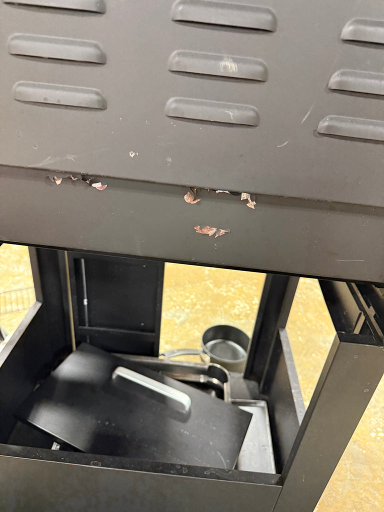 Note: Grill shows signs of use, second shelf needs attatched, doesn't have a top, has grease/oil residue to racks, has dents and scuffed paint, also has water marks, door needs attatched, doesn't include all hardware, see in house photos
