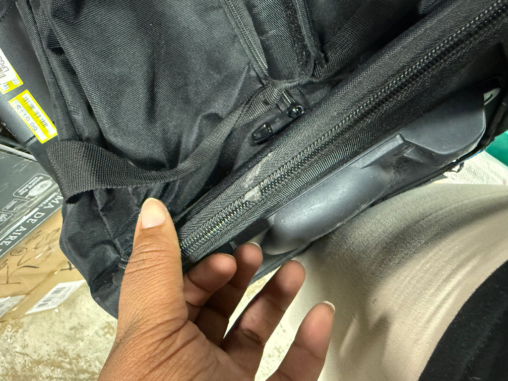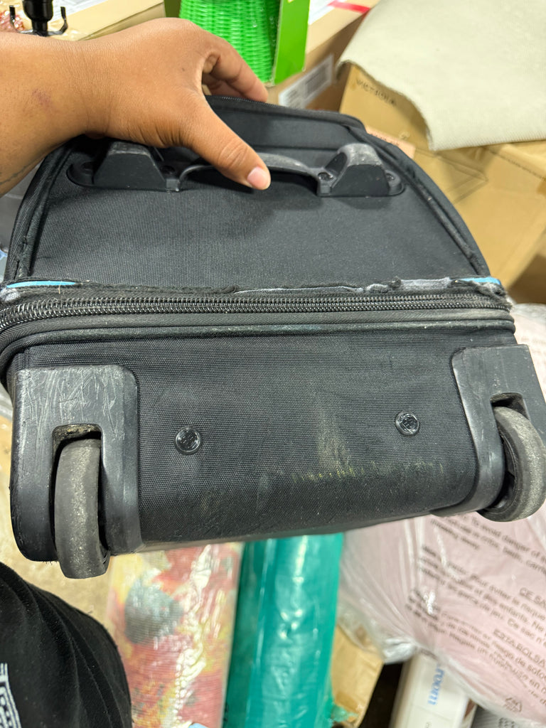 Note: Has a worn look to bottom of bag by wheels, has heavy scuffs and scratches and stretched fabric, see photos