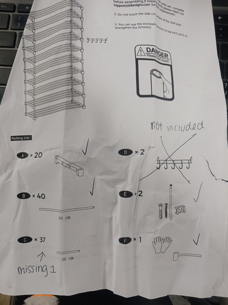 Note: AS IS: This shoe storage has 4 metal poles that are all slightly bent. The hook pieces are not included. There is one small connector piece missing. See photos provided.