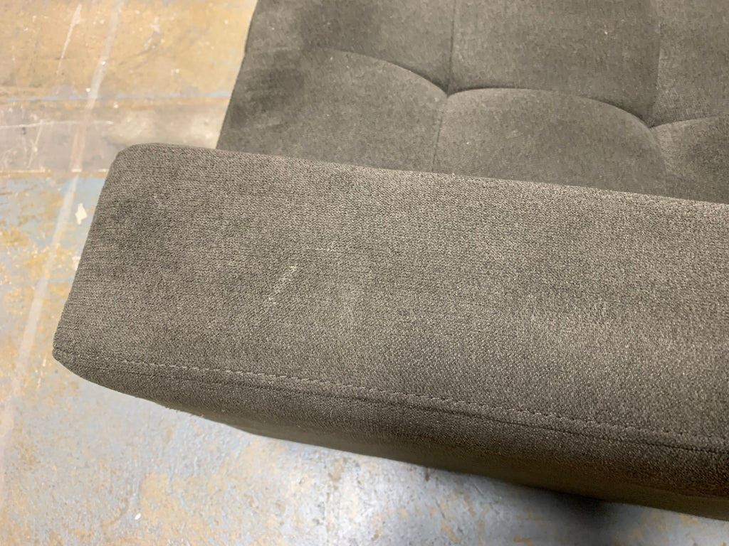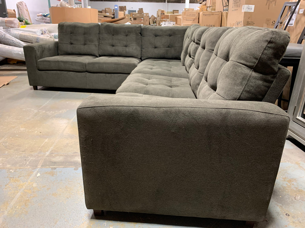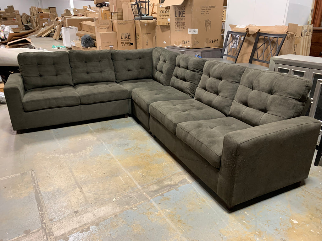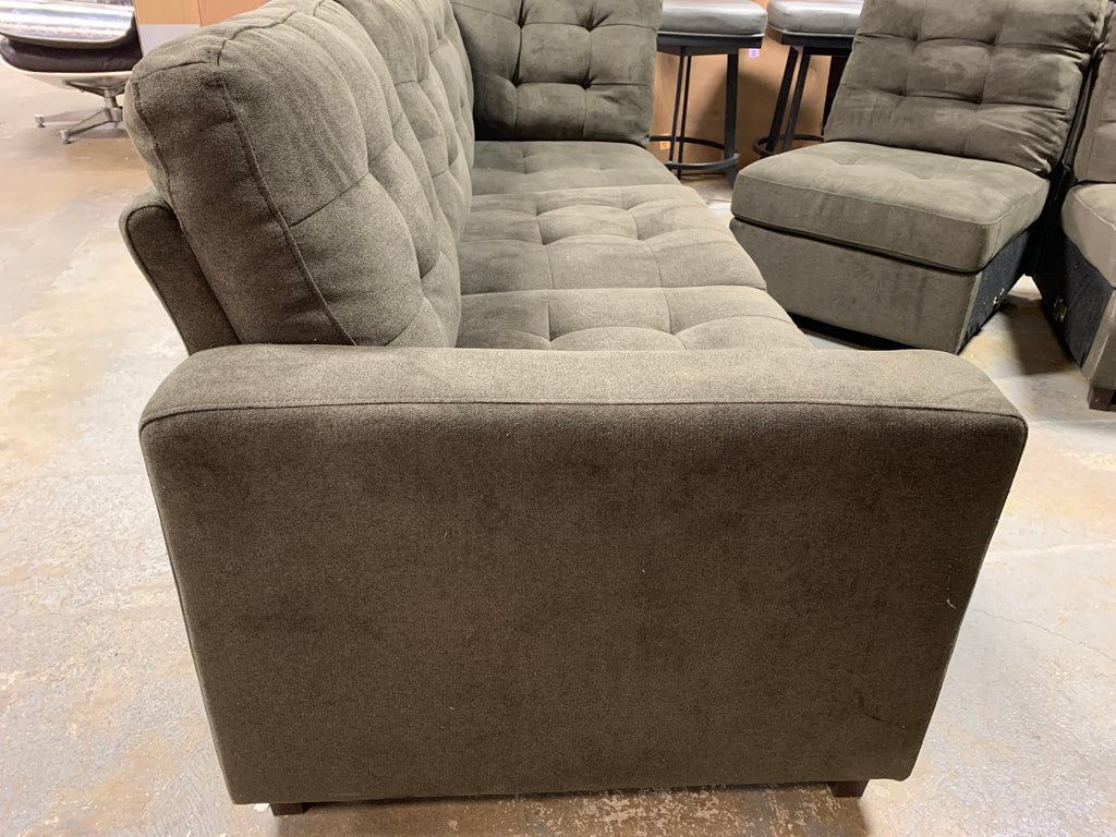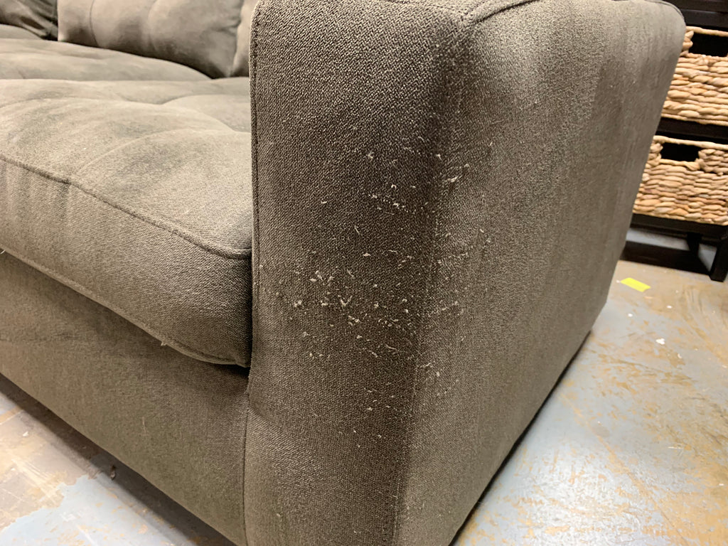This sectional is in good condition. Shows some signs of wear/pilling - shown in photos. All but two legs match, but are the same height. All pieces detach, four pieces total. Please see all photos and the link below for more details. Please note height dimensions as well.