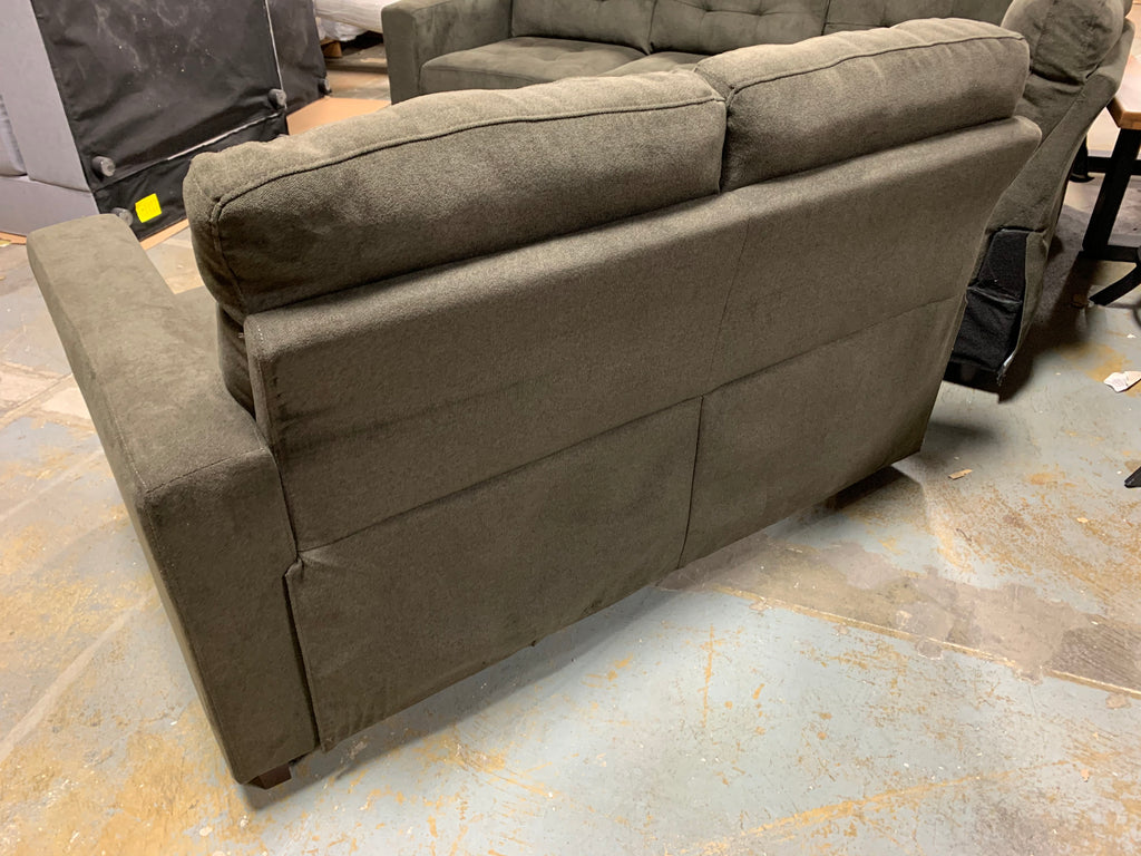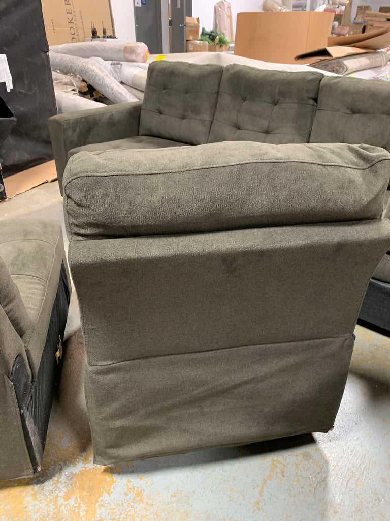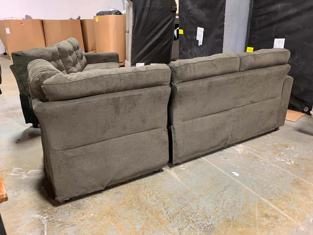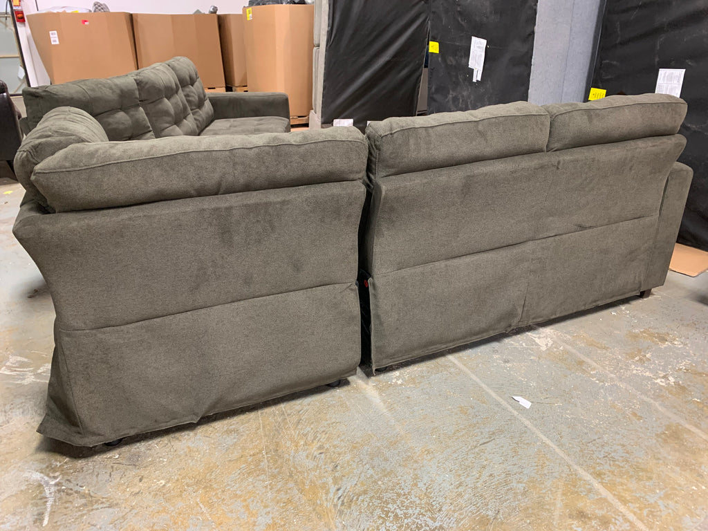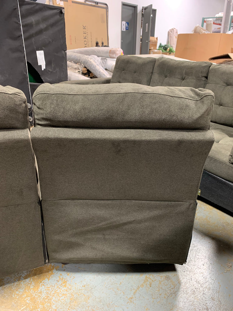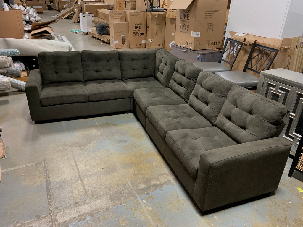 This sectional is in good condition. Shows some signs of wear/pilling - shown in photos. All but two legs match, but are the same height. All pieces detach, four pieces total. Please see all photos and the link below for more details. Please note height dimensions as well.