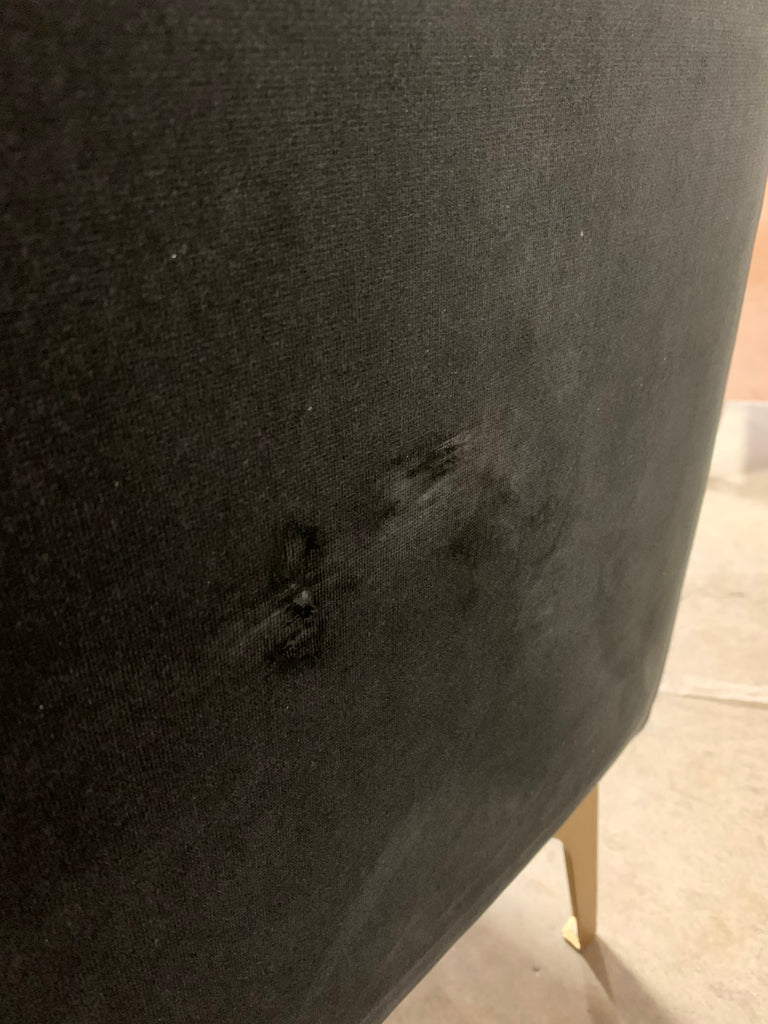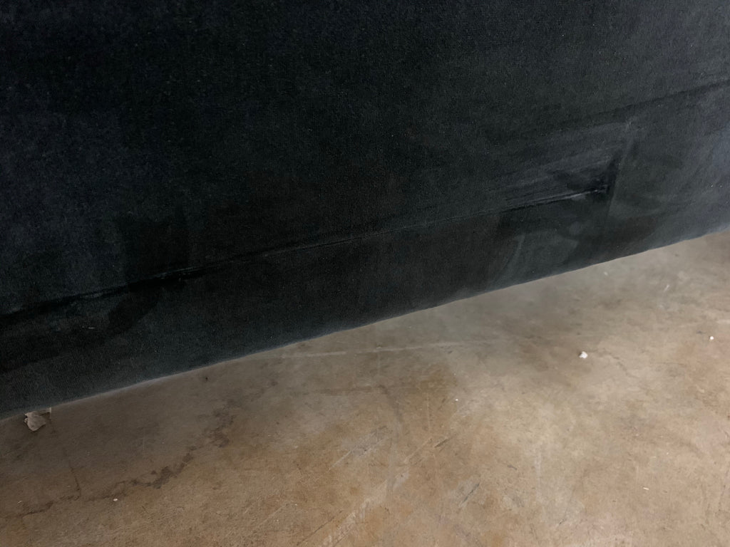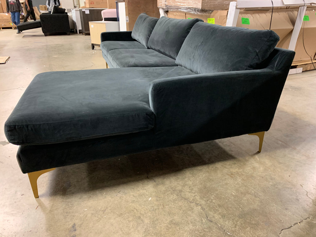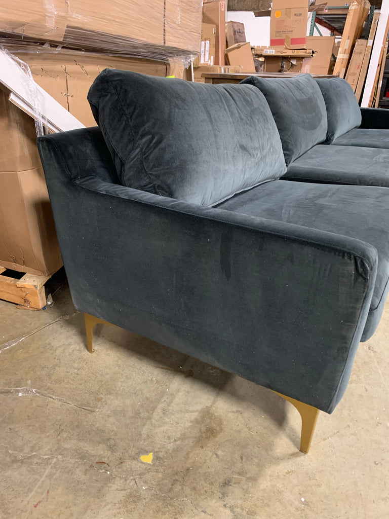 Sectional is out of box. A few things to mention: hinges that connect the two pieces do not line up. The velvet is crushed in a few place (mostly on back) - please see all photos.