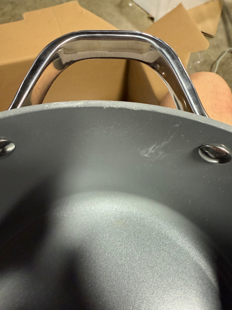 Note: One of the pots has a few chips and one of the pans has a scuff on the bottom that is smaller than a penny. There are also no pot protectors included.