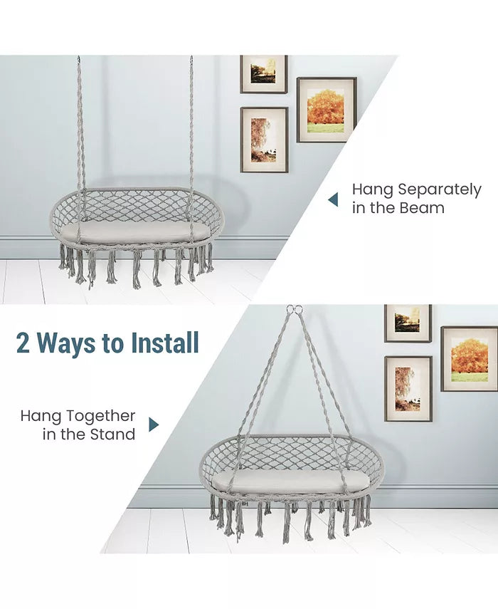 2 Person Hanging Hammock Chair w/ Cushion Macrame Swing 330 lbs Capacity Grey