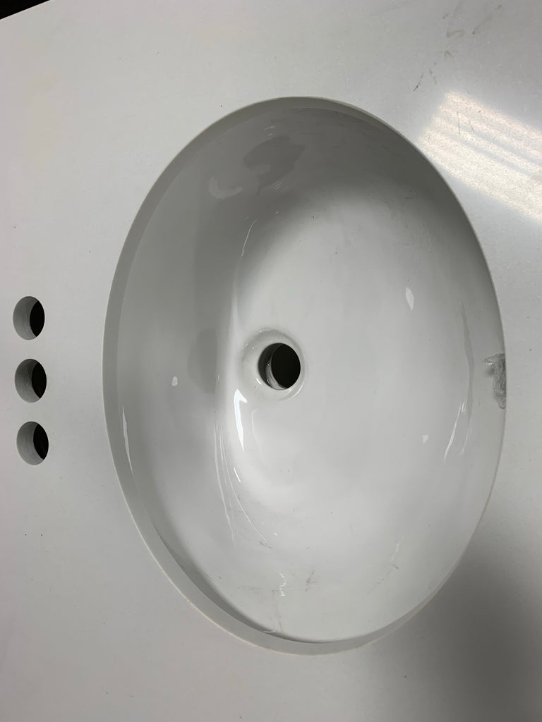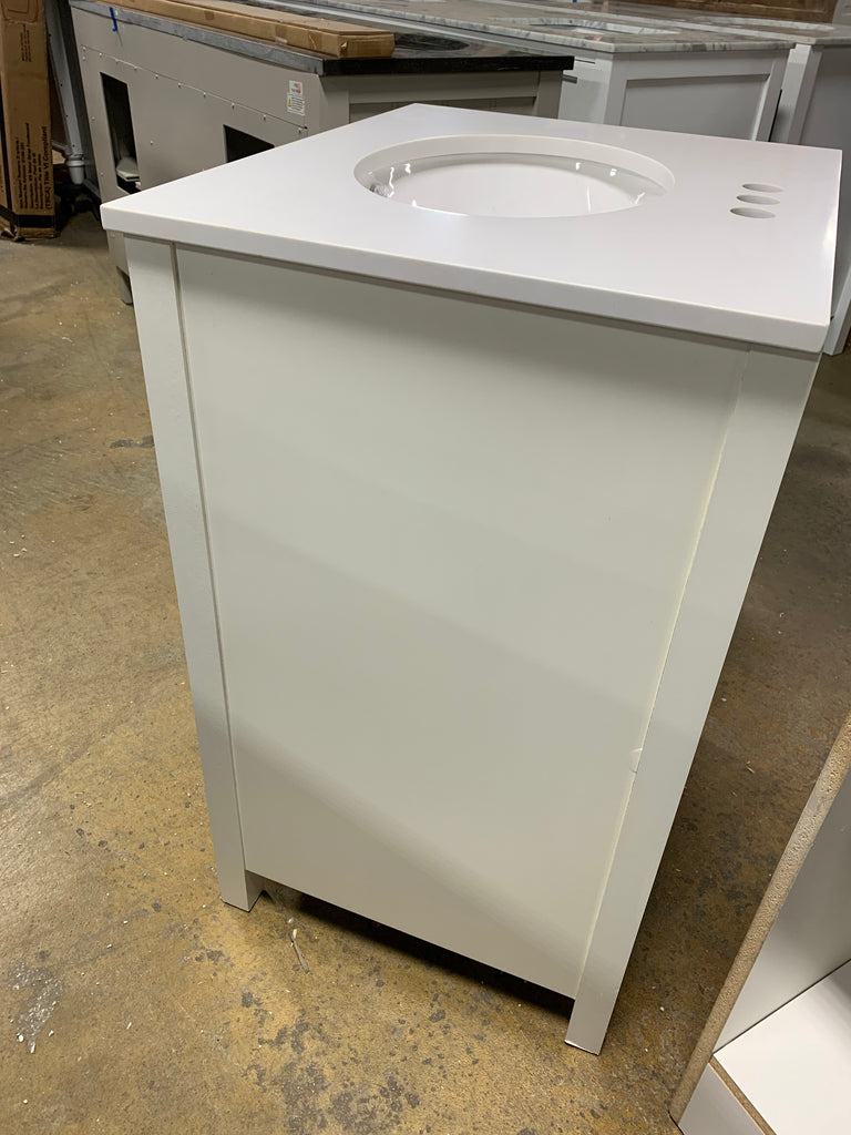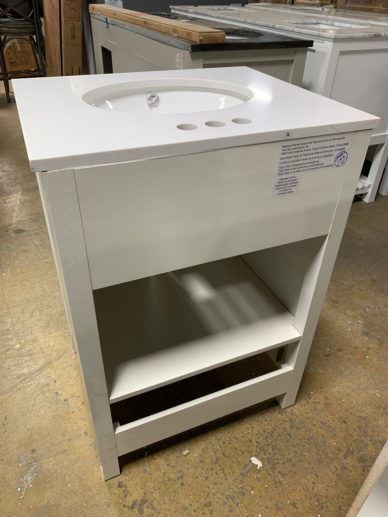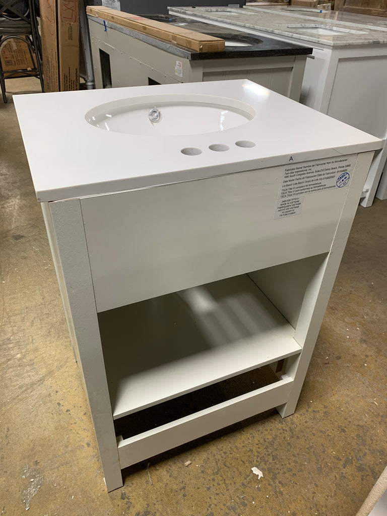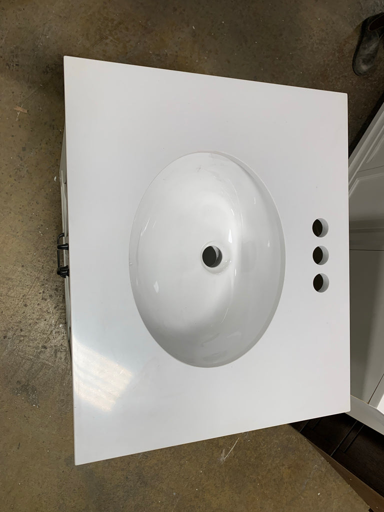 This vanity is in good condition.The countertop is not attached, but there are no cracks. Cabinet opens and soft closes. Backsplash included. Drawer opens and closes properly. Please see all photos for more details.