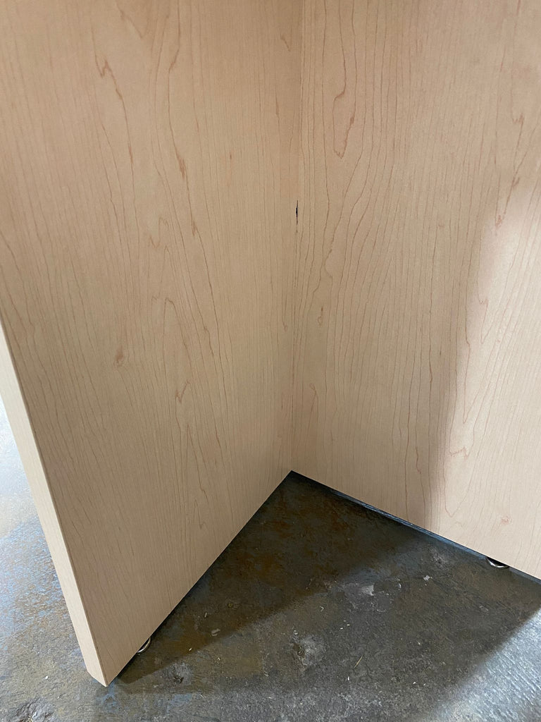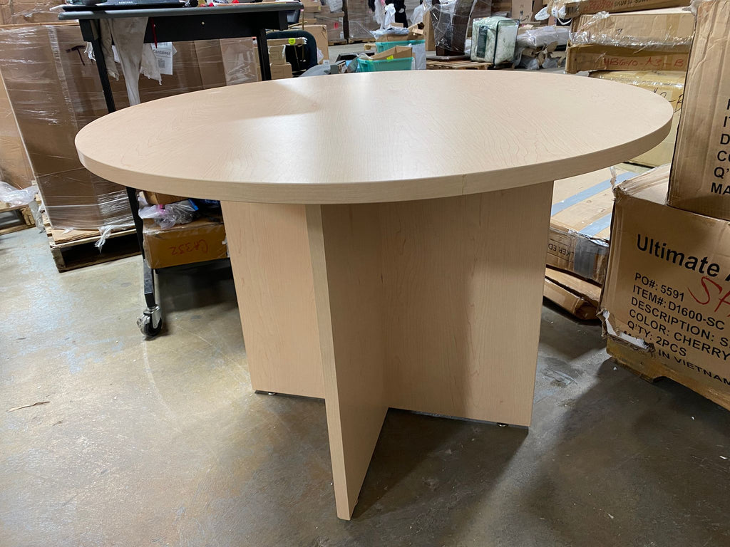 Out of Box, The color is maple, Size: 29"H x 42"L x 42"W, The tabletop is not attached to the base. There is a small chip in the top of the table. Please see in-house photos for details. Hardware and assembly instructions NOT included.