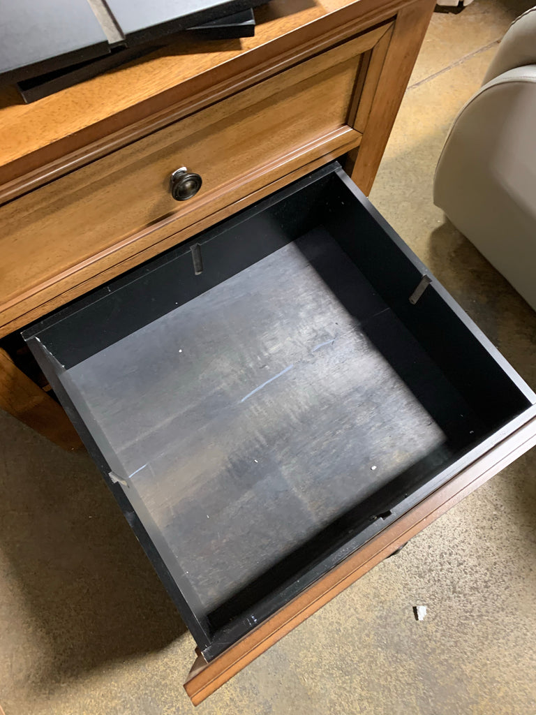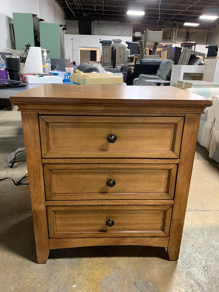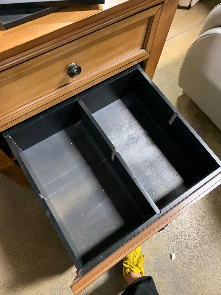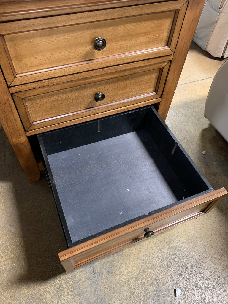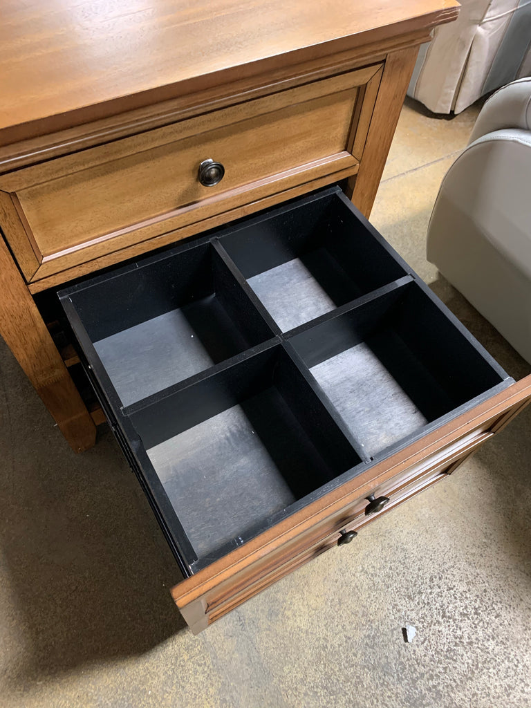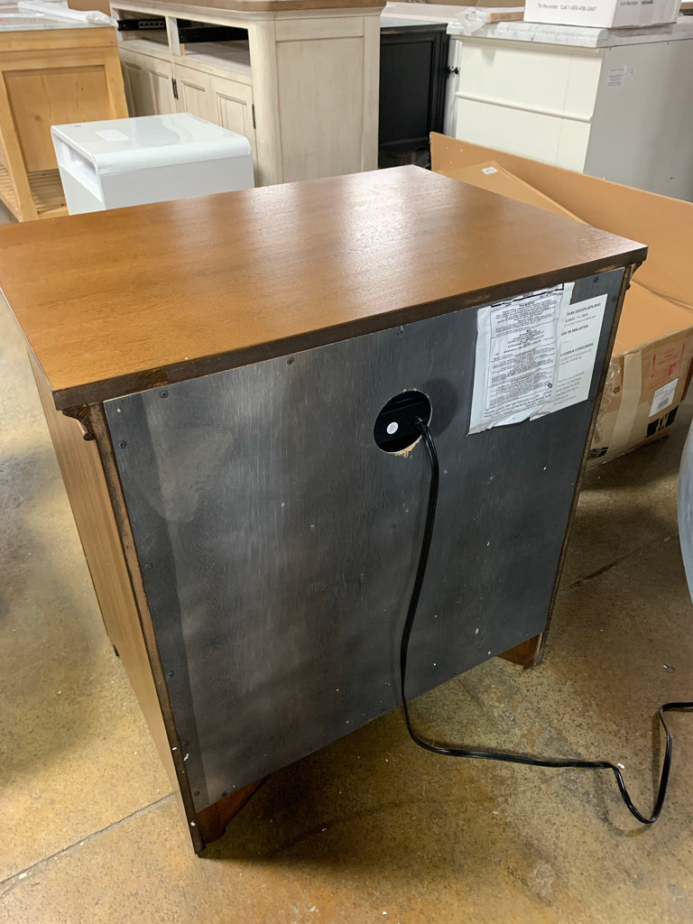 This nightstand is in great condition. The top right corner of the nightstand is bent in a bit - shown in photos. The power outlets and USB have been tested and work properly. Drawer dividers are included for both bottom drawers - shown in photos. Top drawer is felt lined. Please see all photos for more details before purchasing.
