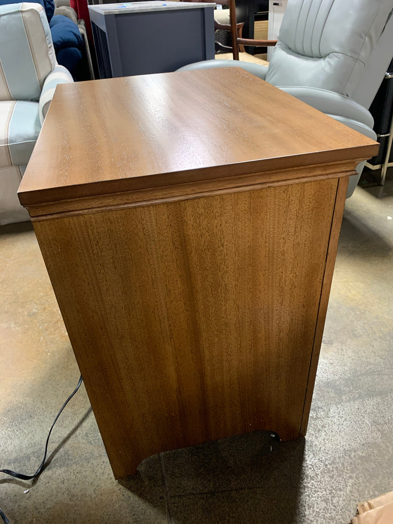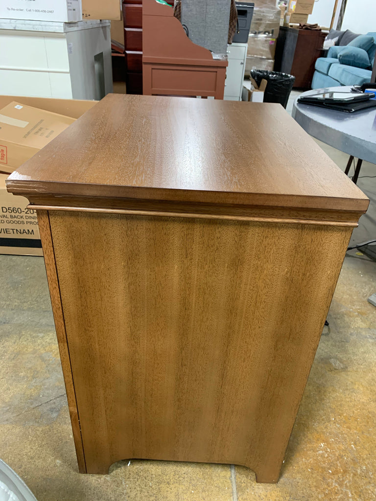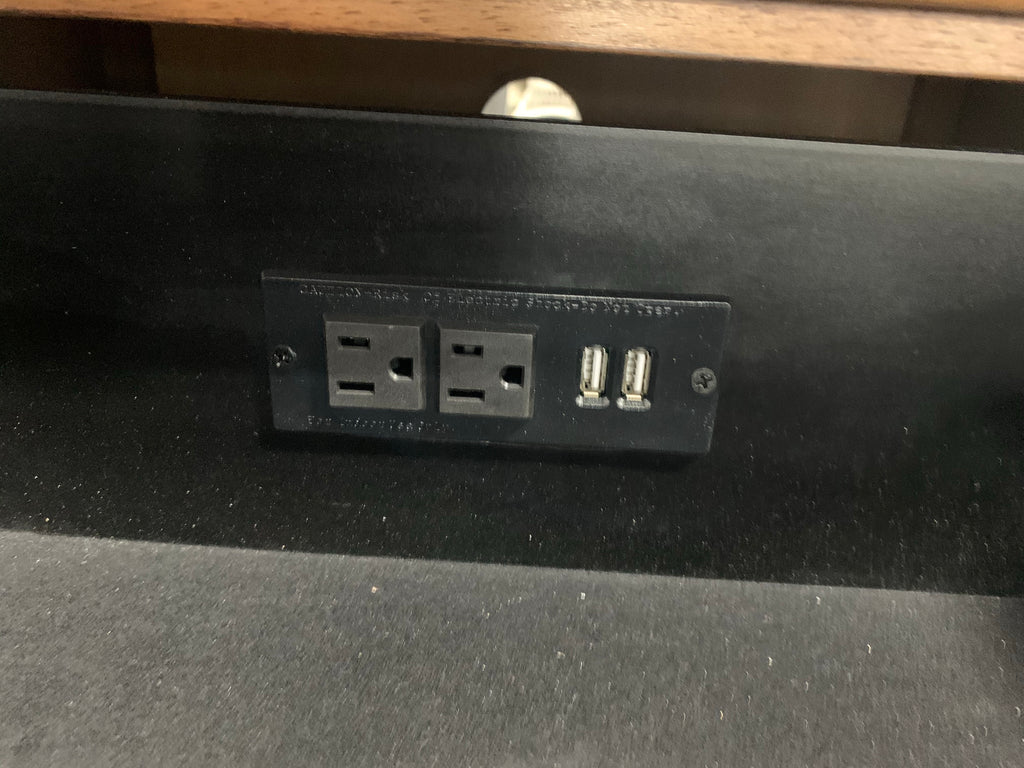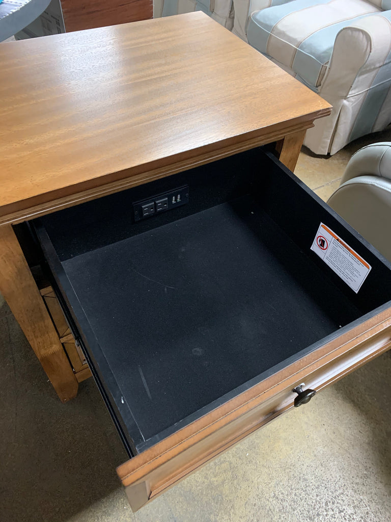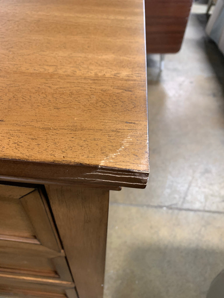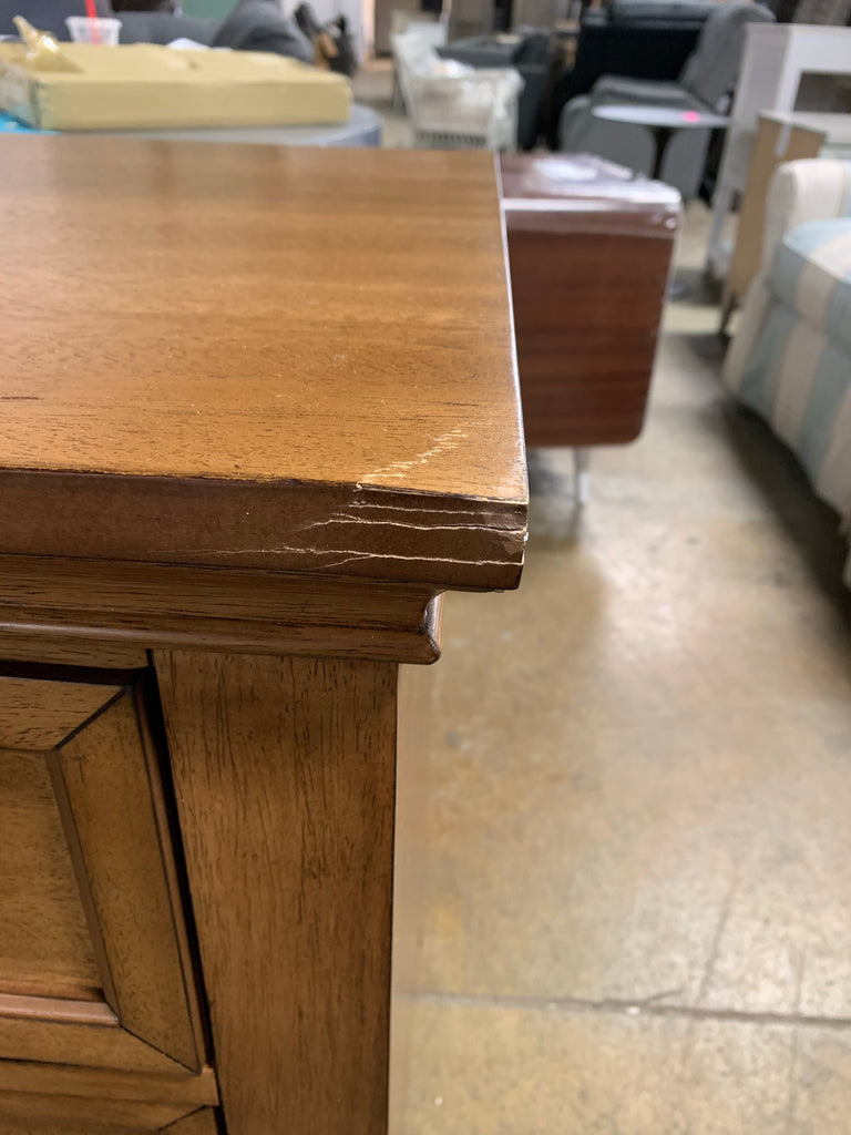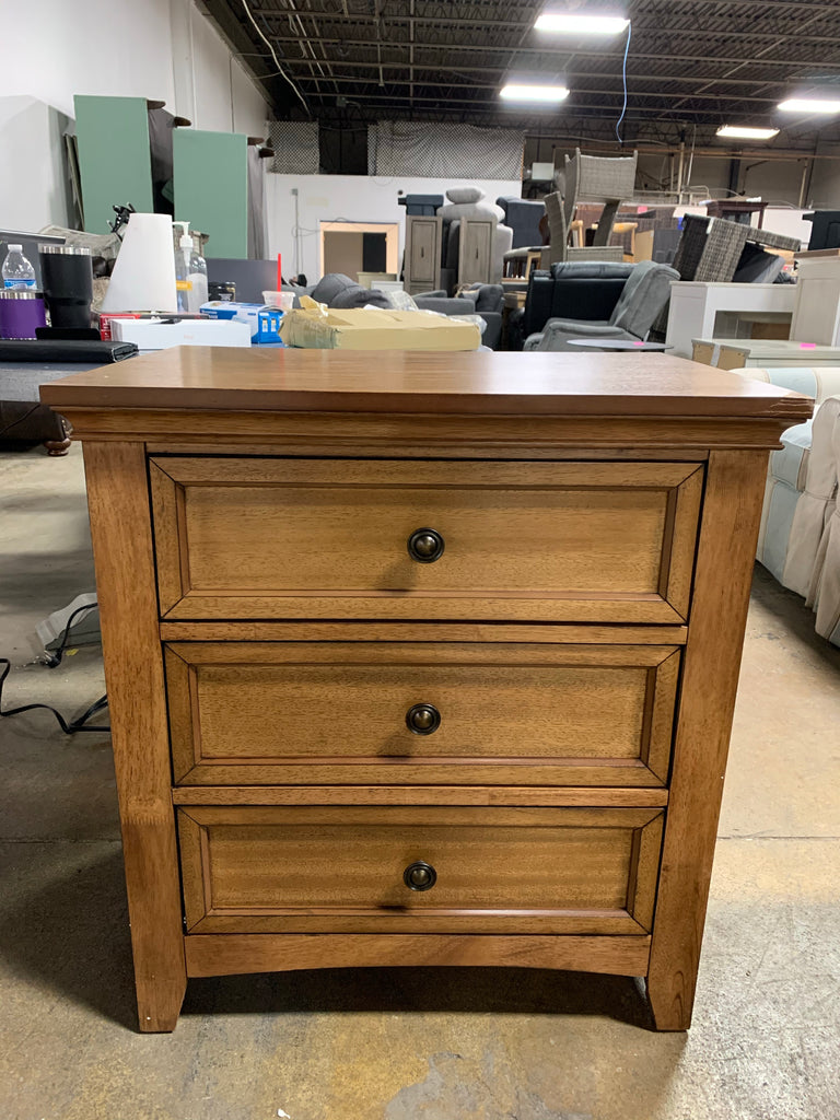 This nightstand is in great condition. The top right corner of the nightstand is bent in a bit - shown in photos. The power outlets and USB have been tested and work properly. Drawer dividers are included for both bottom drawers - shown in photos. Top drawer is felt lined. Please see all photos for more details before purchasing.