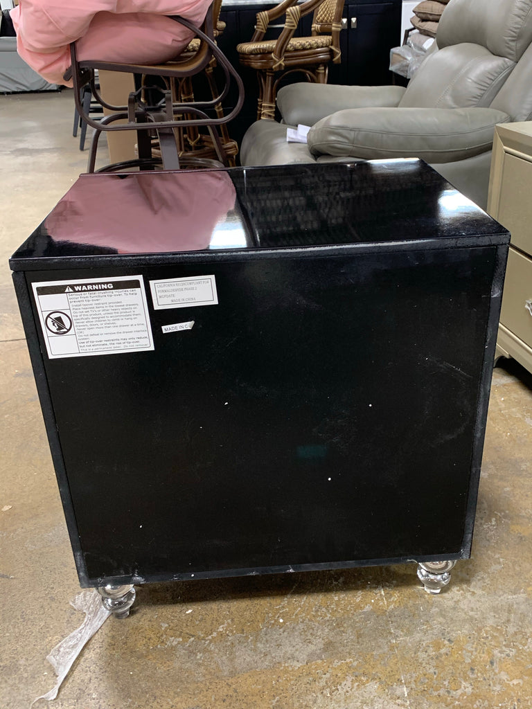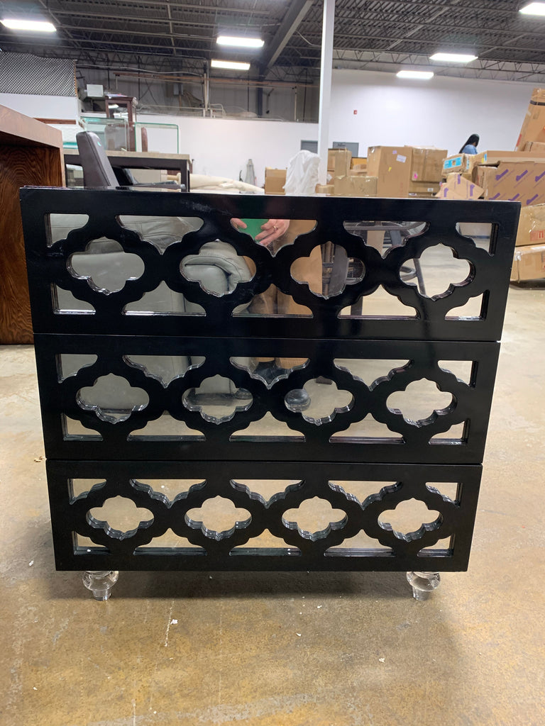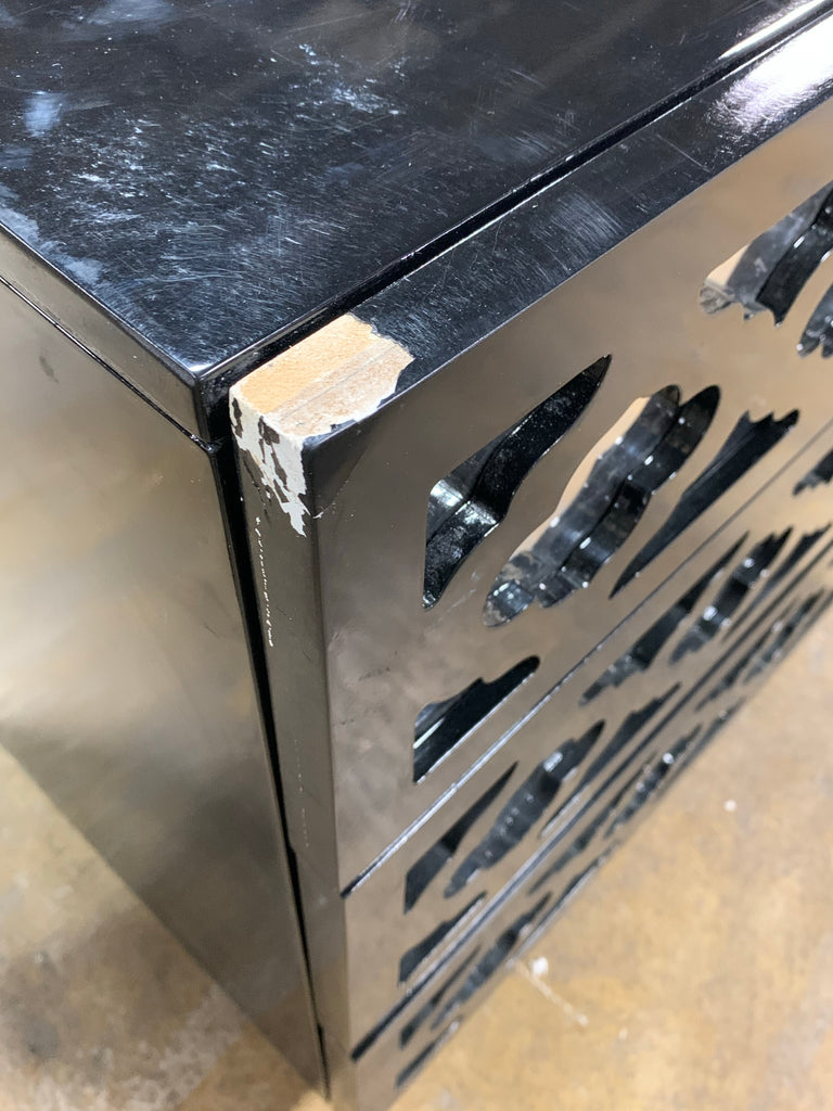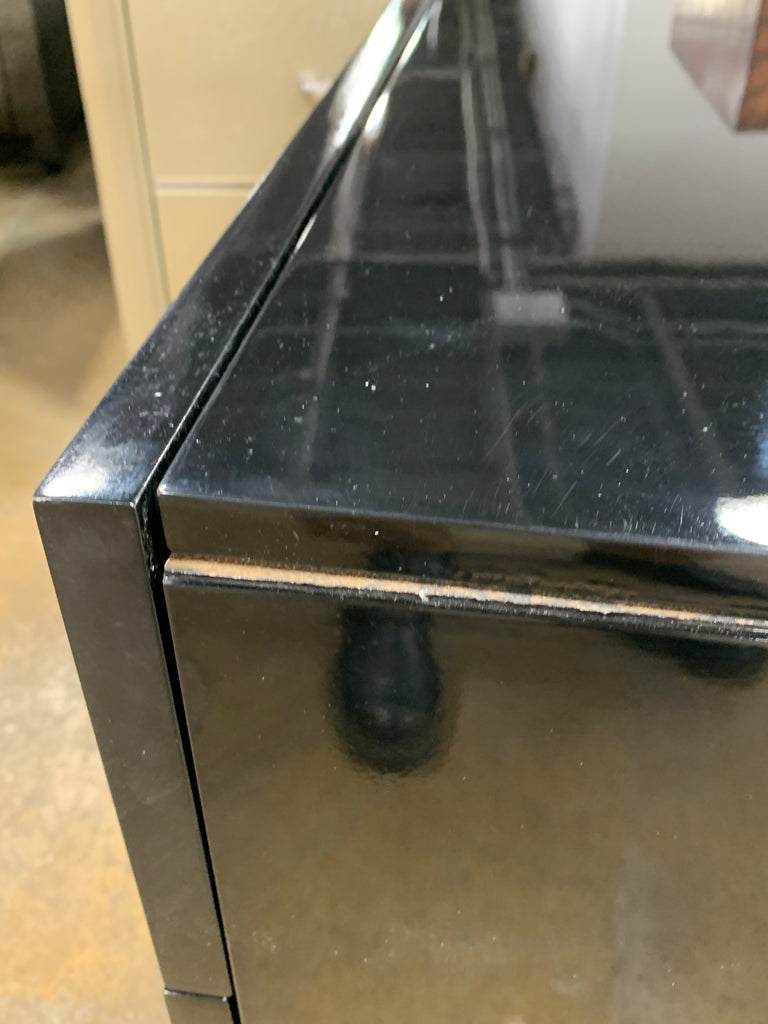 This chest is in good condition. The top left corner is missing paint and the right corner has an imperfection in the wood. Please see all photos for details. All 3 drawers open and close properly.