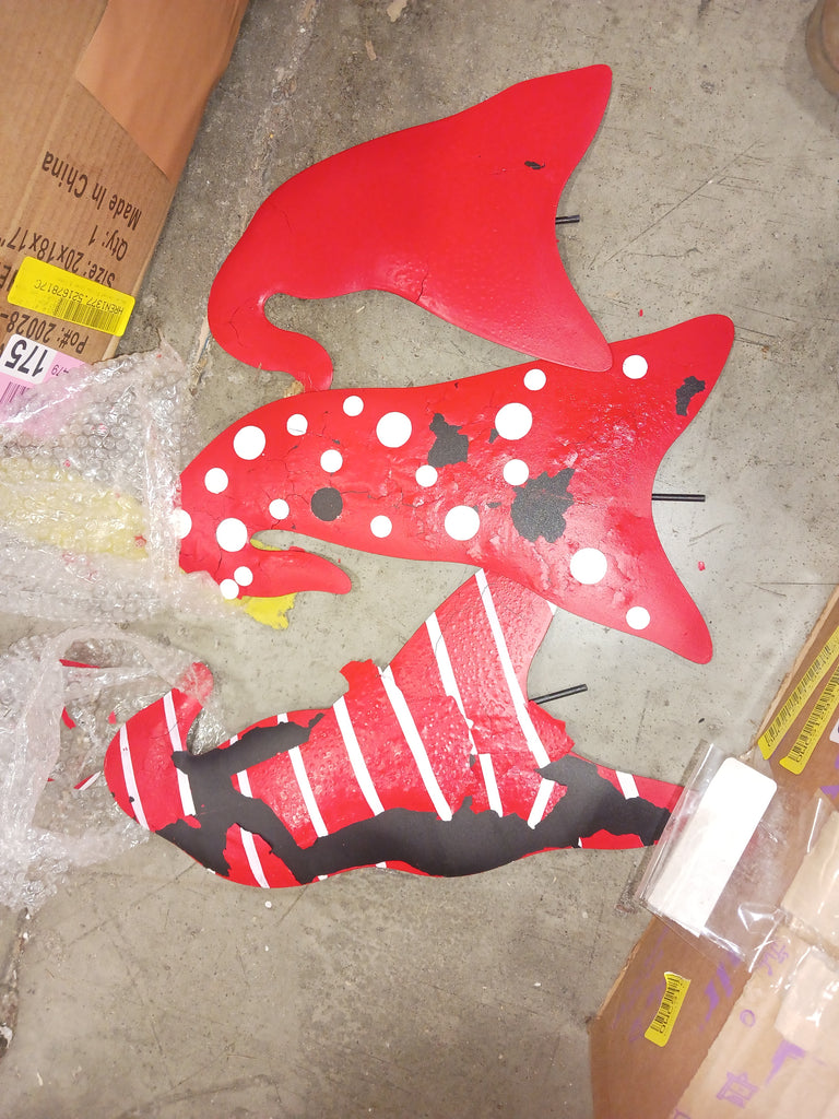 Note: AS IS: These gnomes have a decent amount of chipping and will need to be repainted. There is also 1 stake missing. See photos provided.