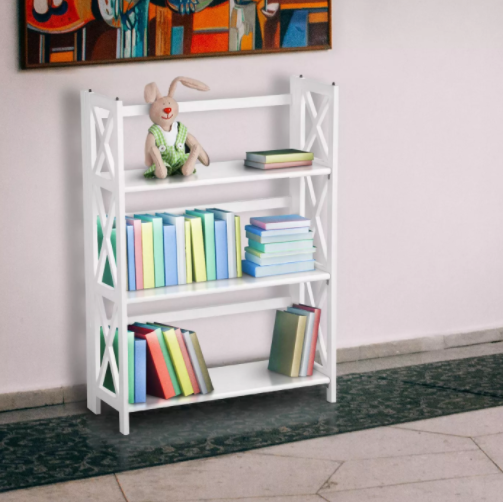 Stackable 3-shelf bookcase with x-design in white. In-box item, requires assembly.
