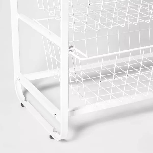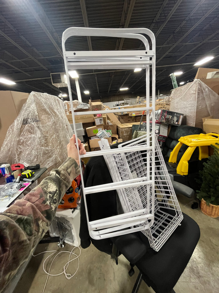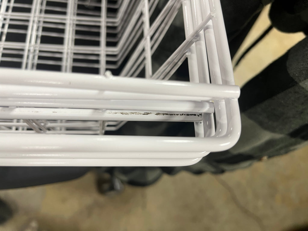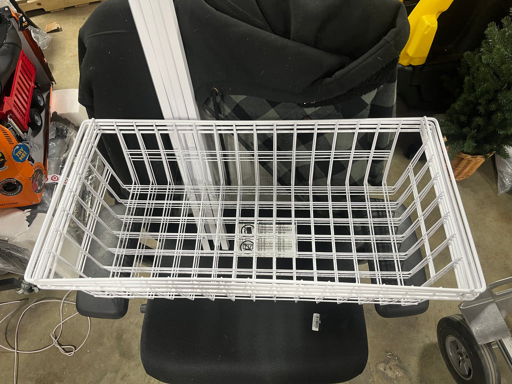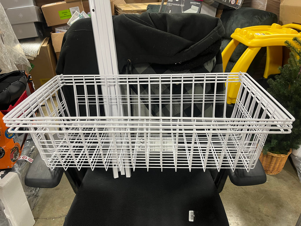 Note: Top board has some dark marks in the top left corner and some light scratching in the middle of the left side. Some of the baskets have some light scuffing on the metal. Missing 2 small nails. See pictures for more details.