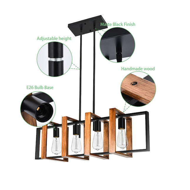 4 -Light Black and Wood Farmhouse Linear Large Hanging Kitchen Island