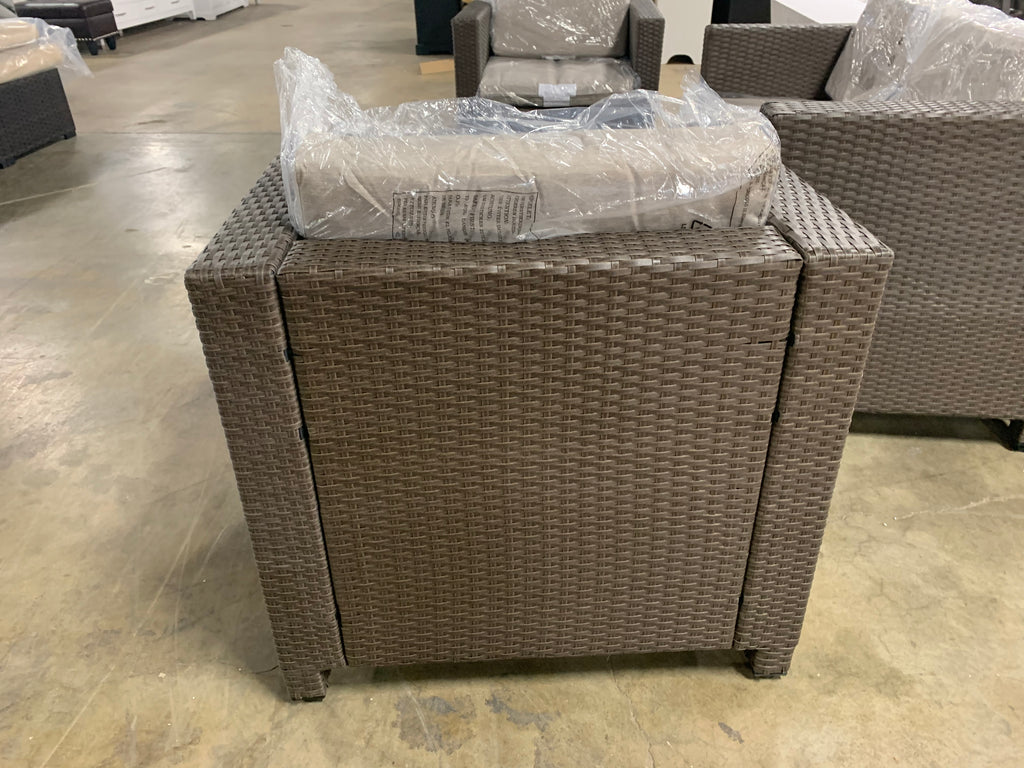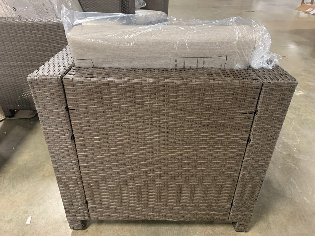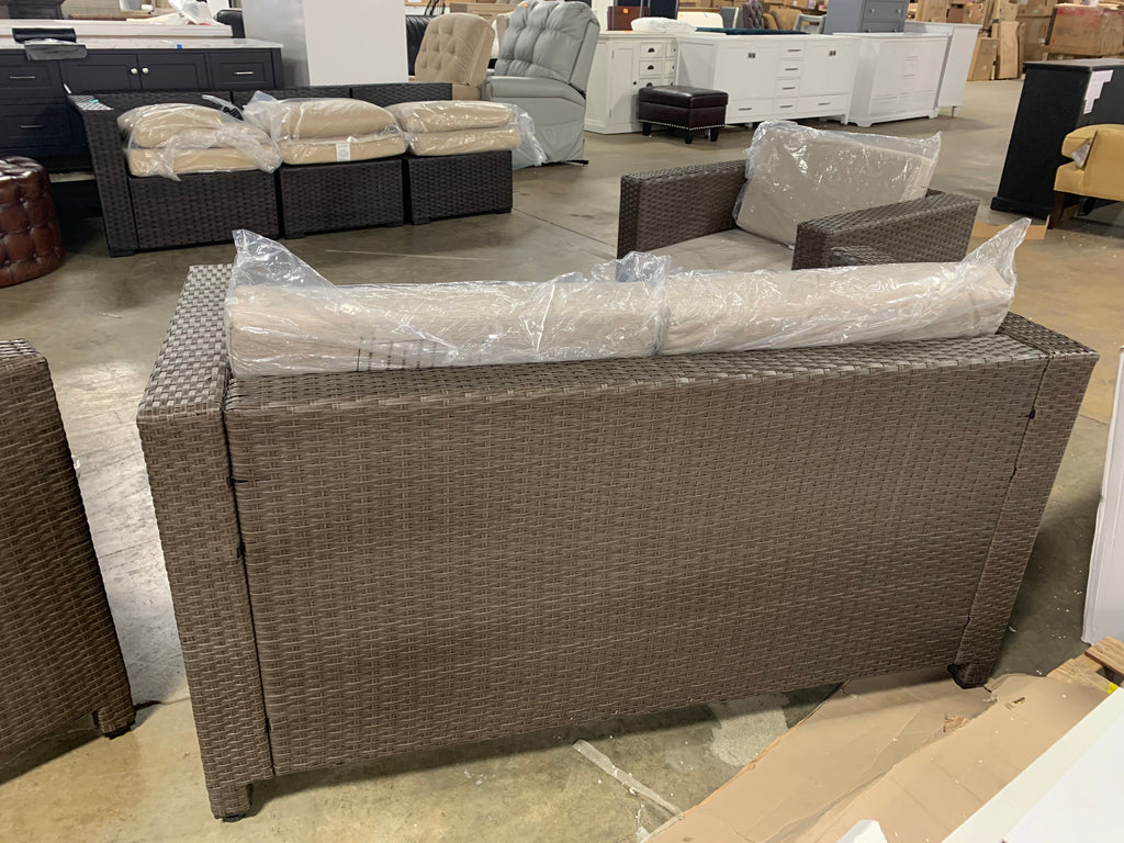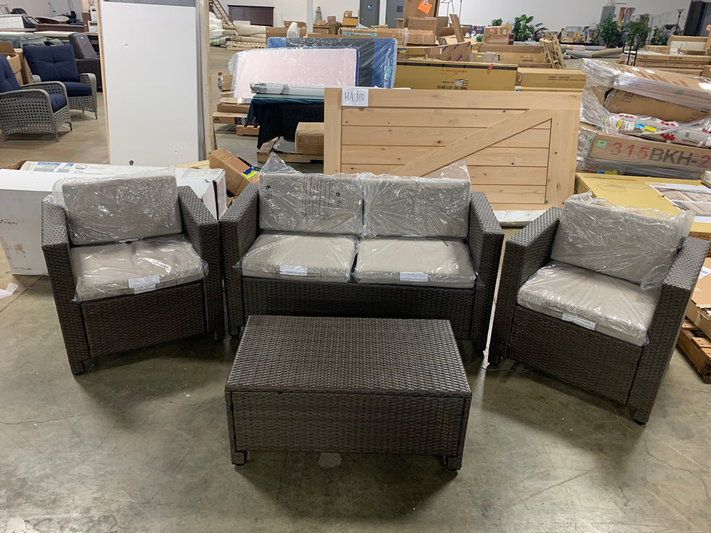 This 4 piece outdoor seating group in in GREAT condition.Two club chairs, one loveseat and one table are included. Rattan color is gray. Cushions are still in sealed plastic and are a heathered beige/gray color. Please see all photos and the link below for more details.