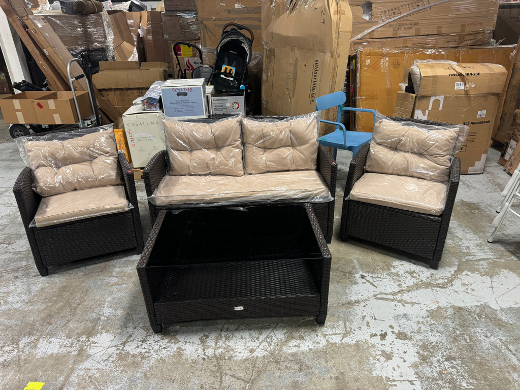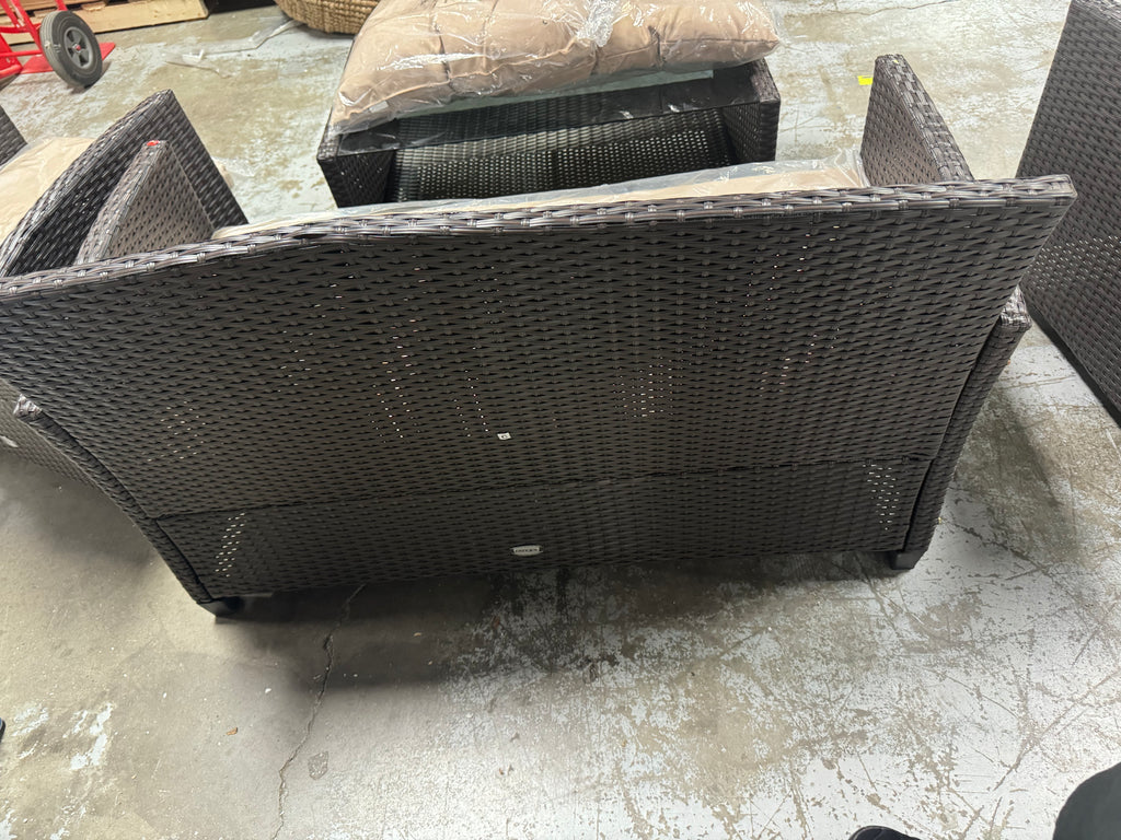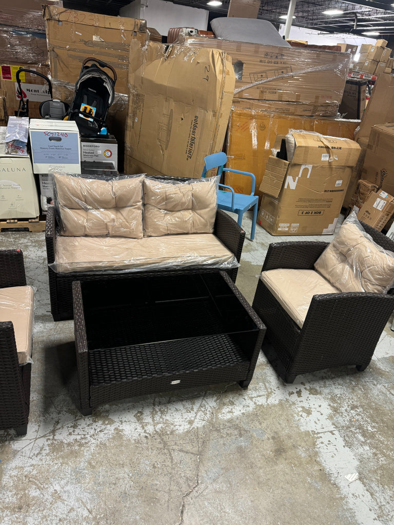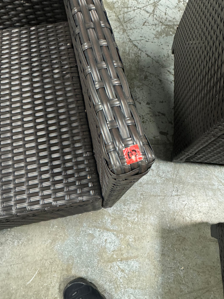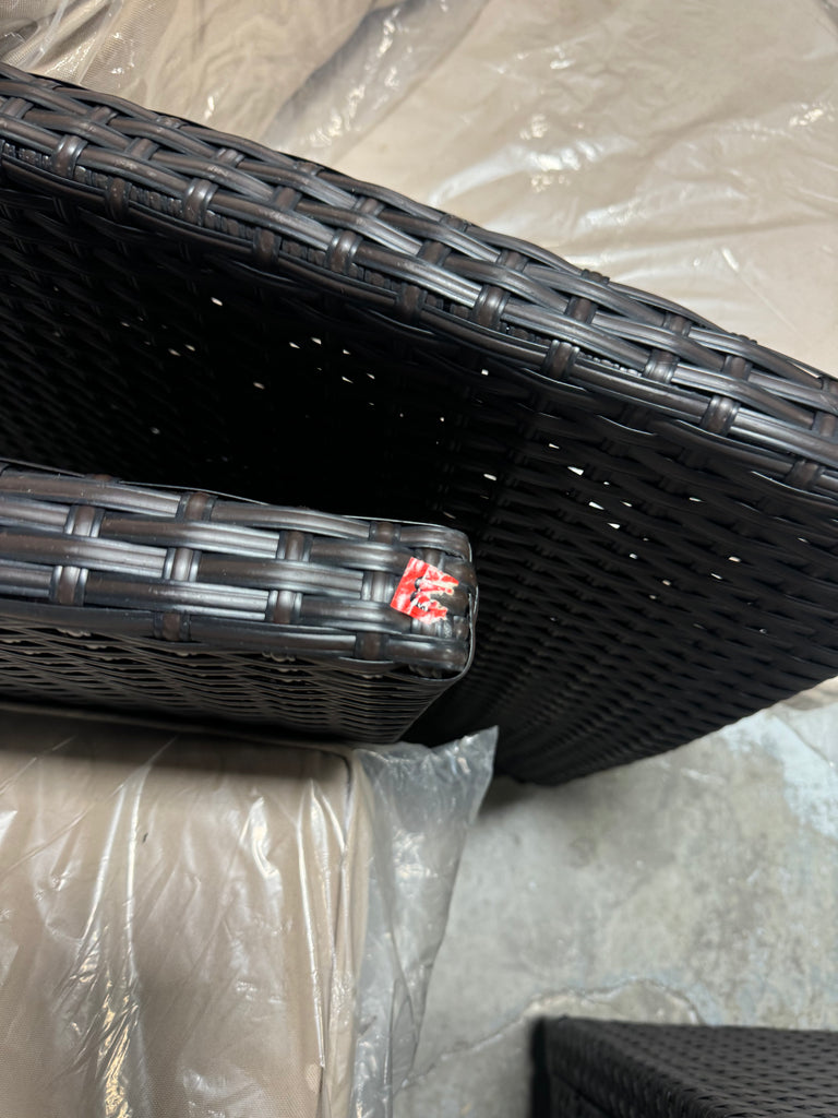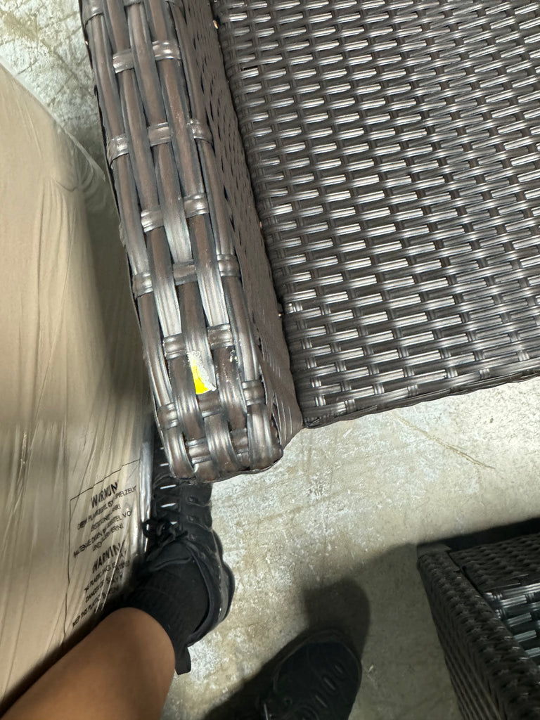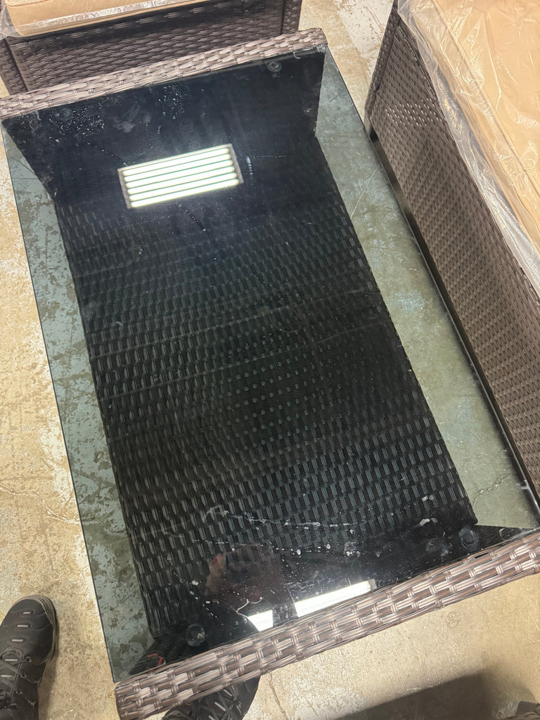 Note: Full set, patio couch has outdoor residue from leaves, sticker residue on edges needs pulled off, minor cosmestic imperfections and dents to chairs and table in some aras, glass with table needs cleaned, one chair is bent a little due to being out of box, see pictures