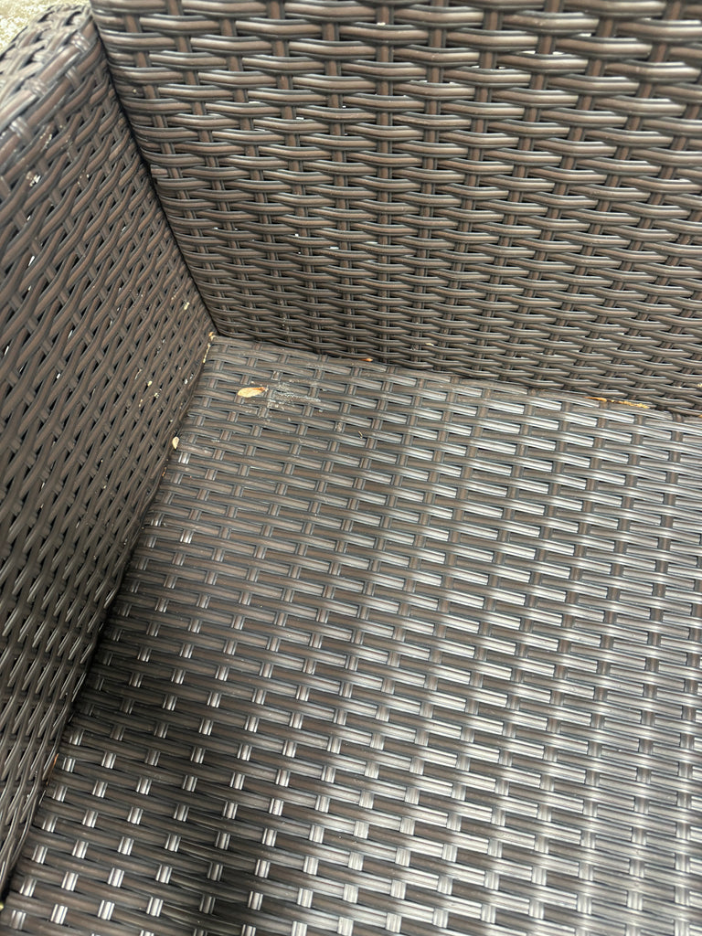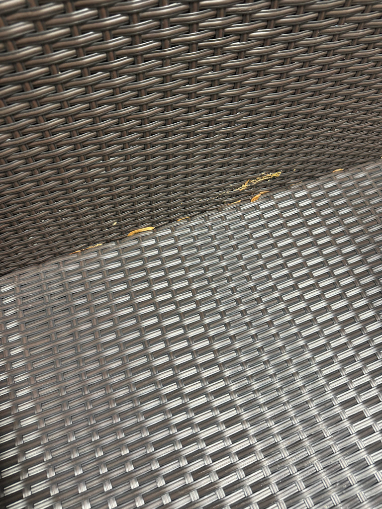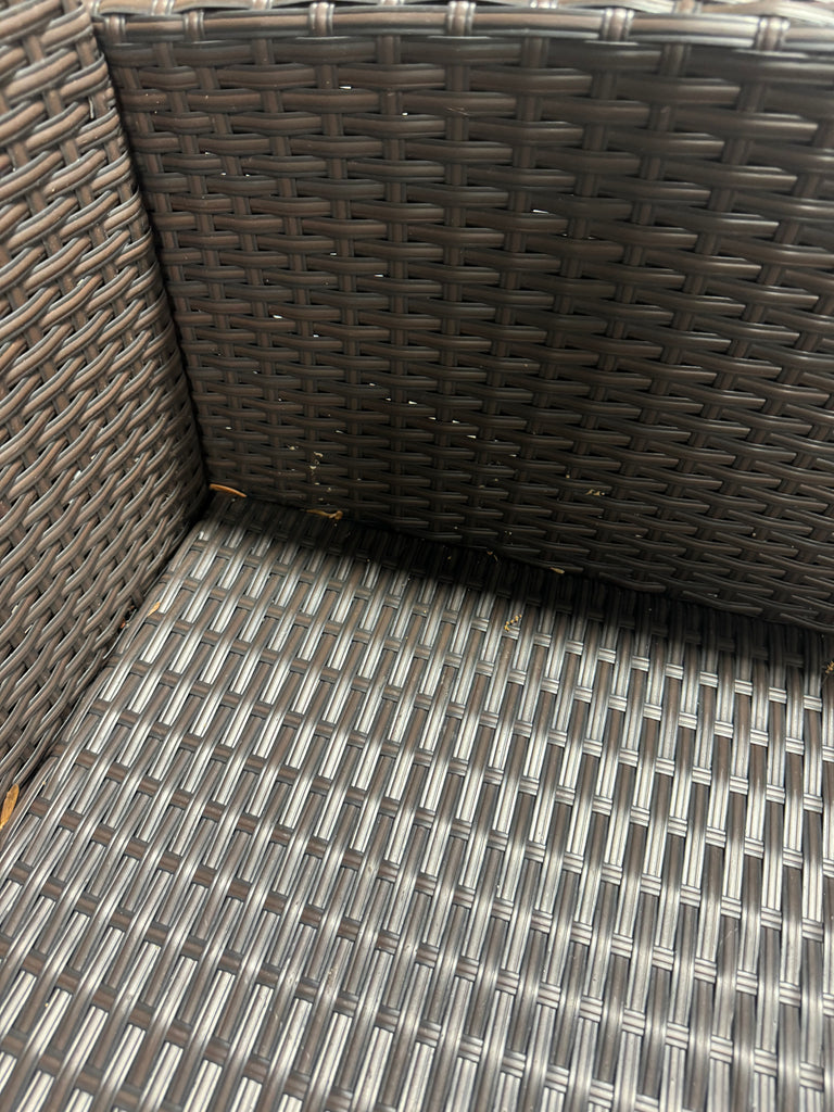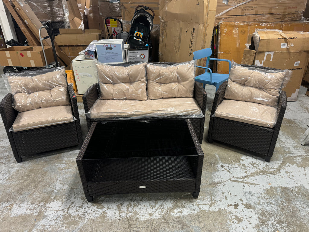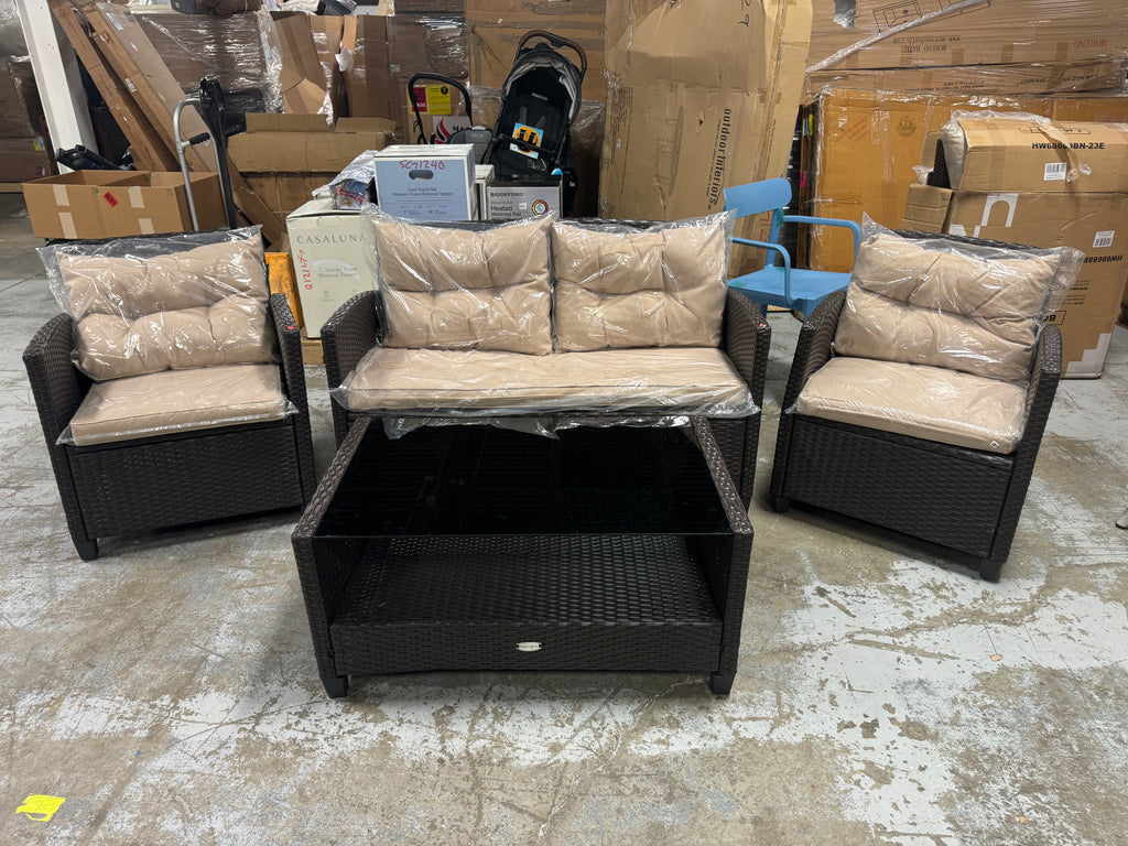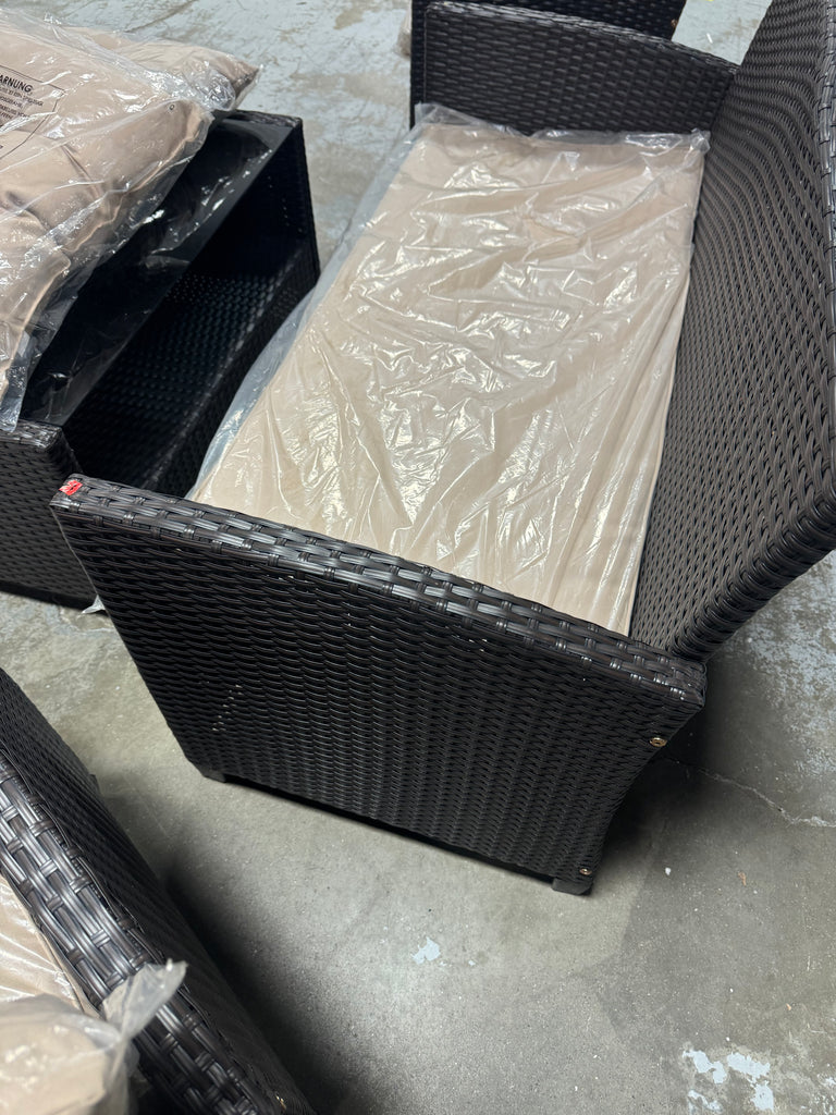 Note: Full set, patio couch has outdoor residue from leaves, sticker residue on edges needs pulled off, minor cosmestic imperfections and dents to chairs and table in some aras, glass with table needs cleaned, one chair is bent a little due to being out of box, see pictures