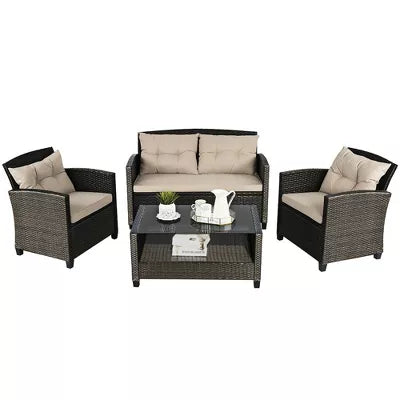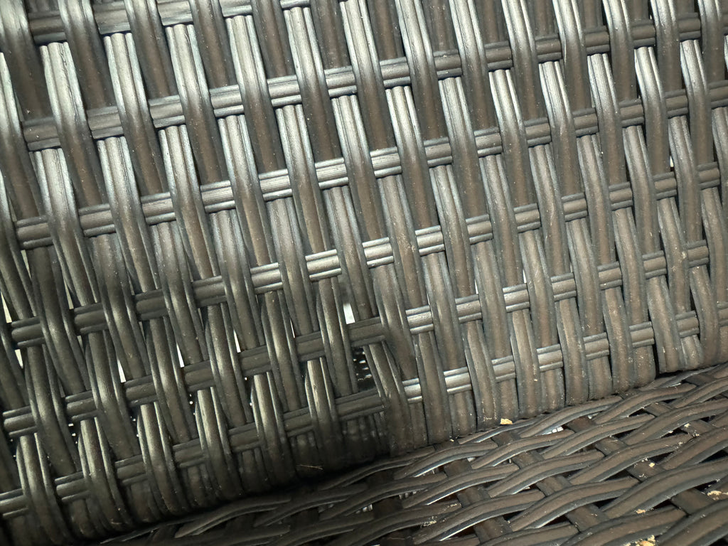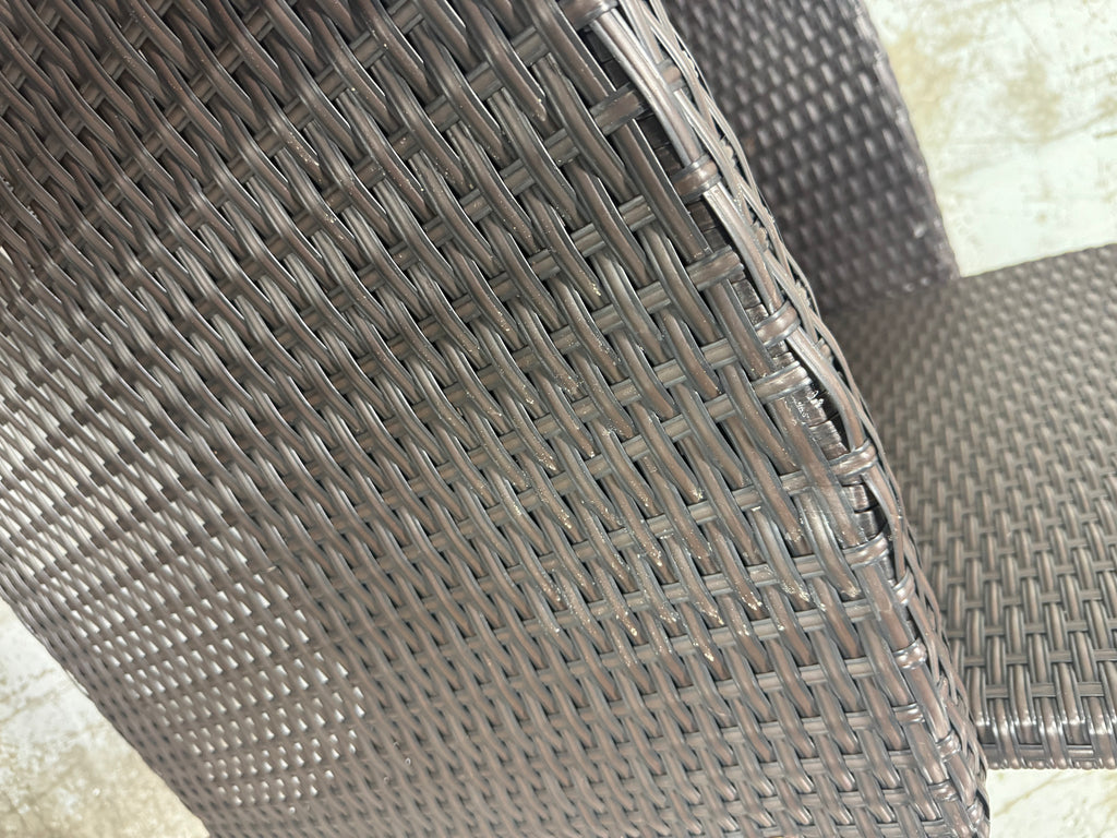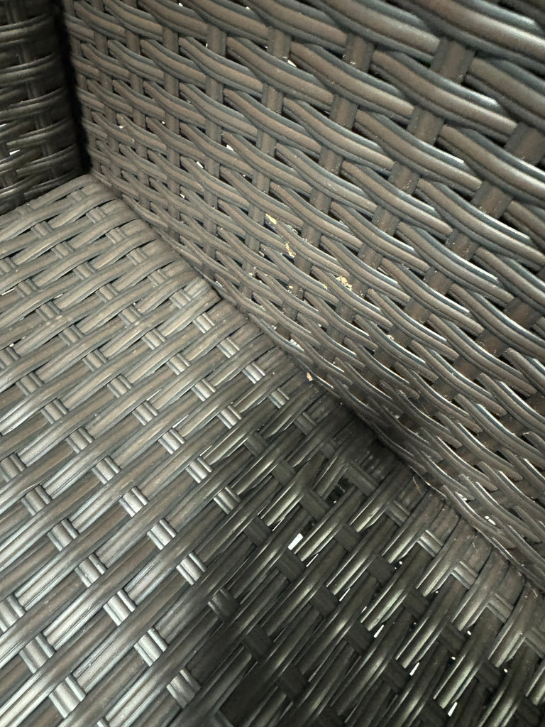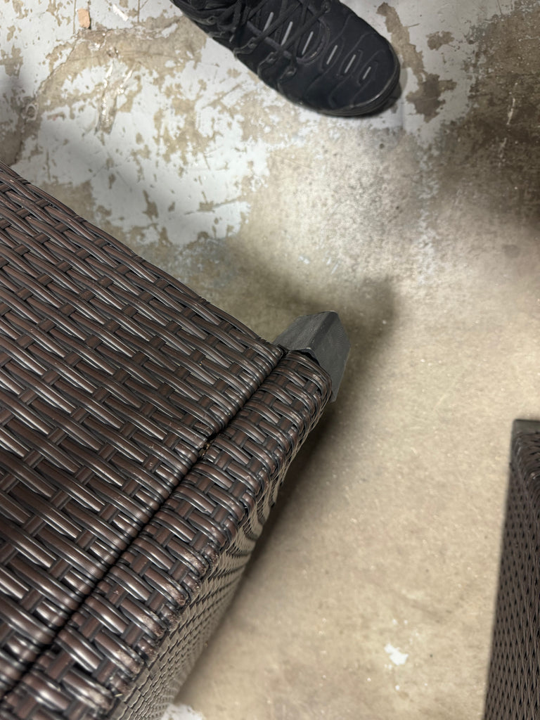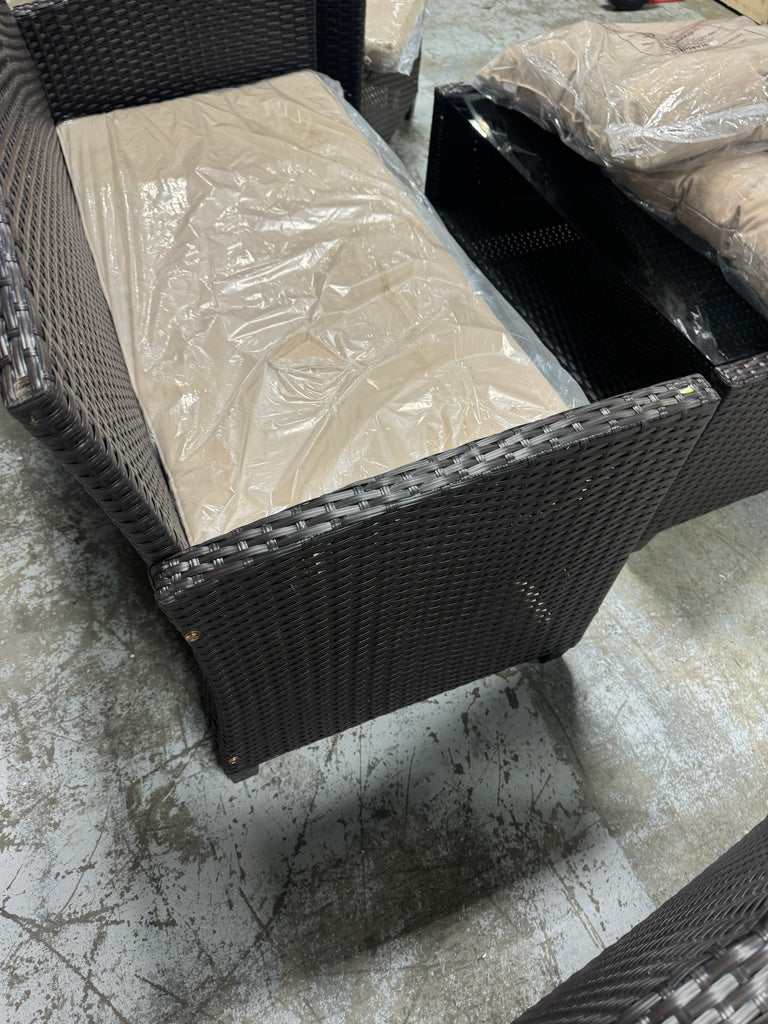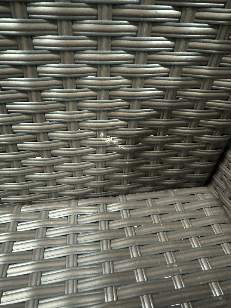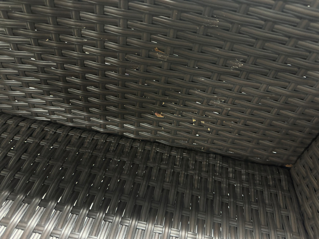 Note: Full set, patio couch has outdoor residue from leaves, sticker residue on edges needs pulled off, minor cosmestic imperfections and dents to chairs and table in some aras, glass with table needs cleaned, one chair is bent a little due to being out of box, see pictures