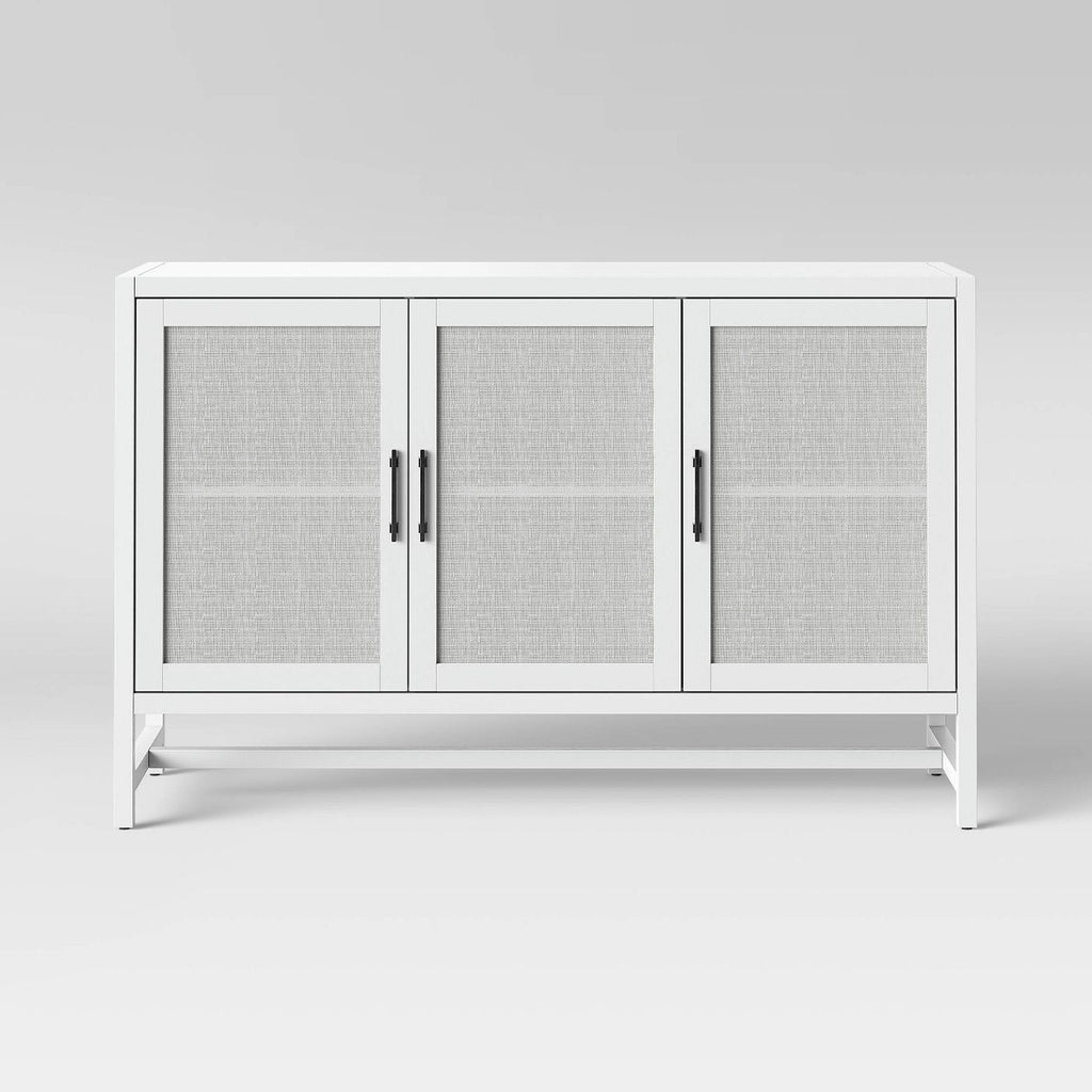 50" Warwick 3 Door Accent Media Cabinet in White. In box item, PREVIOUS ASSEMBLED ITEM, MAY BE IN NEED OF HARDWARE. See link for further details and dimensions.