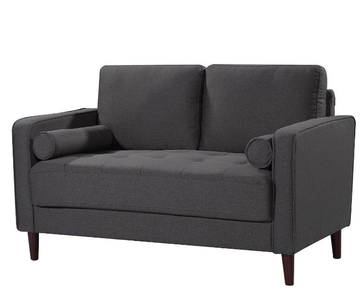 This is an open box item in good condition. Assembly required, all parts located under couch seat for storage. Upholstery is heather gray. Legs are made of eucalyptus wood.