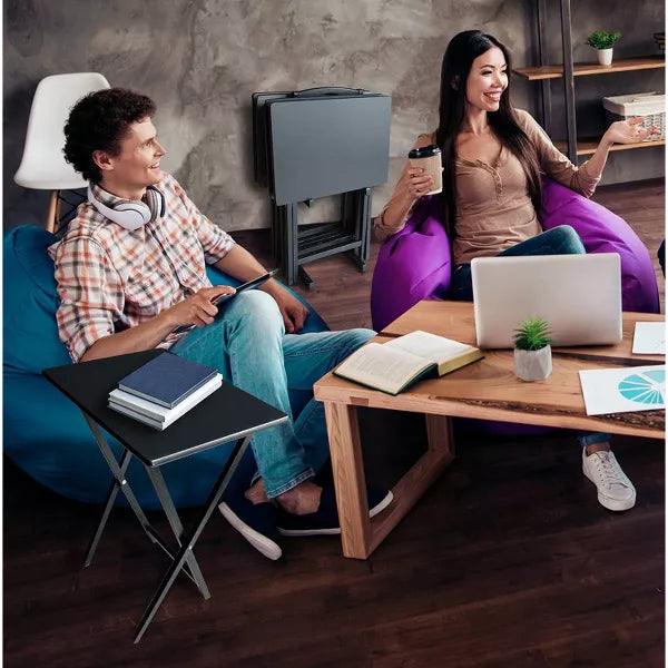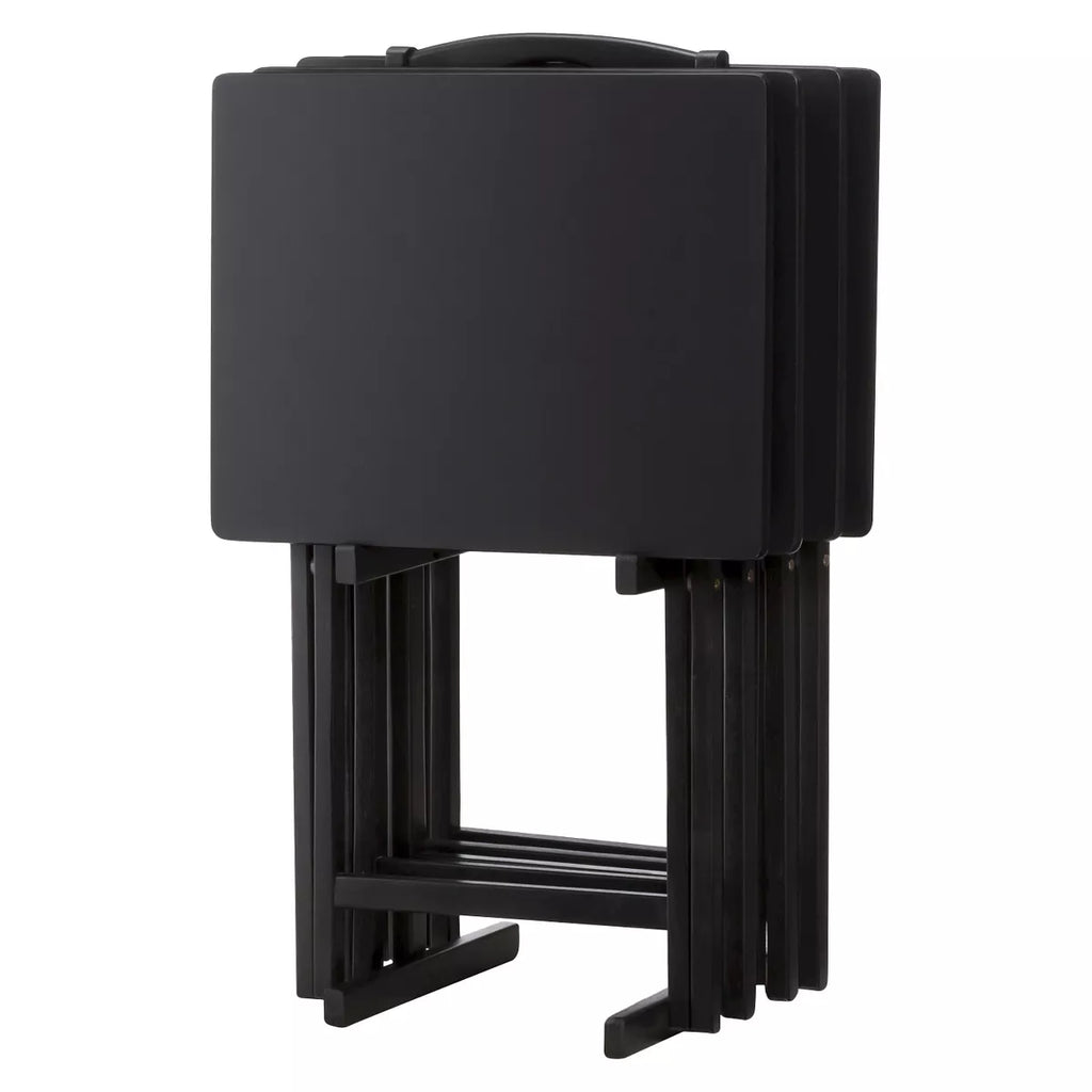 Note: this is for one set of 4 tv trays with stand, not in original packaging but all the hardware is in the original packaging. There are some slight cosmetic imperfections on the black finish just from open packaging, see pic for example