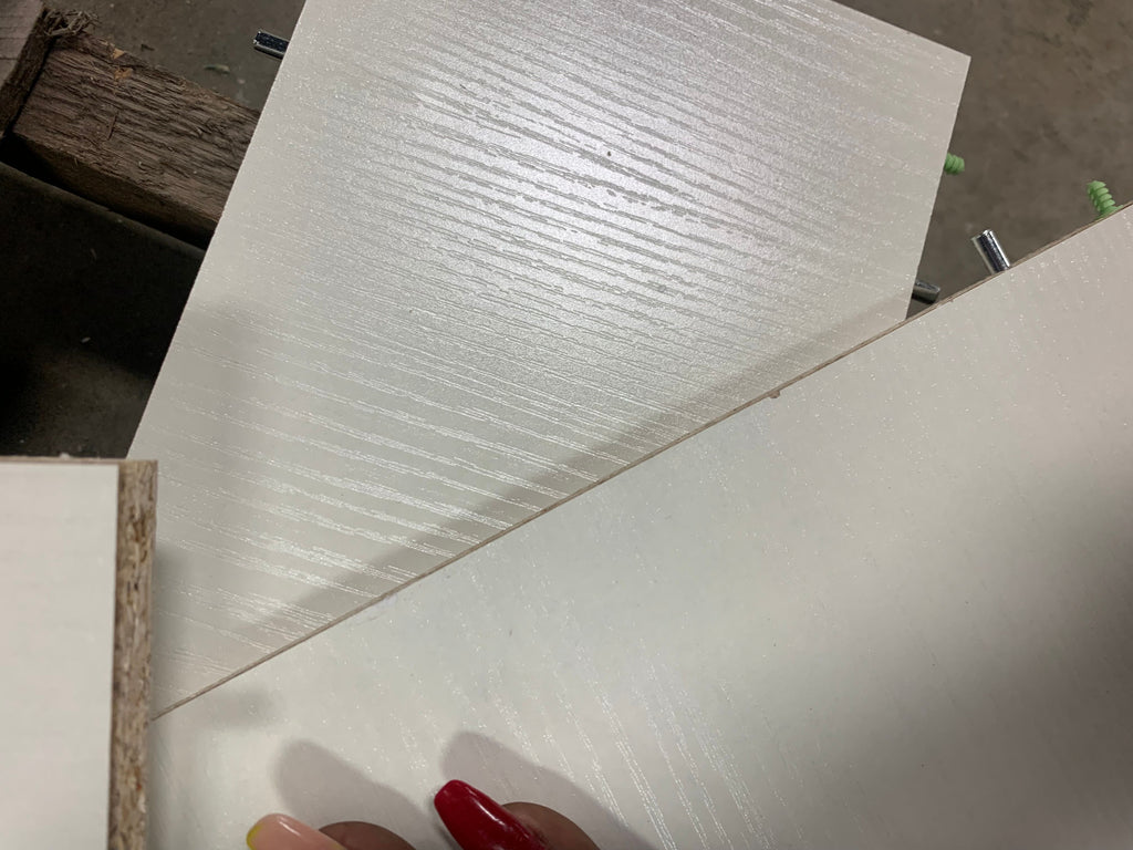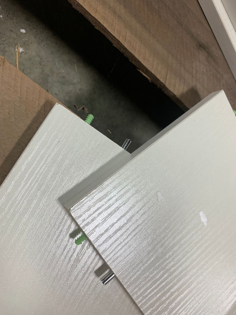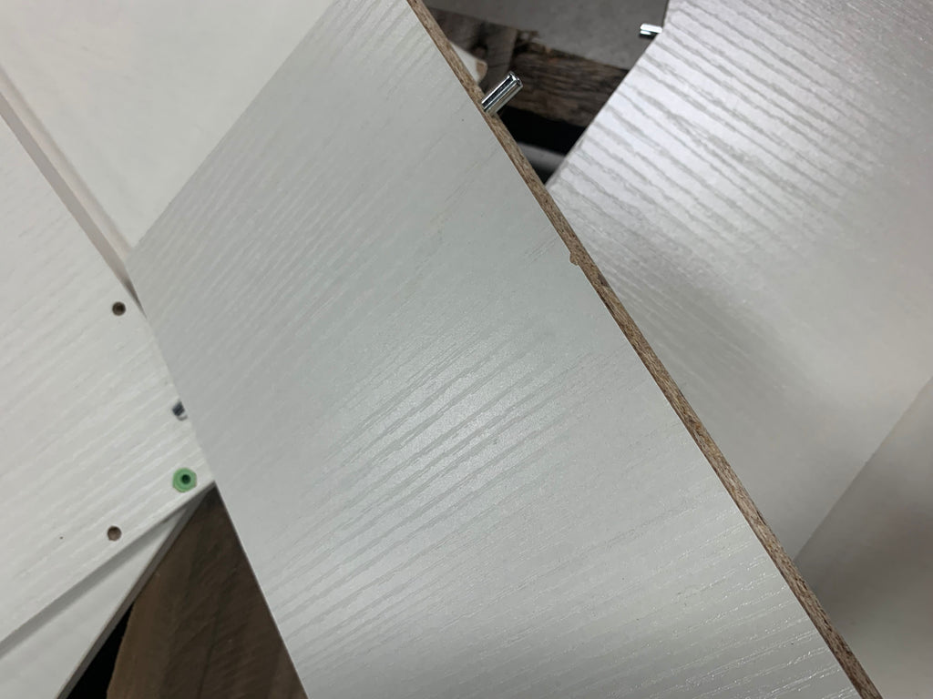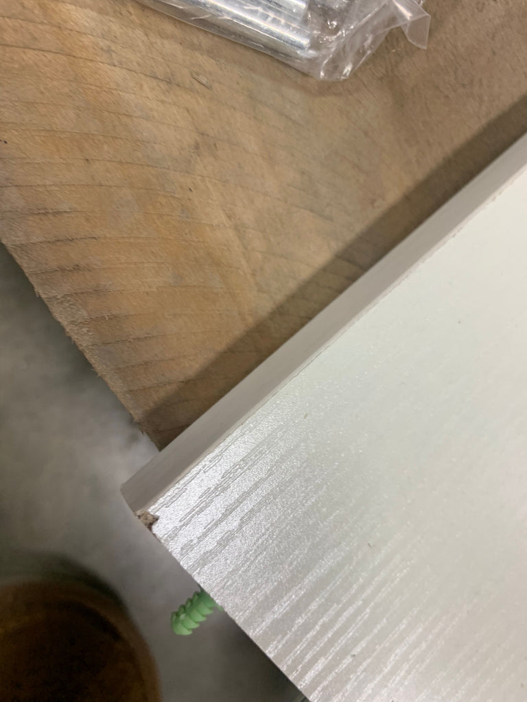 Open box, The color is white wood grain, Size: 6.5"x13x13, there are some cosmetic damages see in house photos for more details
