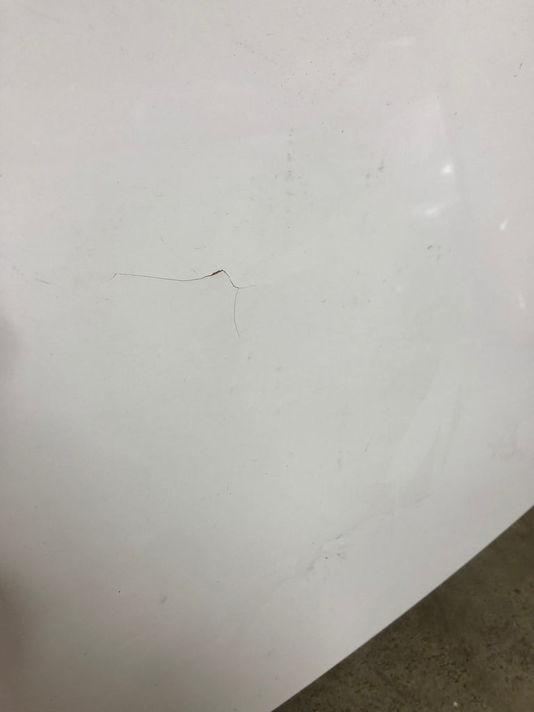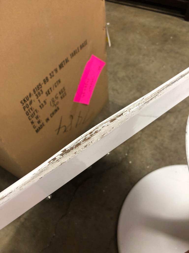 Note: AS IS, scratches and small dent in tabletop, dent to side of the table top, hardware to connect tabletop and base included, assembly needed.