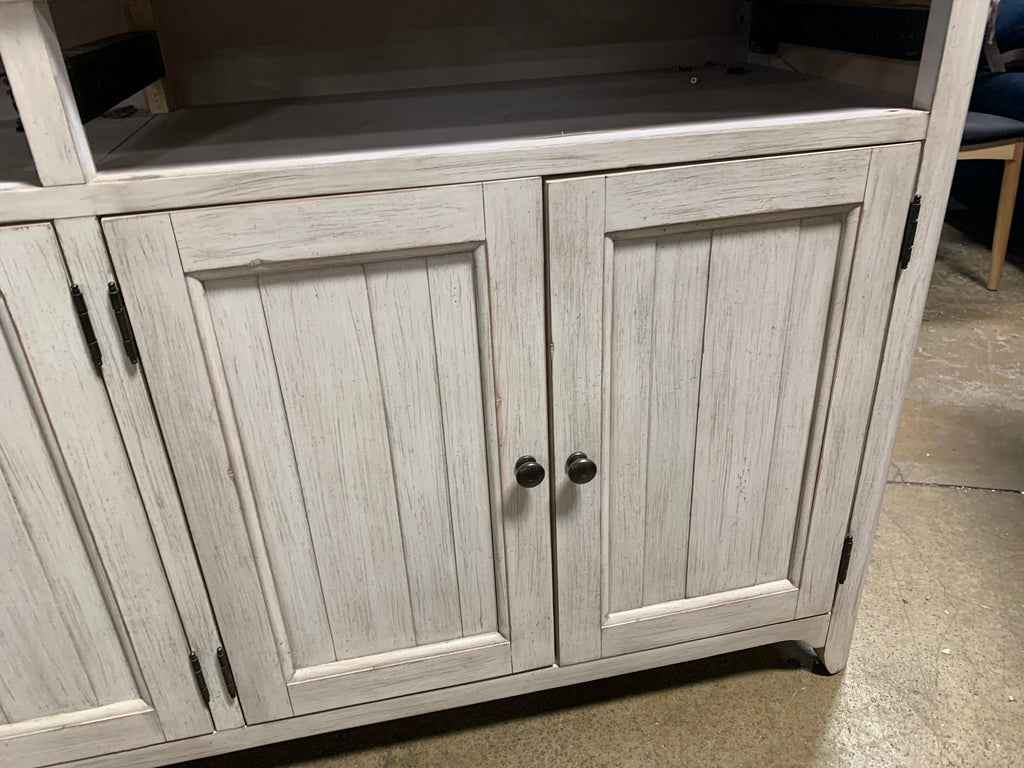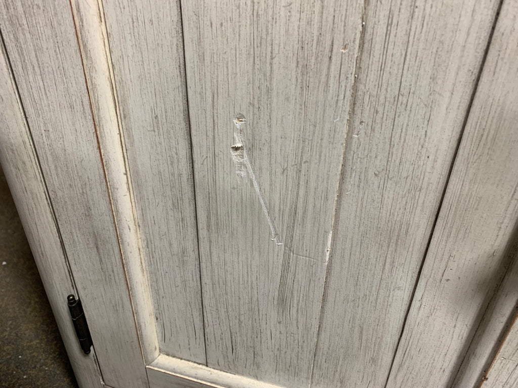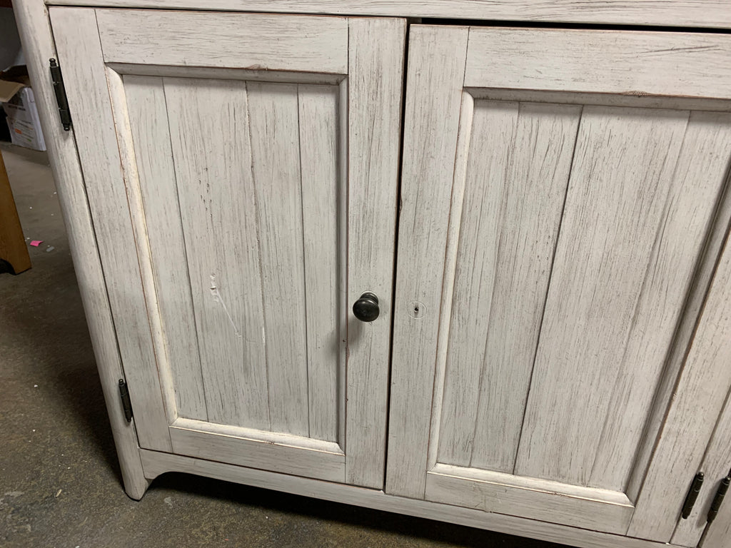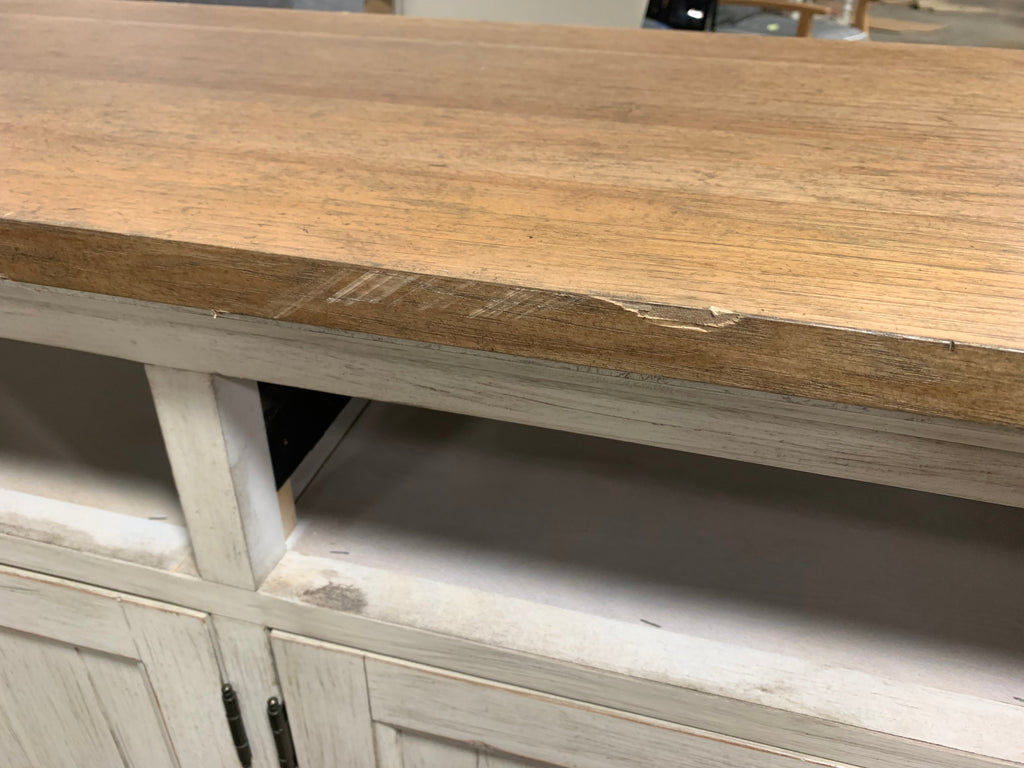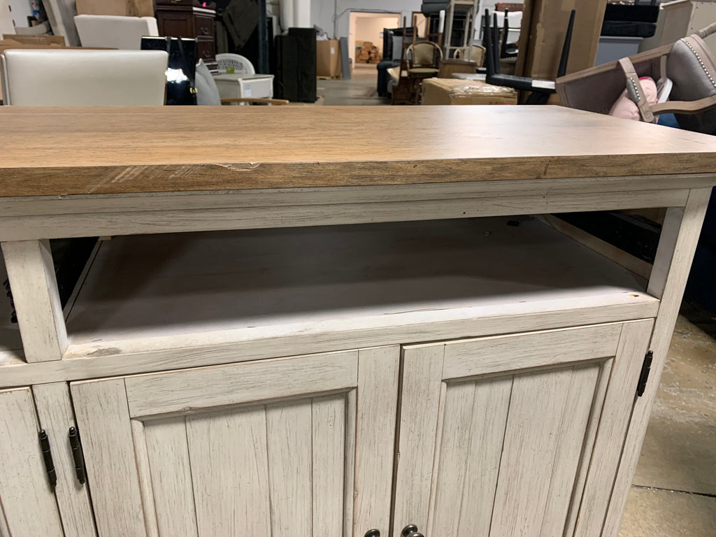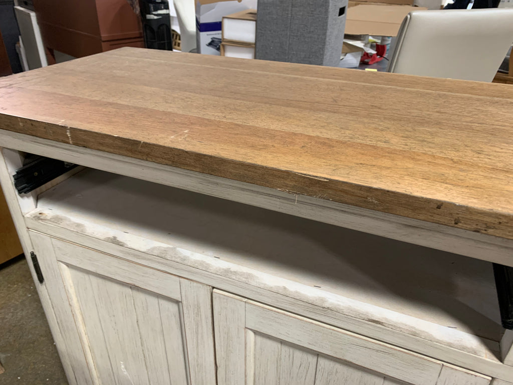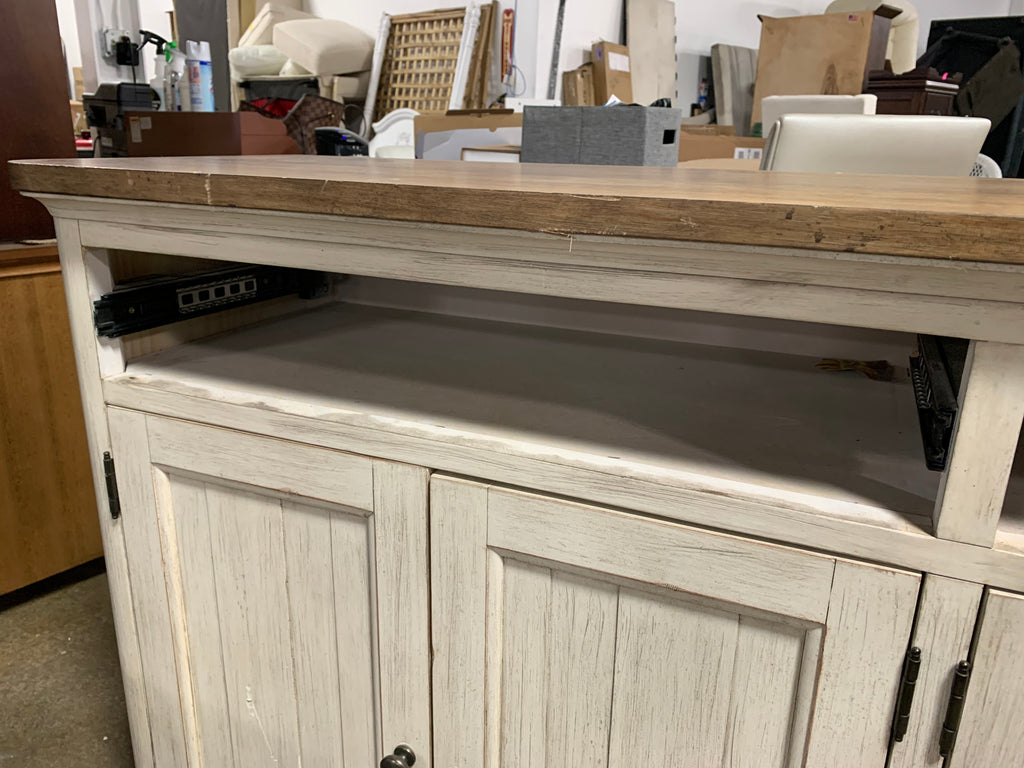 This entertainment center is in good condition. Scratches along the top and on the front cabinet. Missing one cabinet pull - shown in photos. Missing drawers that slide out - shown in photos. Please see all photos  for more details.