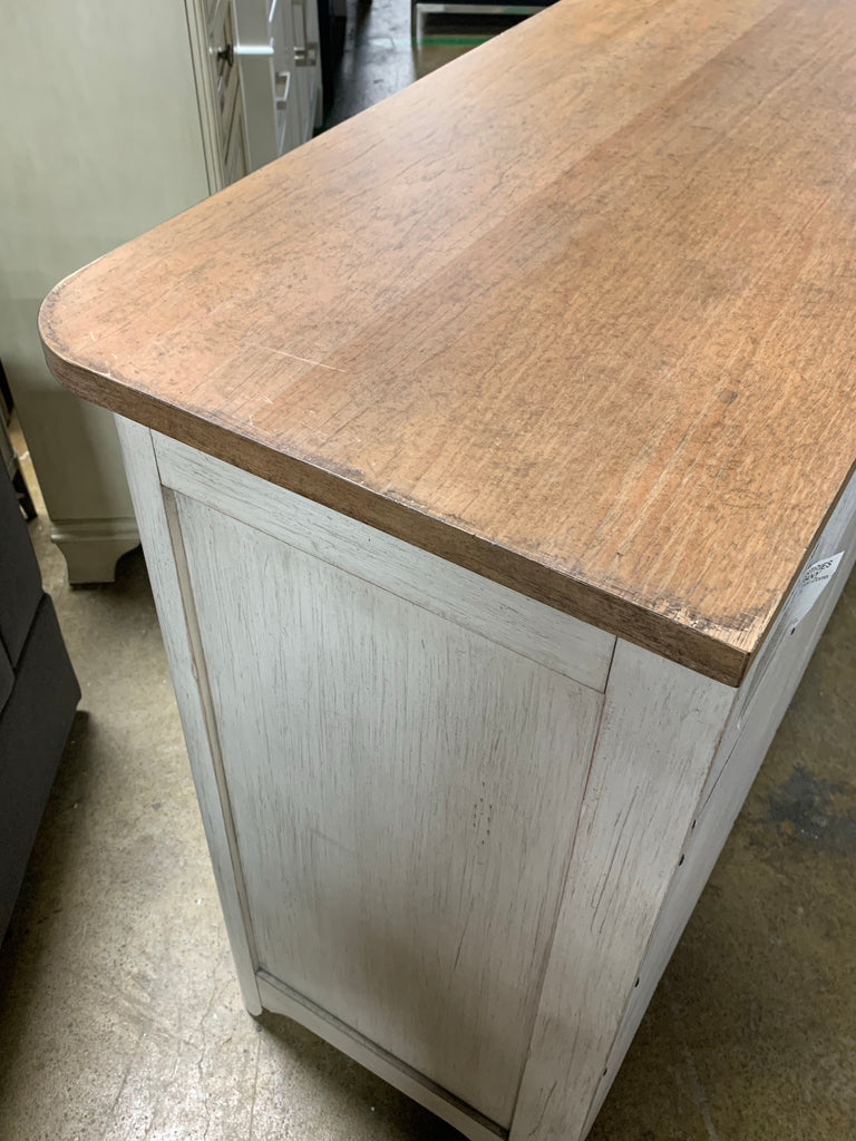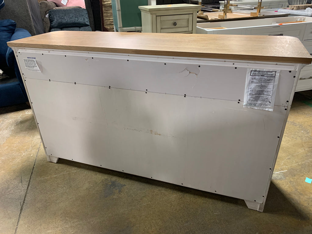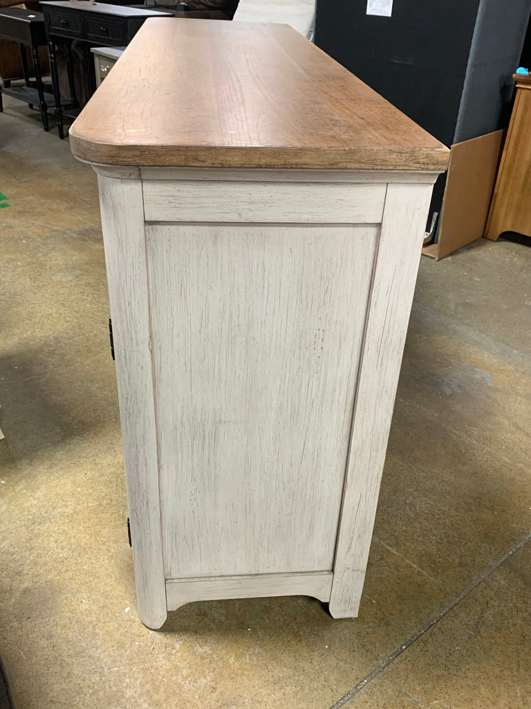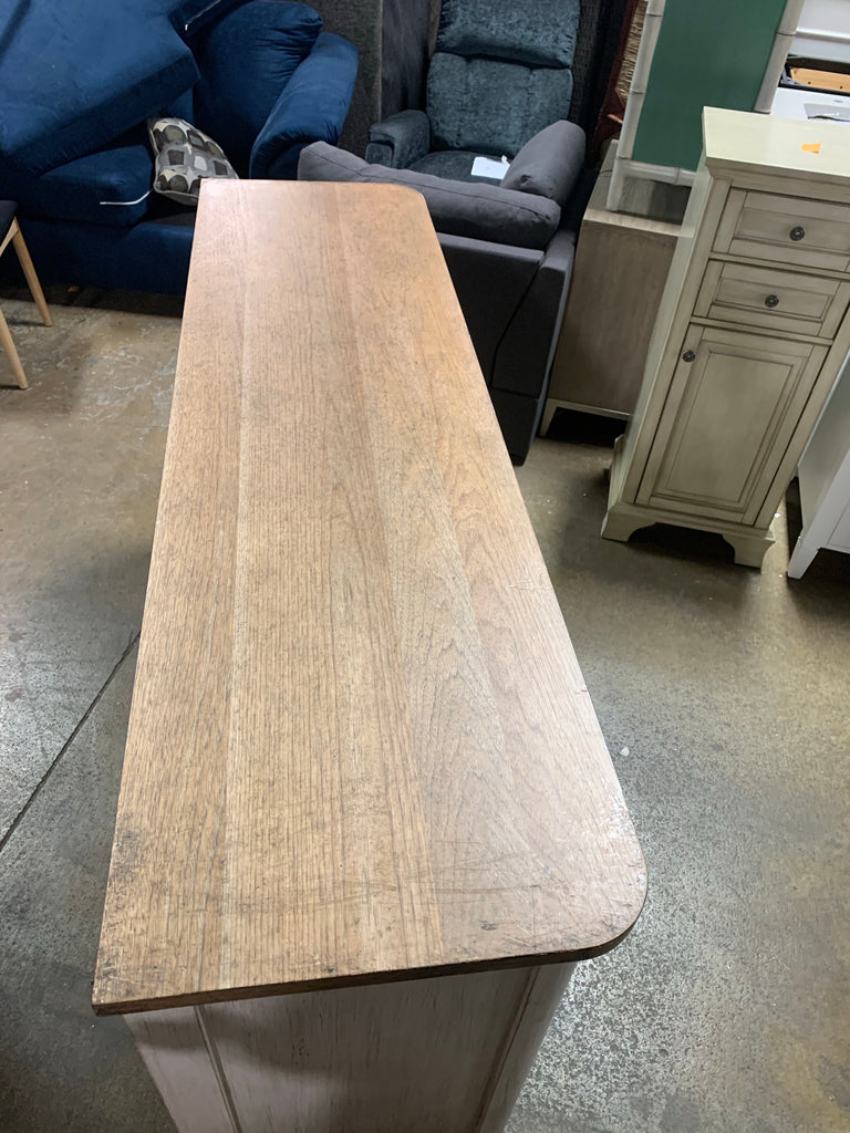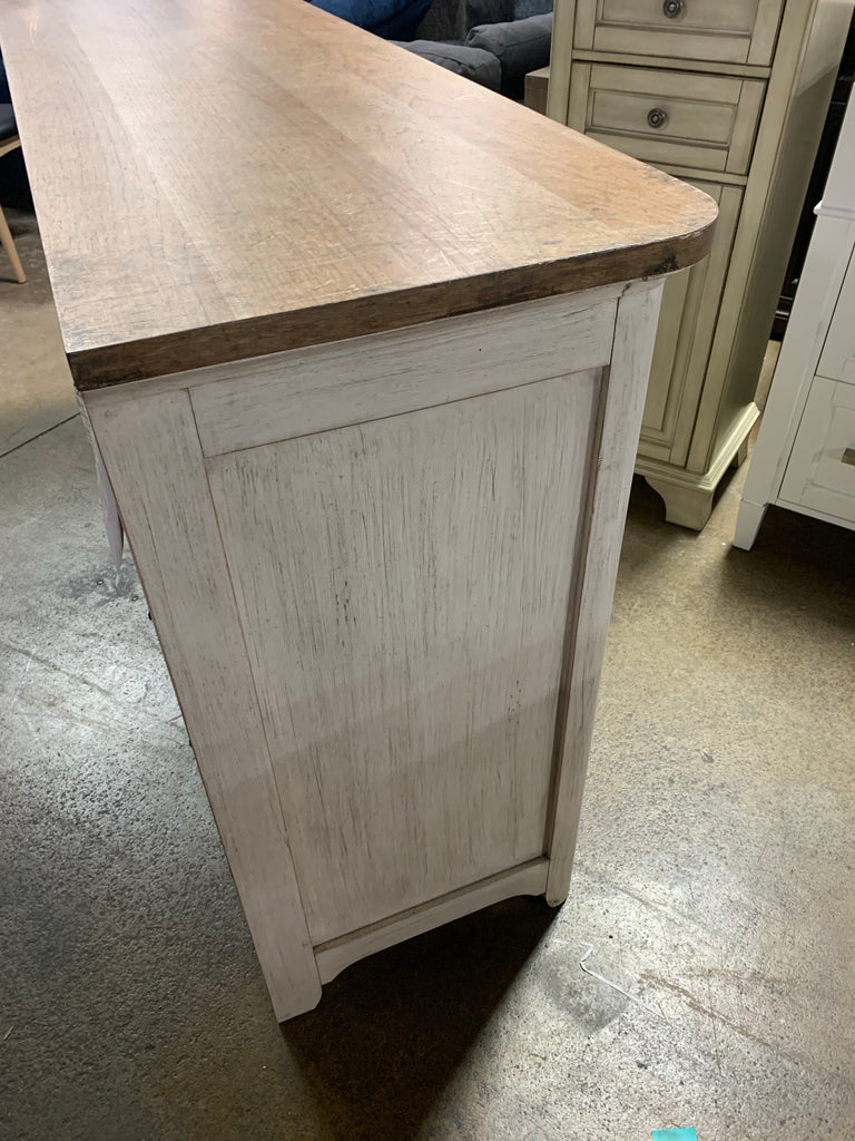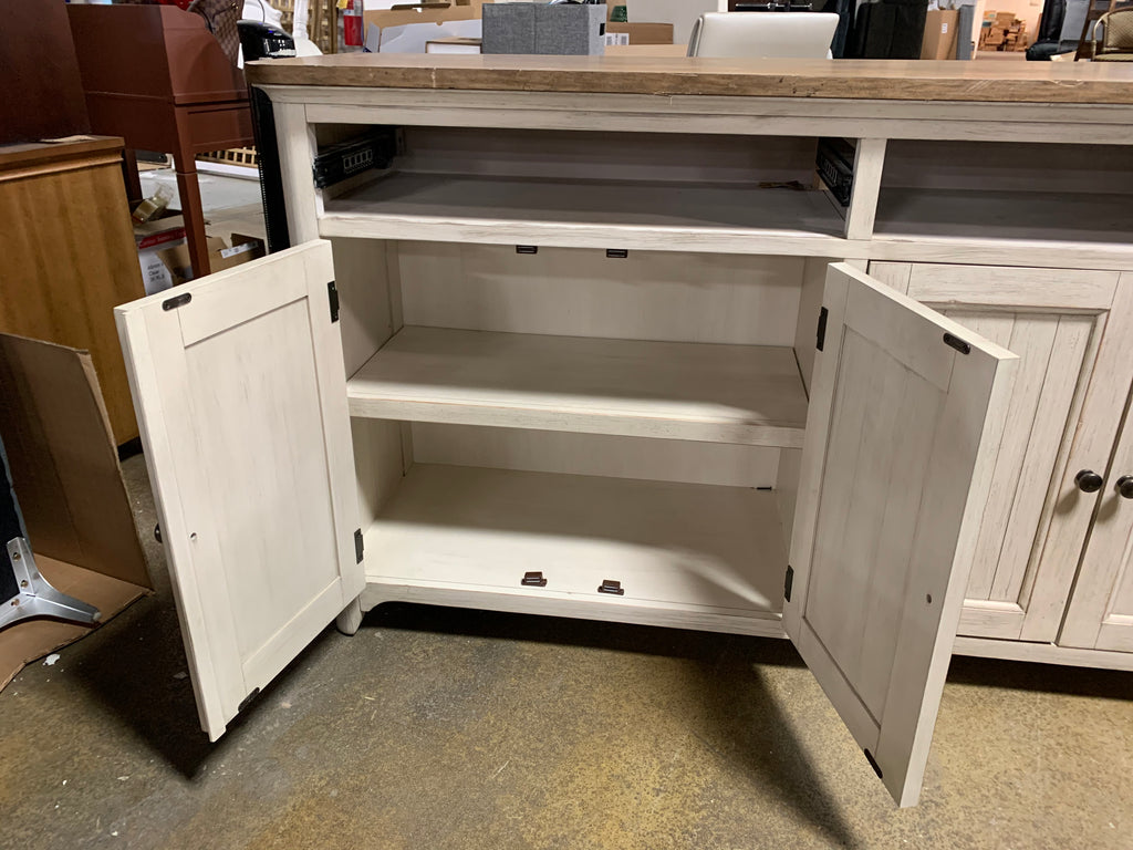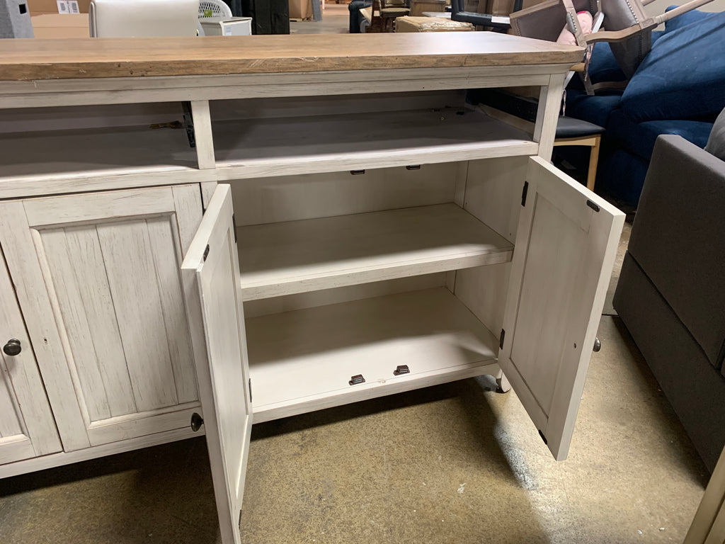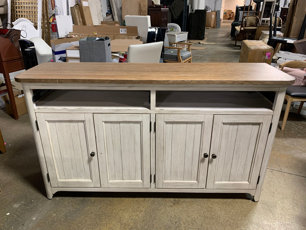 This entertainment center is in good condition. Scratches along the top and on the front cabinet. Missing one cabinet pull - shown in photos. Missing drawers that slide out - shown in photos. Please see all photos  for more details.