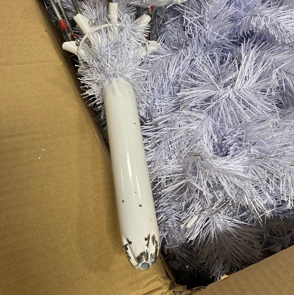 Open Box, The color is white /clear lights, Size: 7.5', There are some marks on the connector piece for the tree truck.  Please see in house photos for more details
