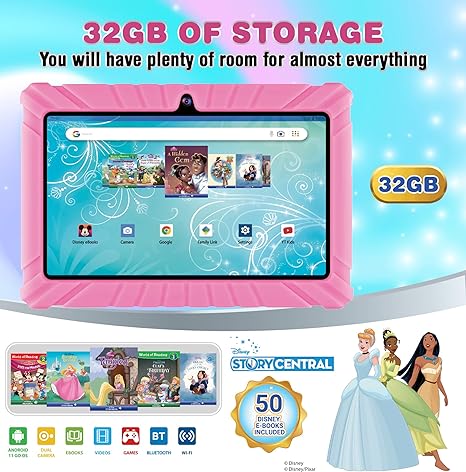 7" Android Kids Tablet 32GB, Includes 50+ Disney Storybooks & Stickers, Kid-Proof Case, (2023 Model) - Pink