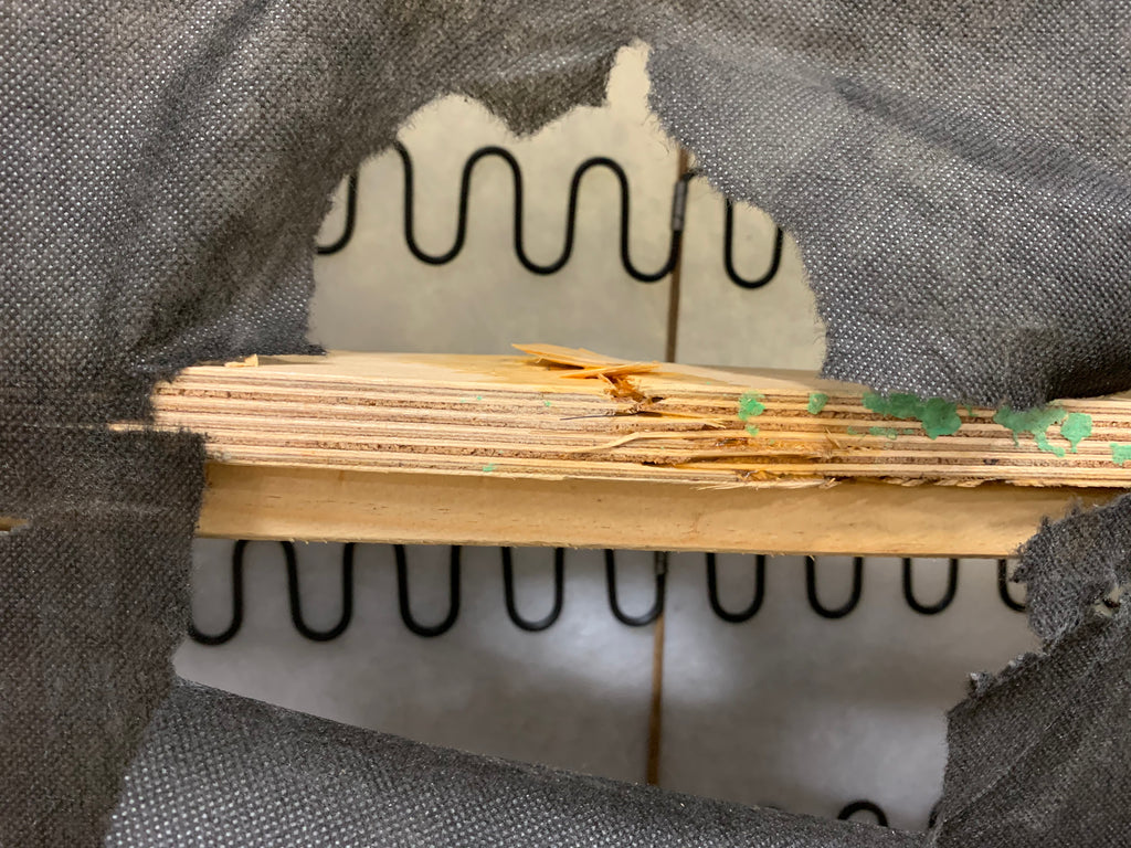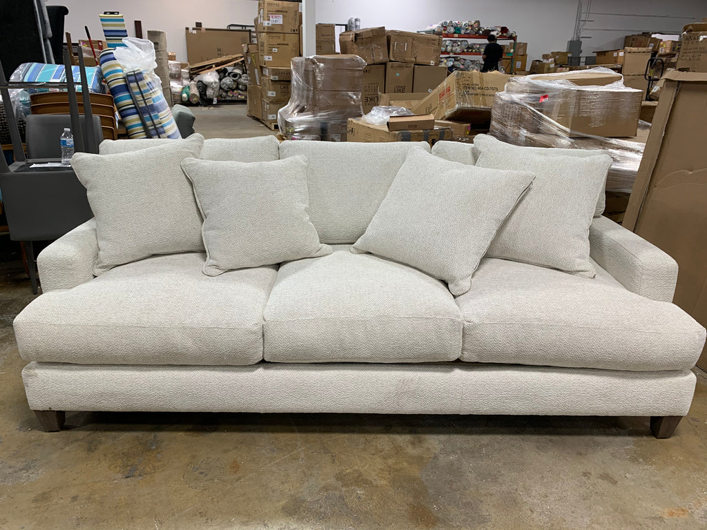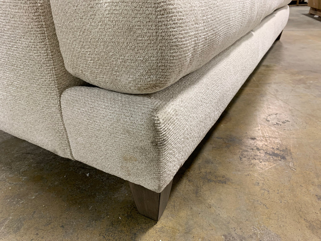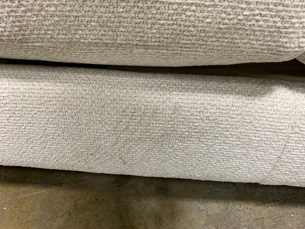 This sofa is in great condition. The bottom wood piece has been repaired with a “sister” board, so the dust cover is open -  shown in photos. There is a small dust stain on the front - shown in photos. There is also a dust stain on the bottom left corner - shown in photos. Please see all photos for more details. Link below is to compare price.