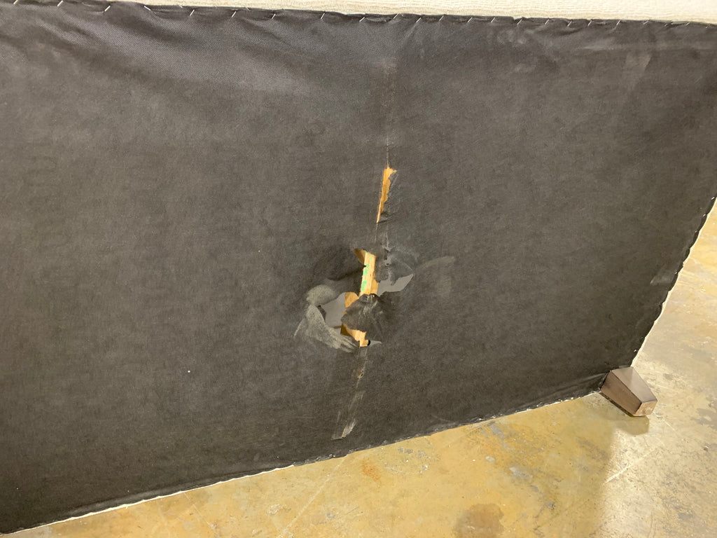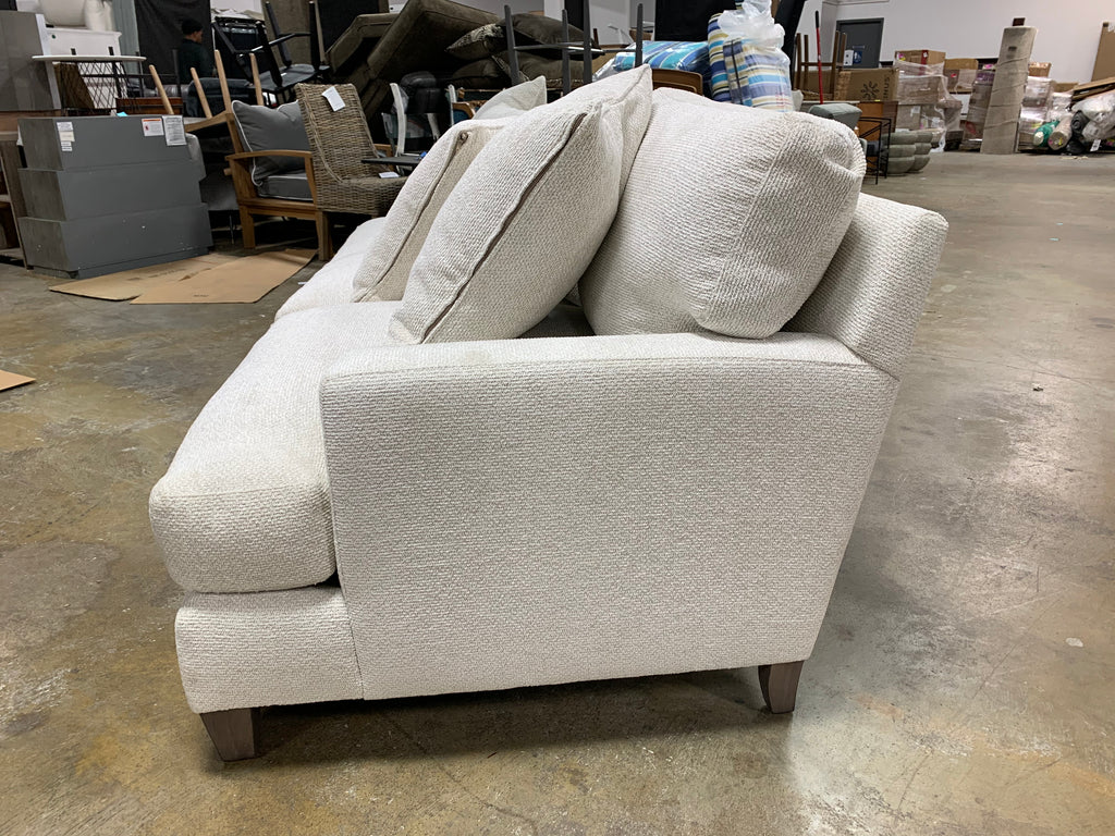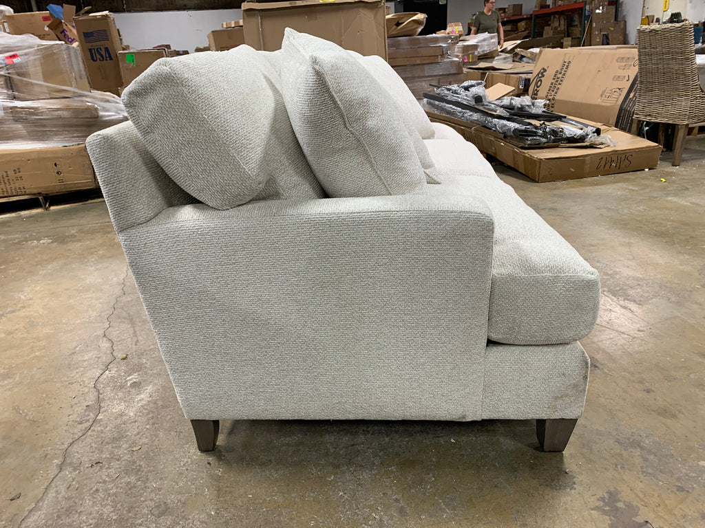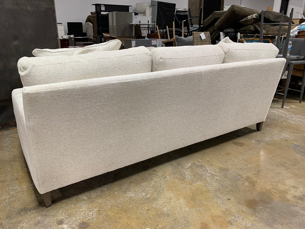 This sofa is in great condition. The bottom wood piece has been repaired with a “sister” board, so the dust cover is open -  shown in photos. There is a small dust stain on the front - shown in photos. There is also a dust stain on the bottom left corner - shown in photos. Please see all photos for more details. Link below is to compare price.
