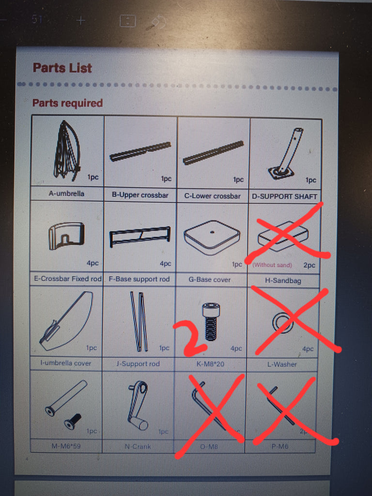 Note: AS IS: This umbrella has scuffing/scratching on a few of the metaal pieces. This umbrella is missing 2 screws, 4 washers, 3 L-shaped wrenches, 2 sandbags and one base support rod. See photos provided for damage and photo of what is missing.