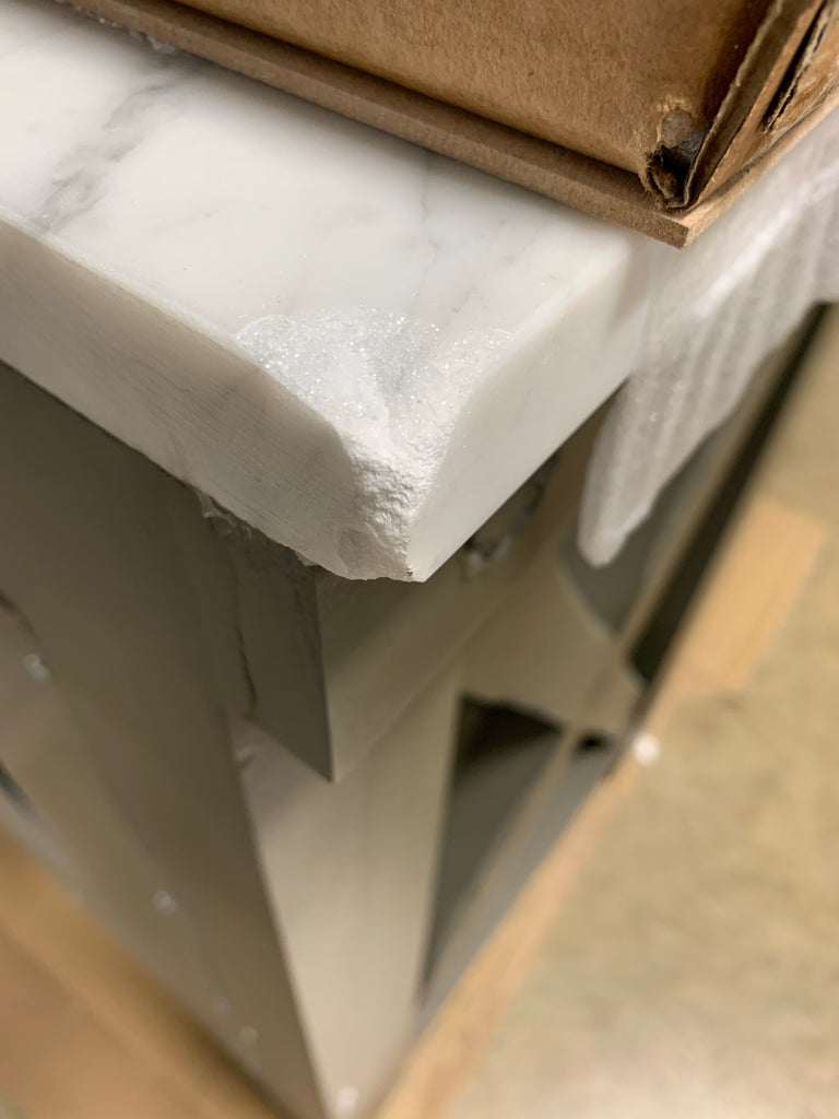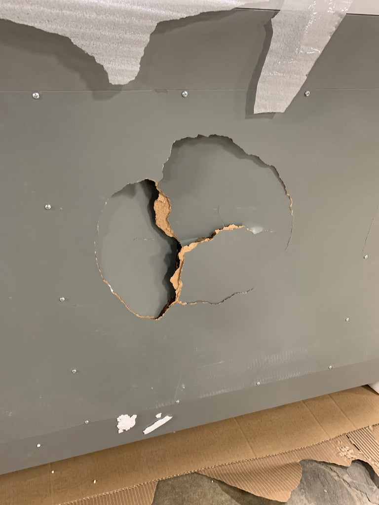 Item is in good out of box condition. Two imperfections to mention: there's a hole in back (see photo) which shouldn't affect function or installation. Additionally, left back corner is chipped (see photo).