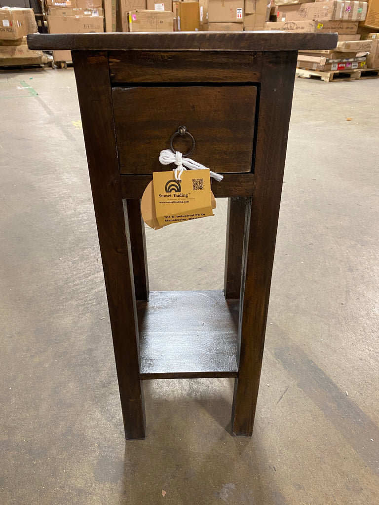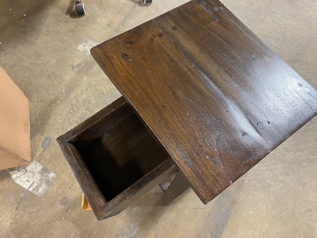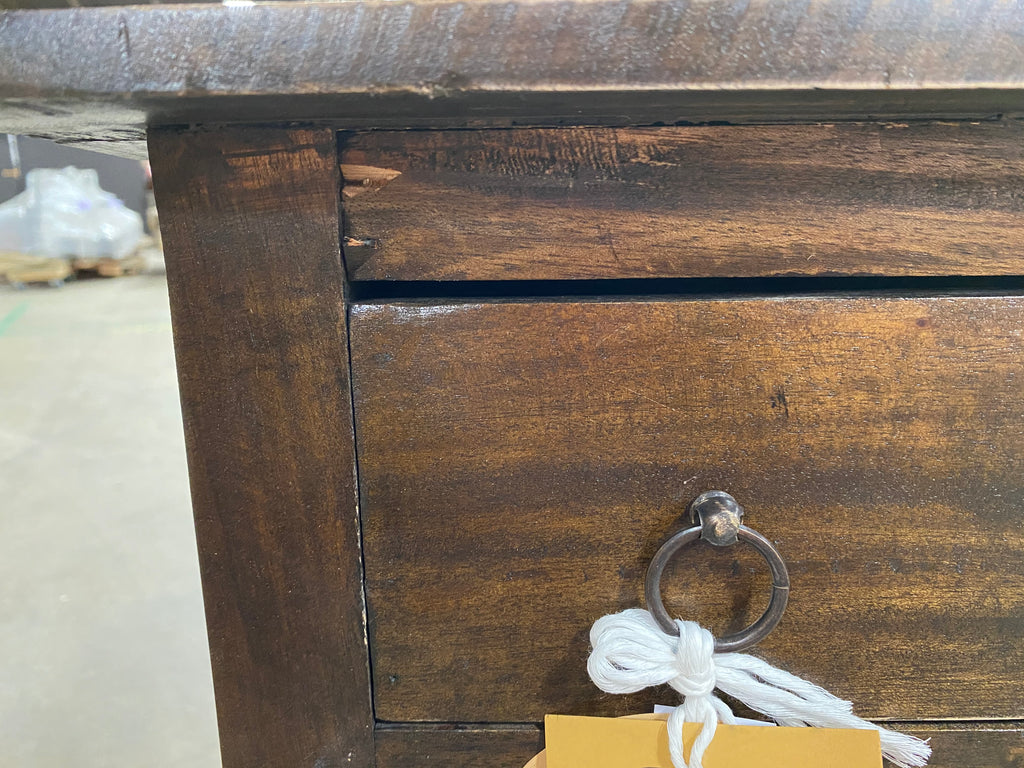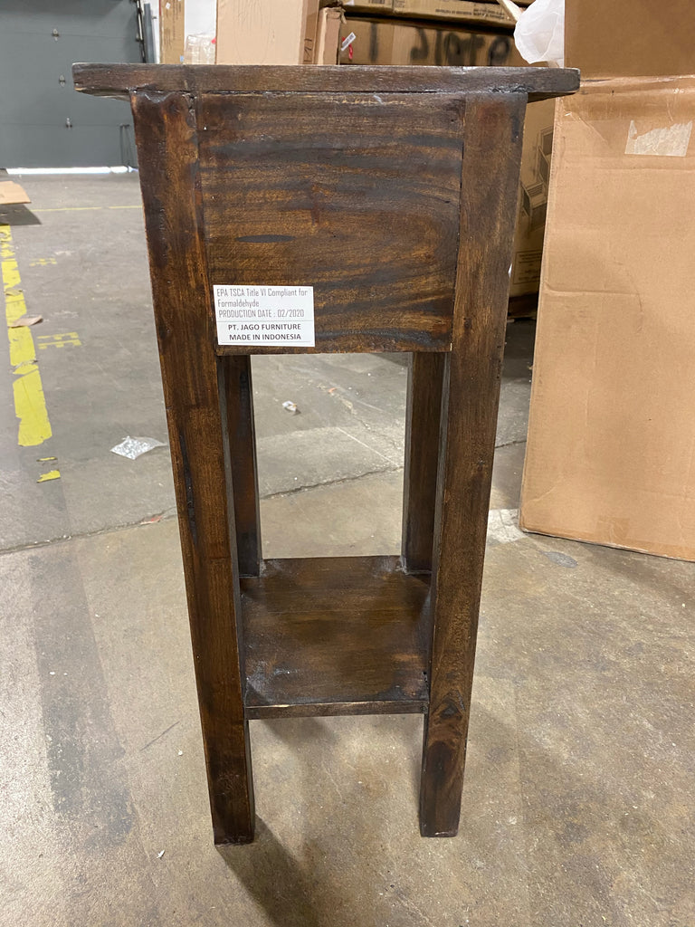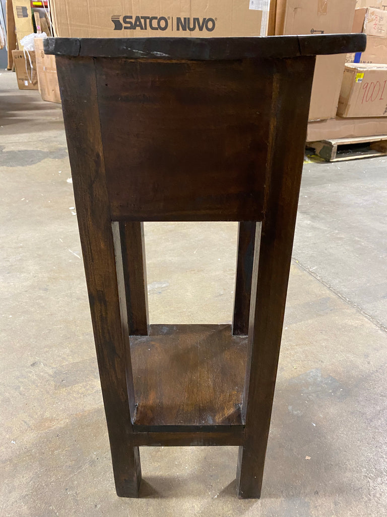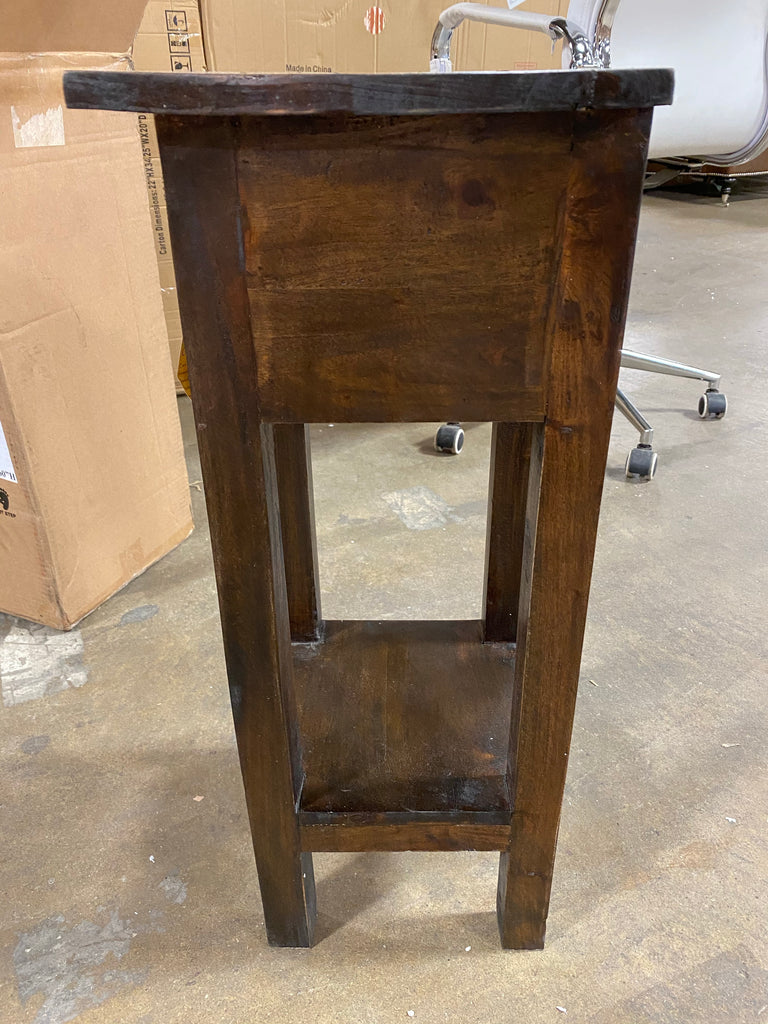 Item is in good condition. This is an opened in-box item. No assembly required. Piece of wood above the drawer and under the table top has nails showing, but is still sturdy; see photos for details.