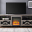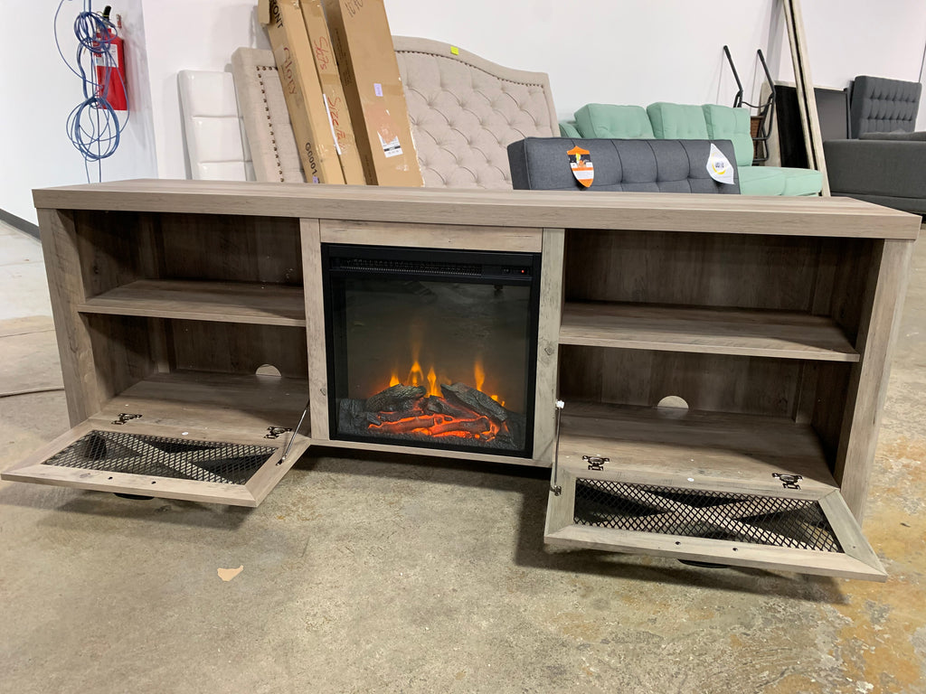 This fireplace console is in GREAT condition. It has been plugged in and works properly, can be shown in photos. Finish is grey wash. Can be turned on without the heat as well. Please see ALL photos and link below for more details.