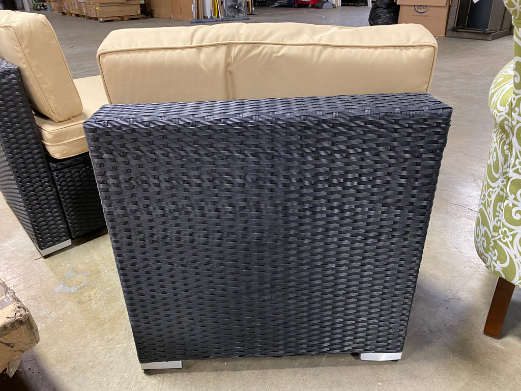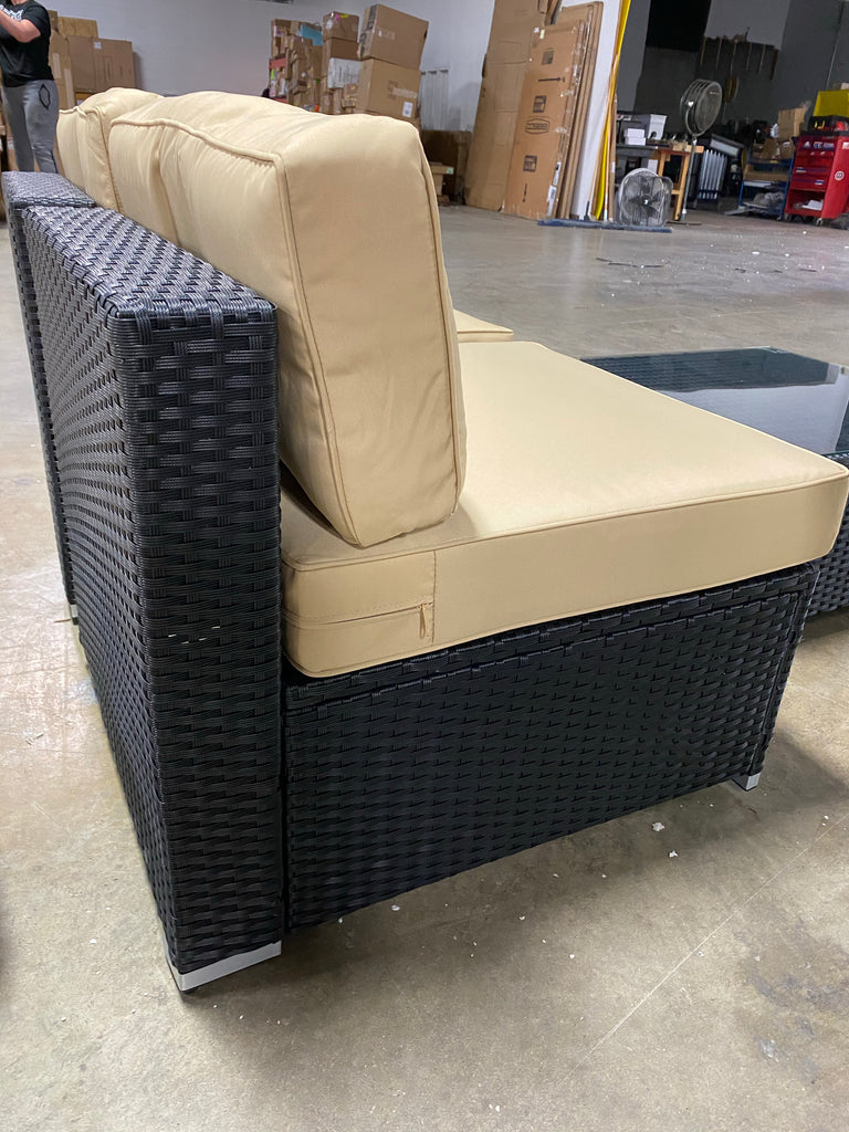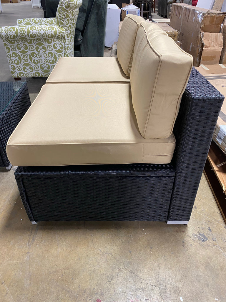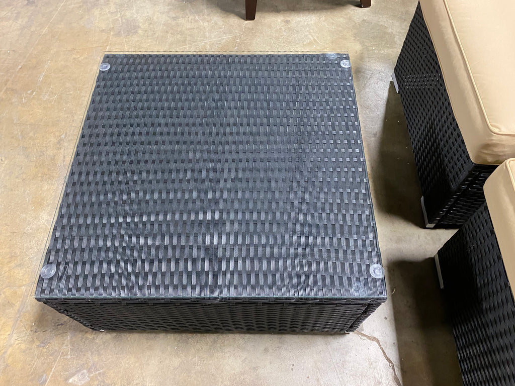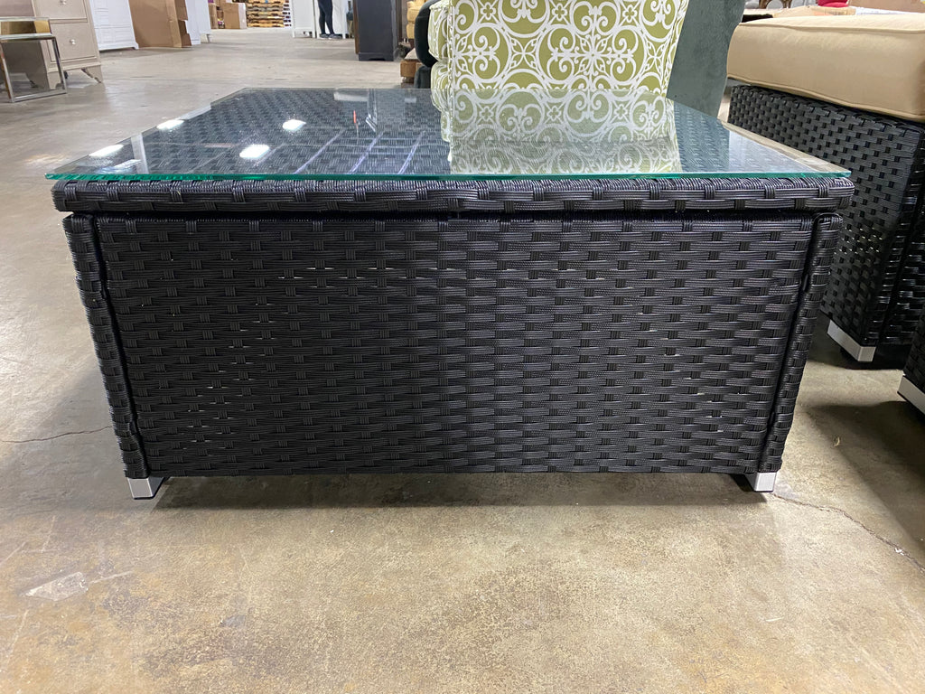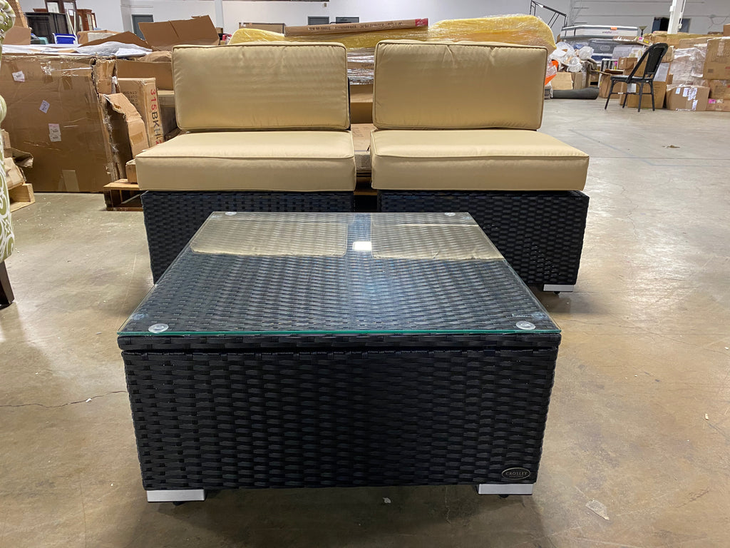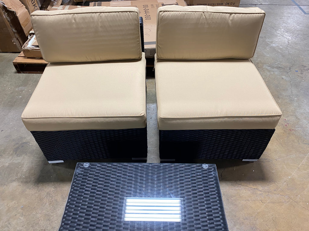 Items are in GREAT condition. This is an out-of-box and assembled item. Includes two armless chairs with cushions and a coffee table with glass top.