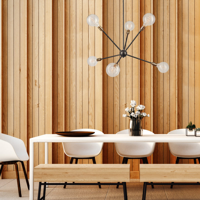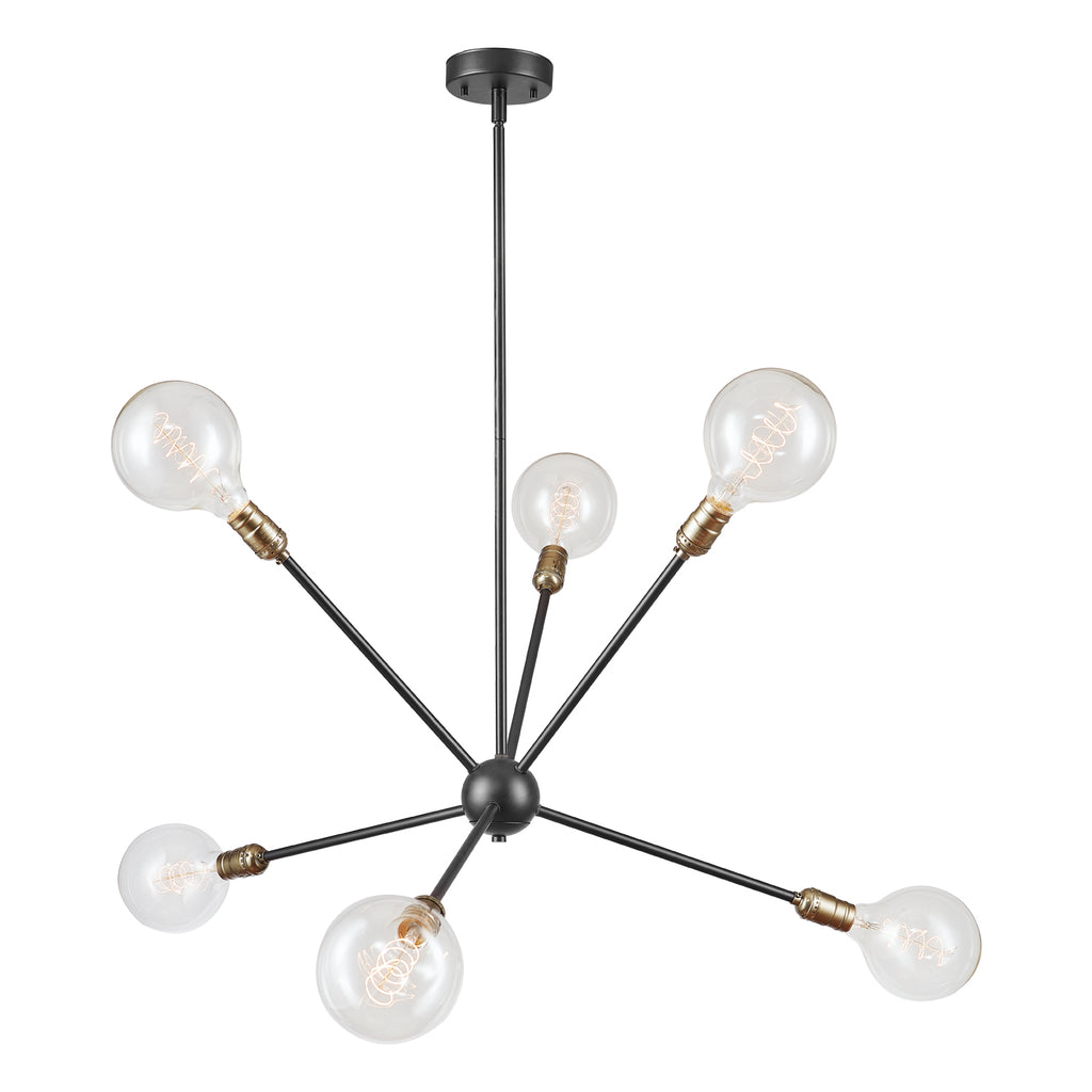 6-light sputnik chandelier in matte black with antique brass sockets. In-box item, requires assembly. (Previously opened box)