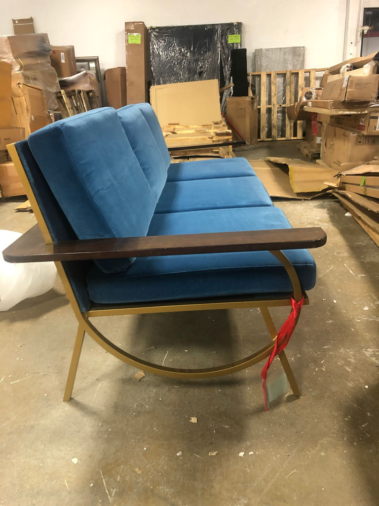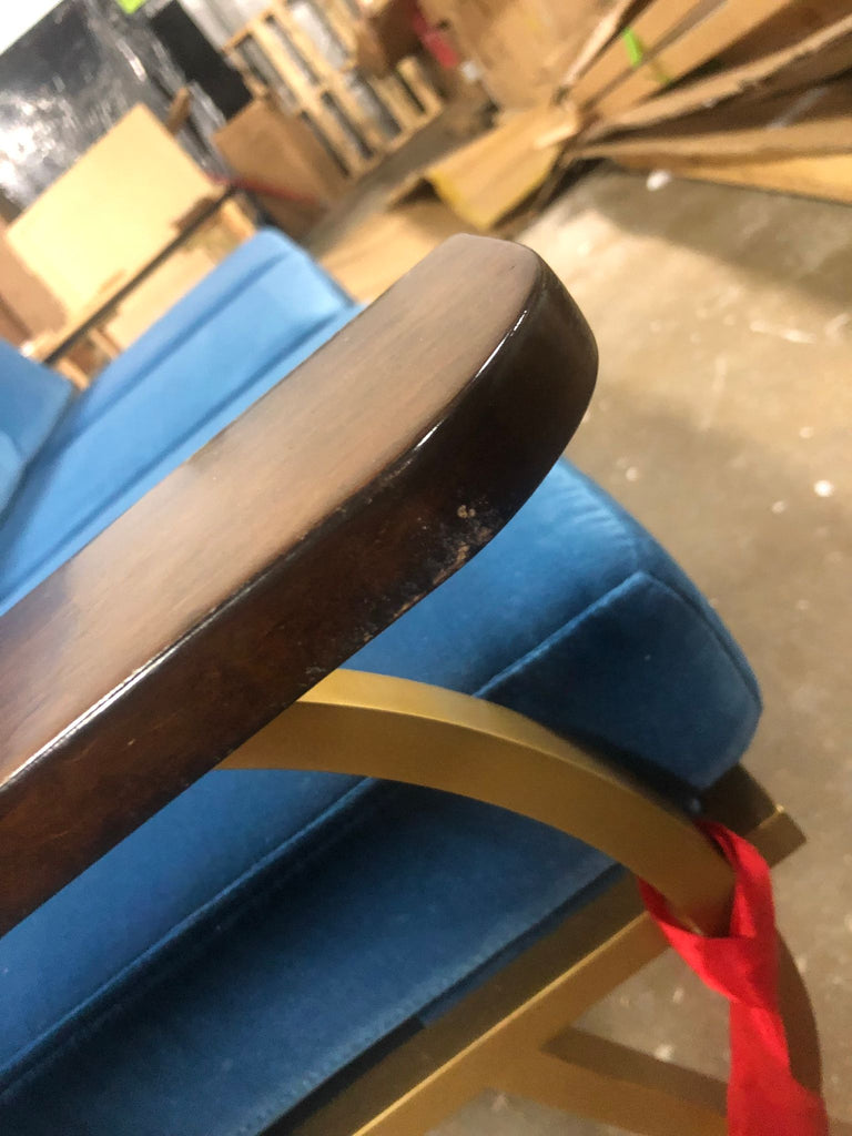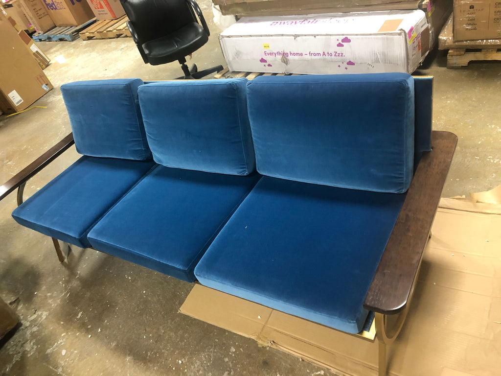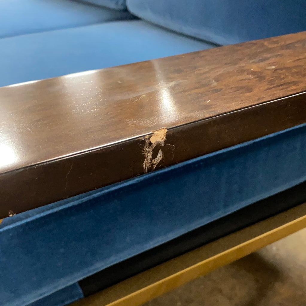 Good condition except missing levelers on the bottom of the sofa legs and some slight scratches to the left facing arm