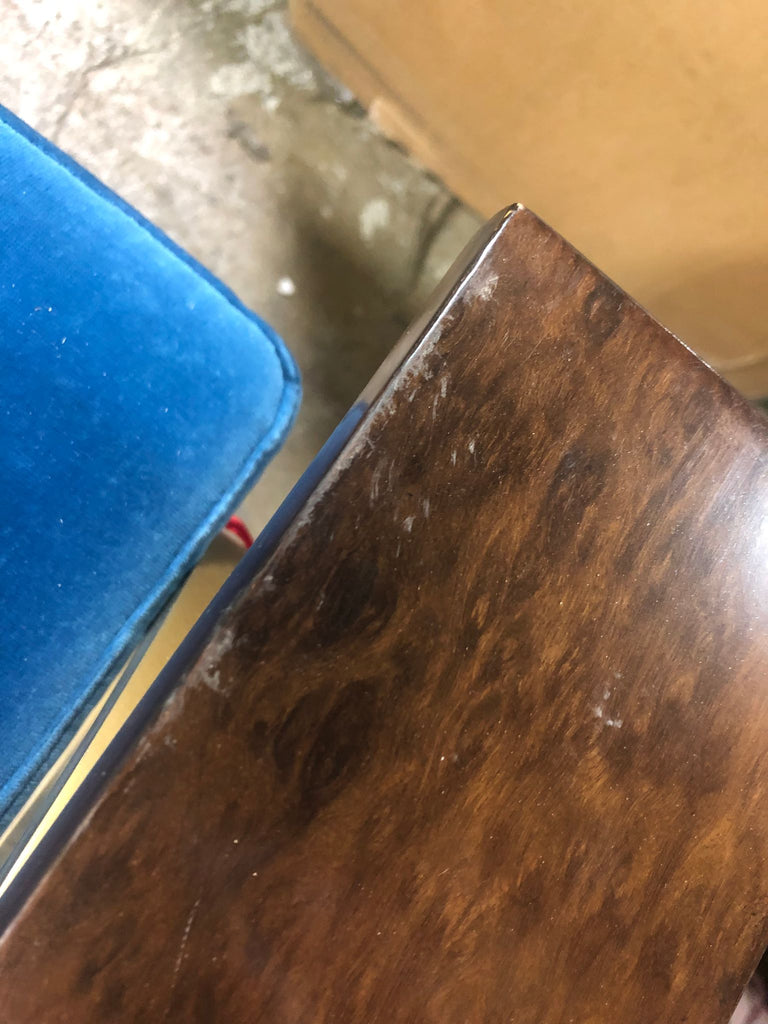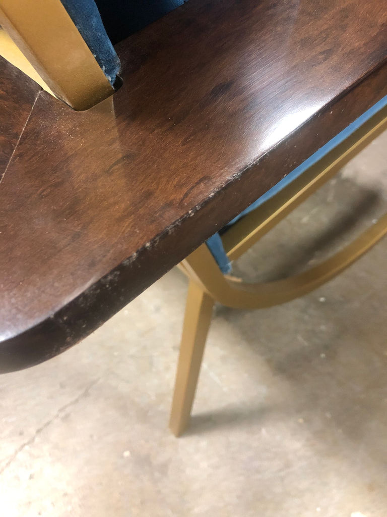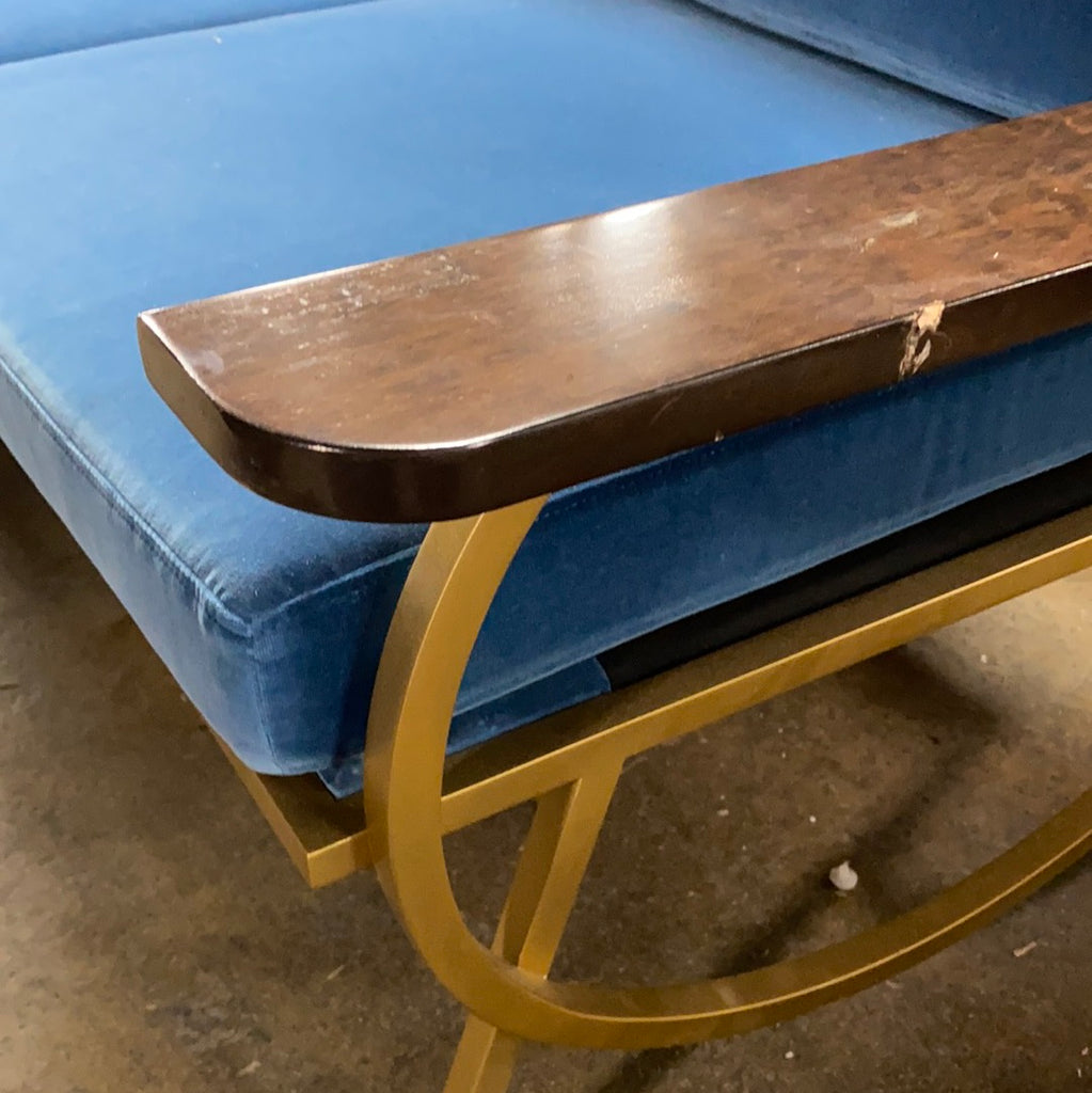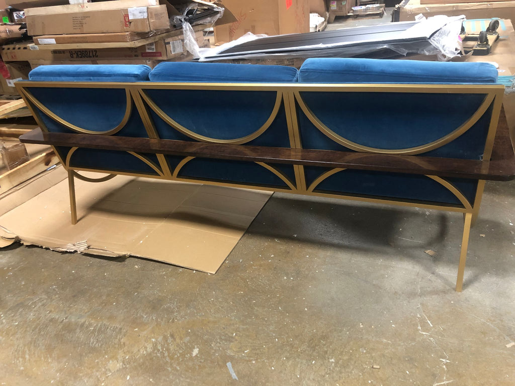 Good condition except missing levelers on the bottom of the sofa legs and some slight scratches to the left facing arm