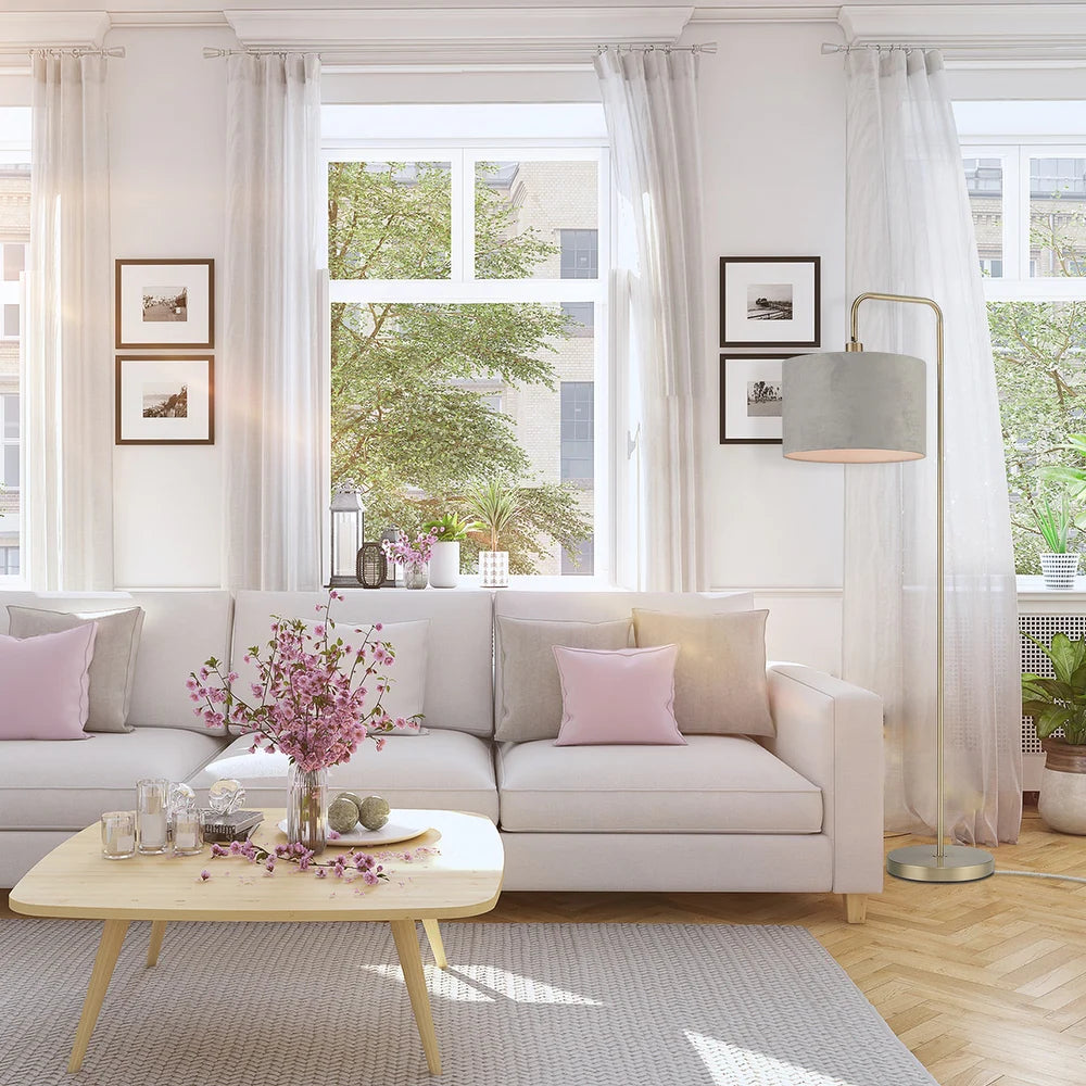 Barden Floor Lamp with Linen Shade - Brass Lamp w/Light Gray Velvet Shade