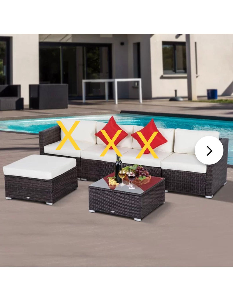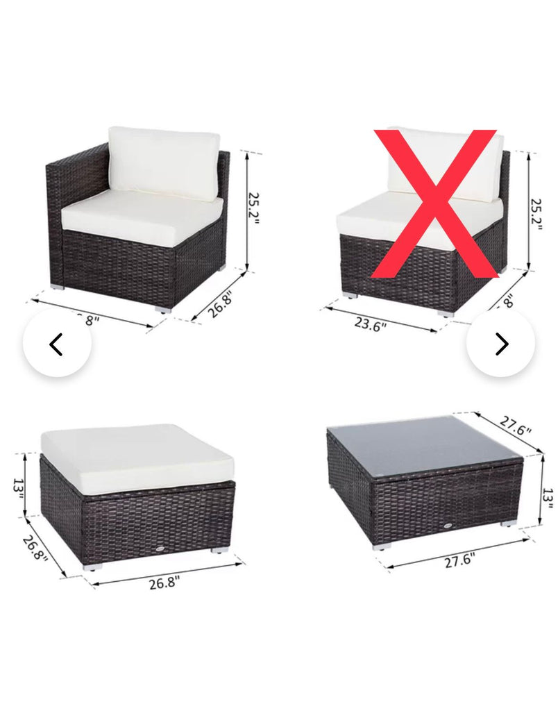 Open box, The color is Coffee/Cream, Box previously opened. In it's original box. Instructions and hardware included. ONLY comes with the ottoman w/cushion, the table w/glass top, and ONE corner chair w/cushions. Please see photo for reference on what is included. Assembly required.